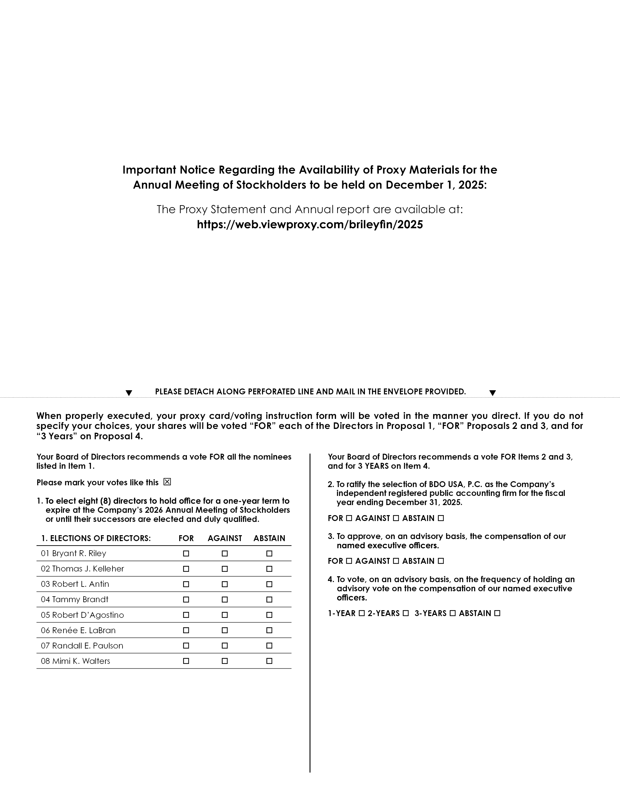 Important Notice Regarding the Availability of Proxy Materials for theAnnual Meeting of Stockholders to be held on December 1, 2025: The Proxy Statement and Annual report are available at:https://web.viewproxy.com/brileyfin/2025 PLEASE DETACH ALONG PERFORATED LINE AND MAIL IN THE ENVELOPE PROVIDED. When properly executed, your proxy card/voting instruction form will be voted in the manner you direct. If you do not specify your choices, your shares will be voted “FOR” each of the Directors in Proposal 1, “FOR” Proposals 2 and 3, and for “3 Years” on Proposal 4. Your Board of Directors recommends a vote FOR all the nominees listed in Item 1. Please mark your votes like this 1. To elect eight (8) directors to hold office for a one-year term to expire at the Company’s 2026 Annual Meeting of Stockholders or until their successors are elected and duly qualified. 1. ELECTIONS OF DIRECTORS: FOR AGAINST ABSTAIN 01 Bryant R. Riley 02 Thomas J. Kelleher 03 Robert L. Antin 04 Tammy Brandt 05 Robert D’Agostino 06 Renée E. LaBran 07 Randall E. Paulson 08 Mimi K. Walters Your Board of Directors recommends a vote FOR Items 2 and 3, and for 3 YEARS on Item 4. 2. To ratify the selection of BDO USA, P.C. as the Company’s independent registered public accounting firm for the fiscal year ending December 31, 2025. FOR AGAINST ABSTAIN 3. To approve, on an advisory basis, the compensation of our named executive officers. 4. To vote, on an advisory basis, on the frequency of holding an advisory vote on the compensation of our named executive officers. 1-YEAR 2-YEARS 3-YEARS ABSTAIN