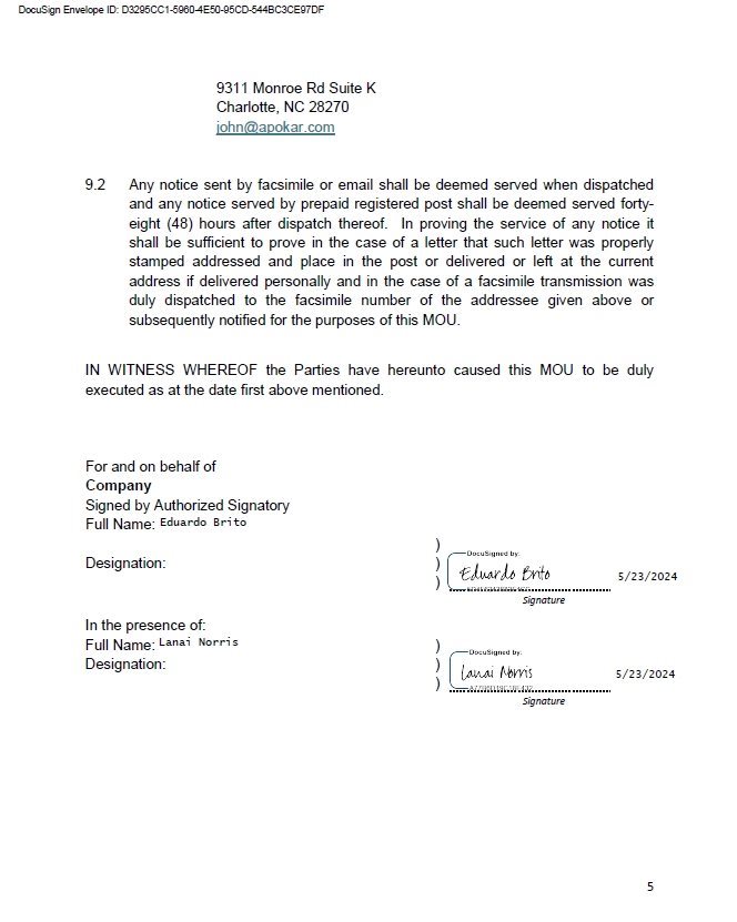 | Re: | Agreement to Formalize Memorandum of Understanding Dated May 21, 2024 (“MOU”) |