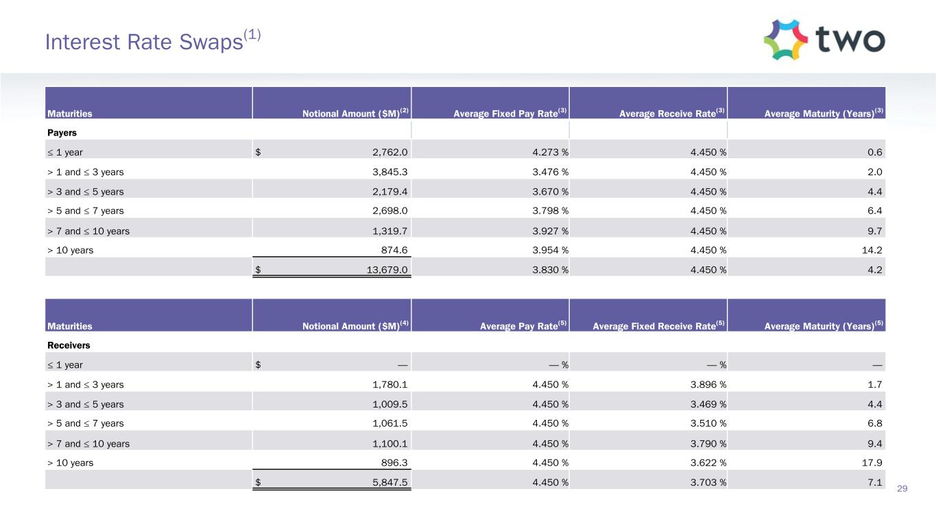 Note: Sensitivity data as of June 30, 2025. The above scenarios are provided for illustration purposes only and are not necessarily indicative of TWO’s financial condition and operating results, nor are they necessarily indicative of the financial condition or results of operations that may be expected for any future period or date. Book Value Exposure to Changes in Rates % Change in Common Book Value 2-Year Rate (basis points) 10-Year Rate (basis points) Agency P&I RMBS/TBA MSR/Agency IO RMBS(1) Other(2) Combined -25 0 Bull Steepener(3) 2.8 % 0.8 % (3.1) % 0.5 % 0 -25 Bull Flattener(4) 6.0 % (4.4) % (2.8) % (1.2) % -50 -50 Parallel Shift(5) 16.7 % (7.9) % (12.0) % (3.2) % -25 -25 Parallel Shift(5) 8.8 % (3.6) % (5.9) % (0.7) % 0 0 Base — % — % — % — % +25 +25 Parallel Shift(5) (9.7) % 3.2 % 5.8 % (0.8) % +50 +50 Parallel Shift(5) (20.2) % 5.8 % 11.3 % (3.1) % +25 0 Bear Flattener(3) (2.7) % (1.0) % 2.9 % (0.8) % 0 +25 Bear Steepener(4) (7.0) % 4.2 % 2.8 % — % Book Value Exposure to Current Coupon Spread(6) % Change in Common Book Value Parallel Shift in Spreads (basis points) Agency P&I RMBS/TBA MSR/Agency IO RMBS(1) Combined -25 8.4 % (4.3) % 4.1 % 0 — % — % — % +25 (9.4) % 3.9 % (5.5) % 19 Risk Positioning