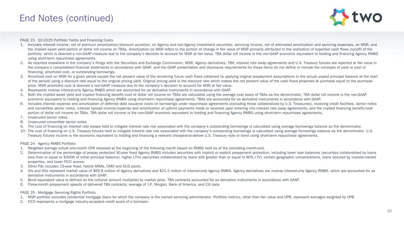 PAGE 18 - Effective Coupon Positioning 1. Represents UMBS TBA market prices as of June 30, 2025. 2. Specified pools include securities with implicit or explicit prepayment protection, including lower loan balances (securities collateralized by loans less than or equal to $300K of initial principal balance), higher LTVs (securities collateralized by loans with greater than or equal to 80% LTV), certain geographic concentrations, loans secured by investor-owned properties, and lower FICO scores, as well as securities without such protection, including large bank-serviced and others. 3. MSR/Agency IO represents an internally calculated exposure of a synthetic TBA position and the current coupon equivalents of our MSR, including the effect of unsettled MSR, and Agency IO RMBS. 4. Spreads generated with The Yield Book® Software using internally calibrated dials. PAGE 19 - Risk Positioning 1. MSR/Agency IO RMBS includes the effect of unsettled MSR. 2. Other includes all other derivative assets and liabilities and borrowings. Other excludes TBAs, which are included in the Agency P&I RMBS/TBA category. 3. Bull Steepener/Bear Flattener is a shift in short-term rates that represents estimated change in common book value for theoretical non-parallel shifts in the yield curve. Analysis uses a +/- 25 basis point shift in 2- year rates while holding long-term rates constant. 4. Bull Flattener/Bear Steepener is a shift in long-term rates that represents estimated change in common book value for theoretical non-parallel shifts in the yield curve. Analysis uses a +/- 25 basis point shift in 10-year rates while holding short-term rates constant. 5. Parallel shift represents estimated change in common book value for theoretical parallel shift in interest rates. 6. Book value exposure to current coupon spread represents estimated change in common book value for theoretical parallel shifts in spreads. PAGE 20 - Markets Overview 1. Source: Bloomberg, US MBS Index Monthly Treasury Excess Return data as of dates noted. 2. Source: Bloomberg, as of dates noted. 3. Source: J.P. Morgan DataQuery. 4. Monthly prepay speeds from National Association of Realtors via Bloomberg and RiskSpan as of June 30, 2025. MSR portfolio based on the prior month-end's principal balance of the loans underlying the company's MSR, increased for current month purchases and excluding unsettled MSR on loans for which the company is the named servicer as well as MSR on loans recently settled for which transfer to the company is not yet complete. PAGE 21 - Financial Performance 1. Economic return on book value is defined as the increase (decrease) in common book value from the beginning to the end of the given period, plus dividends declared to common stockholders in the period, divided by the common book value as of the beginning of the period. 2. Historical dividends may not be indicative of future dividend distributions. The company ultimately distributes dividends based on its taxable income per common share, not GAAP earnings. The annualized dividend yield on the company’s common stock is calculated based on the closing price of the last trading day of the relevant quarter. 32 End Notes (continued)