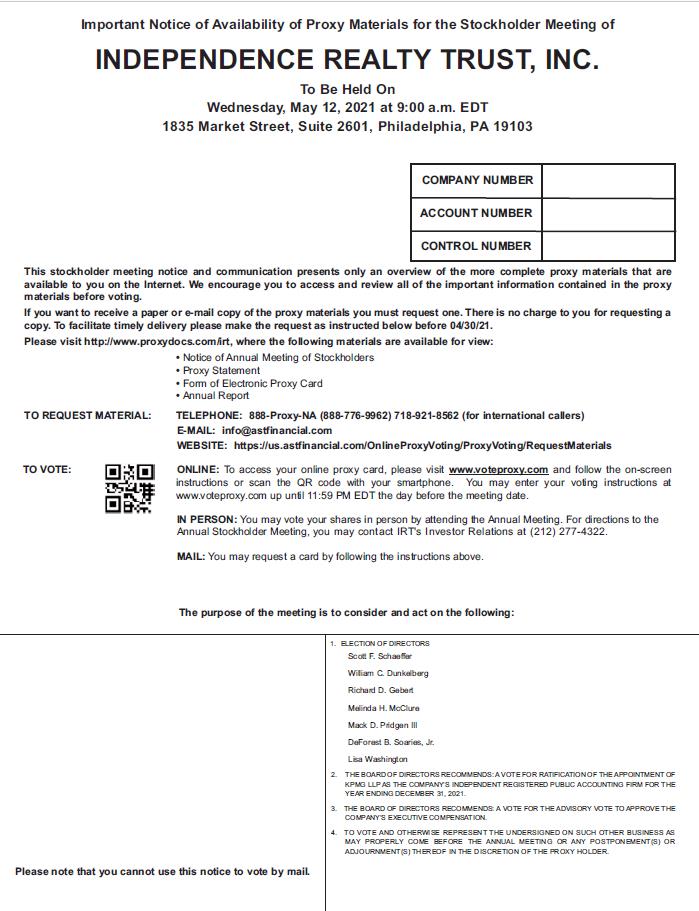 ImportantNoticeofAvailabilityofProxyMaterialsfortheStockholderMeetingof INDEPENDENCEREALTYTRUST,INC. ToBeHeldOn Wednesday,May12,2021at9:00a.m.EDT 1835MarketStreet, Suite 2601, Philadelphia, PA19103 COMPANYNUMBER ACCOUNTNUMBER CONTROLNUMBER This stockholder meeting notice and communication presents only an overview of the more complete proxy materials that are available to you on the Internet. We encourage you to access and review all of the important information contained in the proxy materialsbeforevoting. Ifyouwanttoreceiveapaperore-mailcopyoftheproxymaterialsyoumustrequestone.Thereisnochargetoyouforrequestinga copy.Tofacilitatetimelydeliverypleasemaketherequestasinstructedbelowbefore04/30/21. Pleasevisithttp://www.proxydocs.com/irt,wherethefollowingmaterialsareavailableforview: •Notice of Annual Meeting of Stockholders •Proxy Statement •Form of Electronic Proxy Card •Annual Report TOREQUESTMATERIAL: TELEPHONE: 888-Proxy-NA(888-776-9962)718-921-8562(forinternationalcallers) E-MAIL: info@astfinancial.com WEBSITE: https://us.astfinancial.com/OnlineProxyVoting/ProxyVoting/RequestMaterials TOVOTE: ONLINE: To access your online proxy card, please visit www.voteproxy.com and follow the on-screen instructions or scan the QR code with your smartphone. You may enter your voting instructions at www.voteproxy.com up until 11:59 PM EDT the day before the meeting date. INPERSON:You may vote your shares in person by attending the Annual Meeting. For directions to the Annual Stockholder Meeting, you may contact IRT's Investor Relations at (212) 277-4322. MAIL:You may request a card by following the instructions above. Thepurposeofthemeetingistoconsiderandactonthefollowing: 1. ELECTION OF DIRECTORS Scott F. Schaeffer William C. Dunkelberg Richard D. Gebert Melinda H. McClure Mack D. Pridgen III DeForest B. Soaries, Jr. Lisa Washington 2. THEBOARDOFDIRECTORSRECOMMENDS:AVOTEFORRATIFICATIONOFTHEAPPOINTMENTOF KPMG LLPAS THE COMPANY’S INDEPENDENT REGISTERED PUBLICACCOUNTING FIRM FOR THE YEAR ENDING DECEMBER 31, 2021. 3. THE BOARD OF DIRECTORS RECOMMENDS: A VOTE FOR TH