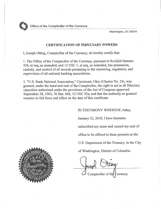 2. A copy of the certificate of authority of the Trustee to commence business, attached as Exhibit 2.