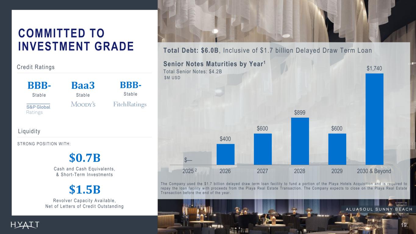 25 References SLIDE 19: COMMITTED TO INVESTMENT GRADE Total debt and liquidity figures as of September 30, 2025. 1 Chart excludes $59 million of variable rate mortgage loan, $51 million of variable rate term loan, $20 million of floating average rate loan, $22 million of finance lease obligations, $36 million of unamortized discounts and deferred financing fees as well as Hyatt’s revolving credit facility, which matures in 2027. At September 30, 2025, the Company had $1,497 million million of borrowing capacity available under our revolving credit facility, net of letters of credit outstanding. 2 The Company repaid the outstanding balance on the $450 million of 5.375% senior notes due 2025 at maturity during the nine months ended September 30, 2025. SLIDE 20: WHAT TO EXPECT IN 2025 & BEYOND1… 1 The Company’s outlook is based on a number of assumptions that are subject to change and many of which are outside the control of the Company. If actual results vary from these assumptions, the Company's expectations may change. There can be no assurance that the Company will achieve these results.