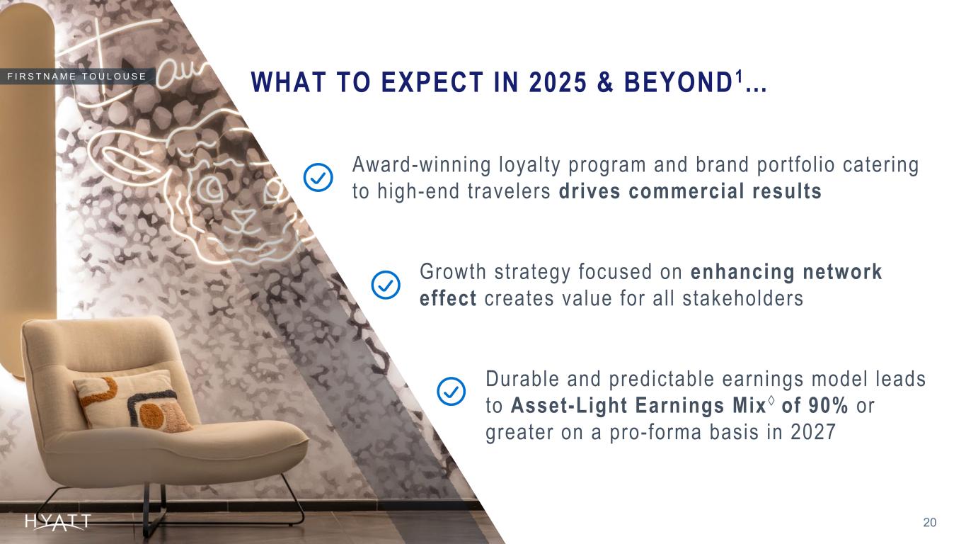 Disclaimers 2 Forward-Looking Statements Forward-Looking Statements in this presentation, which are not historical facts, are forward-looking statements within the meaning of the Private Securities Litigation Reform Act of 1995. These statements include statements about the Company's plans, strategies, outlook, the number of properties expected to open in the future, the expected timing and payment of dividends, the Company's 2025 outlook (including and excluding the Playa Hotels Acquisition), including the Company's expected System-wide Hotels RevPAR Growth, Net Rooms Growth, Net Income, Gross Fees, Adjusted G&A Expenses, Adjusted EBITDA, Capital Expenditures, and Adjusted Free Cash Flow, the planned Playa Real Estate Transaction and our ability to reduce our owned real estate asset base within targeted timeframes and at expected values, the Company's anticipated benefits from its expanded collaboration with Chase, planned credit card portfolio expansion, expected Adjusted EBITDA growth related to the economics of the credit card programs and similar third-party relationships, financial performance and prospective or future events and involve known and unknown risks that are difficult to predict. As a result, the Company's actual results, performance or achievements may differ materially from those expressed or implied by these forward-looking statements. In some cases, you can identify forward-looking statements by the use of words such as "may," "could," "expect," "intend," "plan," "seek," "anticipate," "believe," "estimate," "predict," "potential," "continue," "likely," "will," "would" and variations of these terms and similar expressions, or the negative of these terms or similar expressions. Such forward-looking statements are necessarily based upon estimates and assumptions that, while considered reasonable by the Company and the Company's management, are inherently uncertain. Factors that may cause actual results to differ materially from current expectations include, but are not limited to: the effects that the announcement or pendency of the planned Playa Real Estate Transaction may have on us, the occurrence of any event, change or other circumstance that could give rise to the termination of the share purchase agreement for the Playa Real Estate Transaction; the effects that any termination of the share purchase agreement for the Playa Real Estate Transaction may have on us or our business; failure to successfully complete the planned Playa Real Estate Transaction; legal proceedings that may be instituted related to the planned Playa Real Estate Transaction; significant and unexpected costs, charges or expenses related to the planned Playa Real Estate Transaction; inability to obtain regulatory or governmental approvals or to obtain such approvals on satisfactory conditions; general economic uncertainty in key global markets and a worsening of global economic conditions or low levels of economic growth; the rate and pace of economic recovery following economic downturns; global supply chain constraints and interruptions, rising costs of construction-related labor and materials, and increases in costs due to inflation or other factors that may not be fully offset by increases in revenues in our business; risks affecting the luxury, resort, and all-inclusive lodging segments; levels of spending in business, leisure, and group segments, as well as consumer confidence; declines in occupancy and average daily rate; limited visibility with respect to future bookings; loss of key personnel; domestic and international political and geopolitical conditions, including political or civil unrest or changes in trade policy; the impact of global tariff policies or regulations; hostilities, or fear of hostilities, including future terrorist attacks, that affect travel; travel-related accidents; natural or man-made disasters, weather and climate-related events, such as hurricanes, earthquakes, tsunamis, tornadoes, droughts, floods, wildfires, oil spills, nuclear incidents, and global outbreaks of pandemics or contagious diseases, or fear of such outbreaks; our ability to successfully achieve specified levels of operating profits at hotels that have performance tests or guarantees in favor of our third-party owners; the impact of hotel renovations and redevelopments; risks associated with our capital allocation plans, share repurchase program, and dividend payments, including a reduction in, or elimination or suspension of, repurchase activity or dividend payments; the seasonal and cyclical nature of the real estate and hospitality businesses; changes in distribution arrangements, such as through internet travel intermediaries; changes in the tastes and preferences of our customers; relationships with colleagues and labor unions and changes in labor laws; the financial condition of, and our relationships with, third-party owners, franchisees, and hospitality venture partners; the possible inability of third-party owners, franchisees, or development partners to access the capital necessary to fund current operations or implement our plans for growth; risks associated with potential acquisitions and dispositions and our ability to successfully integrate completed acquisitions with existing operations or realize anticipated synergies; failure to successfully complete proposed transactions, including the failure to satisfy closing conditions or obtain required approvals; our ability to successfully complete dispositions of certain of our owned real estate assets within targeted timeframes and at expected values; our ability to maintain effective internal control over financial reporting and disclosure controls and procedures; declines in the value of our real estate assets; unforeseen terminations of our management and hotel services agreements or franchise agreements; changes in federal, state, local, or foreign tax law; increases in interest rates, wages, and other operating costs; foreign exch
