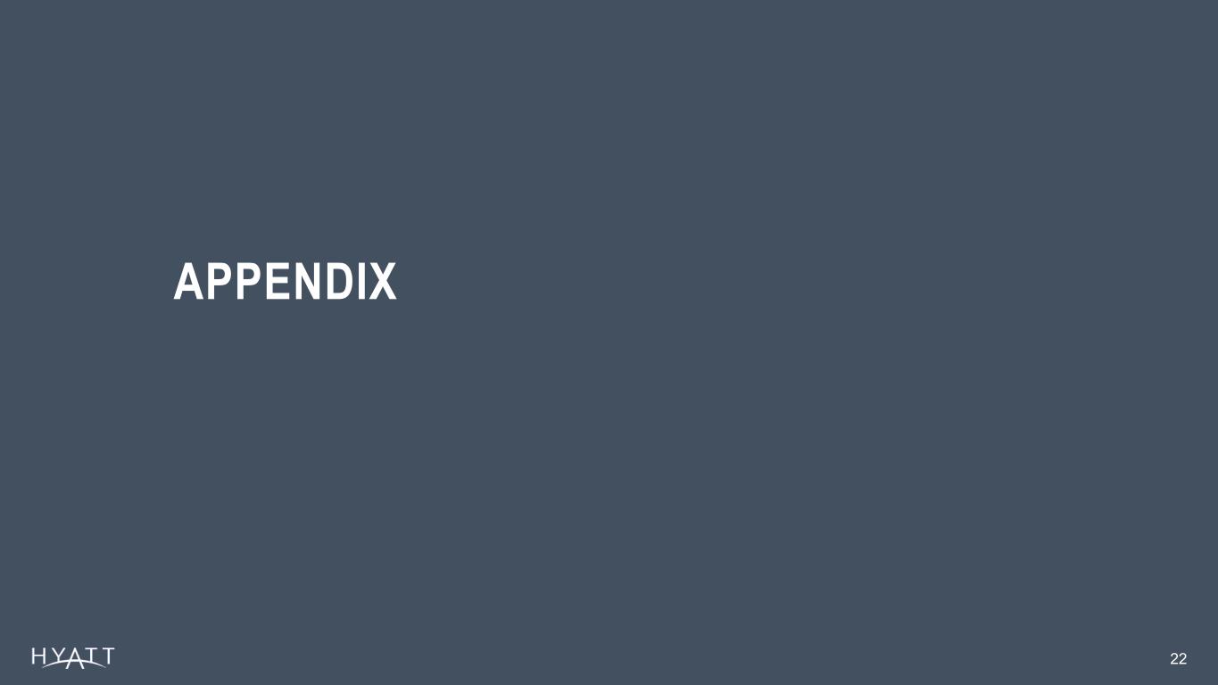 COMMITTED TO INVESTMENT GRADE 19 Credit Ratings BBB- Stab le BBB- Stab le Baa3 Stab le Liquidi ty $0.7B Cash and Cash Equ iva len ts , & Shor t -Term Inves tments $1.5B Revo lver Capac i ty Ava i lab le , Net o f Le t te rs o f Cred i t Outs tand ing STRONG POSIT ION WITH: A L U A S O U L S U N N Y B E A C H $— $400 $600 $899 $600 $1,740 2025 2026 2027 2028 2029 2030 & Beyond Source Notes: Footnotes: Total debt and liquidity figures as of September 30, 2025. 1 Chart excludes $59 million of variable rate mortgage loan, $51 million of variable rate term loan, $20 million of floating average rate loan, $22 million of finance lease obligations, $36 million of unamortized discounts and deferred financing fees as well as Hyatt’s revolving credit facility. At September 30, 2025, the Company had $1,497 million million of borrowing capacity available under our revolving credit facility, net of letters of credit outstanding. On October 30, 2025 Hyatt executed a new credit agreement for $1.5 billion which will expire in 2030. 2 The Company repaid the outstanding balance on the $450 million of 5.375% senior notes due 2025 at maturity during the nine months ended September 30, 2025. Total Debt: $6.0B , Inclusive of $1.7 bi l l ion Delayed Draw Term Loan Senior Notes Maturities by Year1 Total Senior Notes: $4.2B $M USD 2 The Company used the $1 .7 b i l l i on de layed draw te rm loan fac i l i t y to fund a por t ion o f the P laya Hote ls Acqu is i t ion and is requ i red to repay the loan fac i l i t y w i th p roceeds f rom the P laya Rea l Es ta te Transac t ion . The Company expec ts to c lose on the P laya Rea l Es ta te Transac t ion be fore the end o f the year .