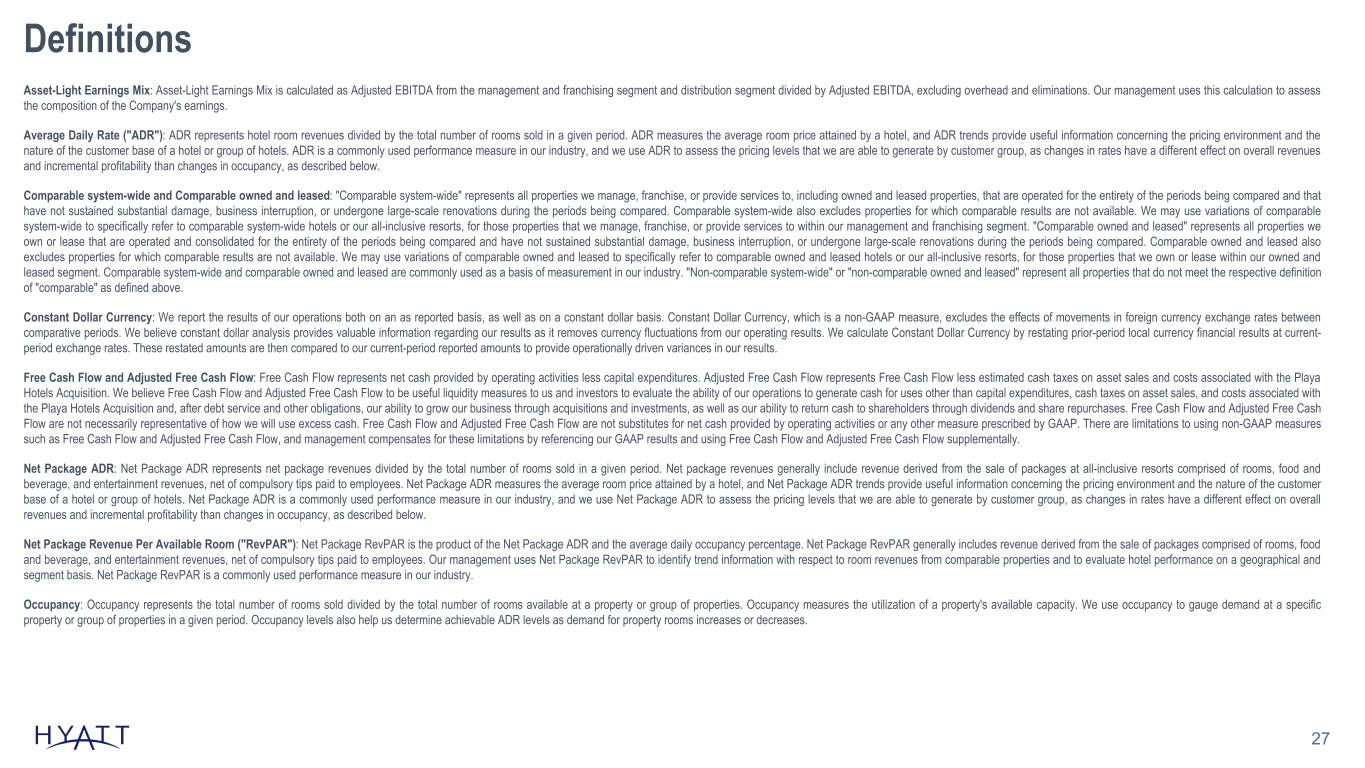27 Definitions Asset-Light Earnings Mix: Asset-Light Earnings Mix is calculated as Adjusted EBITDA from the management and franchising segment and distribution segment divided by Adjusted EBITDA, excluding overhead and eliminations. Our management uses this calculation to assess the composition of the Company's earnings. Average Daily Rate ("ADR"): ADR represents hotel room revenues divided by the total number of rooms sold in a given period. ADR measures the average room price attained by a hotel, and ADR trends provide useful information concerning the pricing environment and the nature of the customer base of a hotel or group of hotels. ADR is a commonly used performance measure in our industry, and we use ADR to assess the pricing levels that we are able to generate by customer group, as changes in rates have a different effect on overall revenues and incremental profitability than changes in occupancy, as described below. Comparable system-wide and Comparable owned and leased: "Comparable system-wide" represents all properties we manage, franchise, or provide services to, including owned and leased properties, that are operated for the entirety of the periods being compared and that have not sustained substantial damage, business interruption, or undergone large-scale renovations during the periods being compared. Comparable system-wide also excludes properties for which comparable results are not available. We may use variations of comparable system-wide to specifically refer to comparable system-wide hotels or our all-inclusive resorts, for those properties that we manage, franchise, or provide services to within our management and franchising segment. "Comparable owned and leased" represents all properties we own or lease that are operated and consolidated for the entirety of the periods being compared and have not sustained substantial damage, business interruption, or undergone large-scale renovations during the periods being compared. Comparable owned and leased also excludes properties for which comparable results are not available. We may use variations of comparable owned and leased to specifically refer to comparable owned and leased hotels or our all-inclusive resorts, for those properties that we own or lease within our owned and leased segment. Comparable system-wide and comparable owned and leased are commonly used as a basis of measurement in our industry. "Non-comparable system-wide" or "non-comparable owned and leased" represent all properties that do not meet the respective definition of "comparable" as defined above. Constant Dollar Currency: We report the results of our operations both on an as reported basis, as well as on a constant dollar basis. Constant Dollar Currency, which is a non-GAAP measure, excludes the effects of movements in foreign currency exchange rates between comparative periods. We believe constant dollar analysis provides valuable information regarding our results as it removes currency fluctuations from our operating results. We calculate Constant Dollar Currency by restating prior-period local currency financial results at current- period exchange rates. These restated amounts are then compared to our current-period reported amounts to provide operationally driven variances in our results. Free Cash Flow and Adjusted Free Cash Flow: Free Cash Flow represents net cash provided by operating activities less capital expenditures. Adjusted Free Cash Flow represents Free Cash Flow less estimated cash taxes on asset sales and costs associated with the Playa Hotels Acquisition. We believe Free Cash Flow and Adjusted Free Cash Flow to be useful liquidity measures to us and investors to evaluate the ability of our operations to generate cash for uses other than capital expenditures, cash taxes on asset sales, and costs associated with the Playa Hotels Acquisition and, after debt service and other obligations, our ability to grow our business through acquisitions and investments, as well as our ability to return cash to shareholders through dividends and share repurchases. Free Cash Flow and Adjusted Free Cash Flow are not necessarily representative of how we will use excess cash. Free Cash Flow and Adjusted Free Cash Flow are not substitutes for net cash provided by operating activities or any other measure prescribed by GAAP. There are limitations to using non-GAAP measures such as Free Cash Flow and Adjusted Free Cash Flow, and management compensates for these limitations by referencing our GAAP results and using Free Cash Flow and Adjusted Free Cash Flow supplementally. Net Package ADR: Net Package ADR represents net package revenues divided by the total number of rooms sold in a given period. Net package revenues generally include revenue derived from the sale of packages at all-inclusive resorts comprised of rooms, food and beverage, and entertainment revenues, net of compulsory tips paid to employees. Net Package ADR measures the average room price attained by a hotel, and Net Package ADR trends provide useful information concerning the pricing environment and the nature of the customer base of a hotel or group of hotels. Net Package ADR is a commonly used performance measure in our industry, and we use Net Package ADR to assess the pricing levels that we are able to generate by customer group, as changes in rates have a different effect on overall revenues and incremental profitability than changes in occupancy, as described below. Net Package Revenue Per Available Room ("RevPAR"): Net Package RevPAR is the product of the Net Package ADR and the average daily occupancy percentage. Net Package RevPAR generally includes revenue derived from the sale of packages comprised of rooms, food and beverage, and entertainment revenues, net of compulsory tips paid to employees. Our management uses Net Package RevPAR to identify trend information with respect to room revenues from comparable properties and to evaluate hotel performance on a geographical an