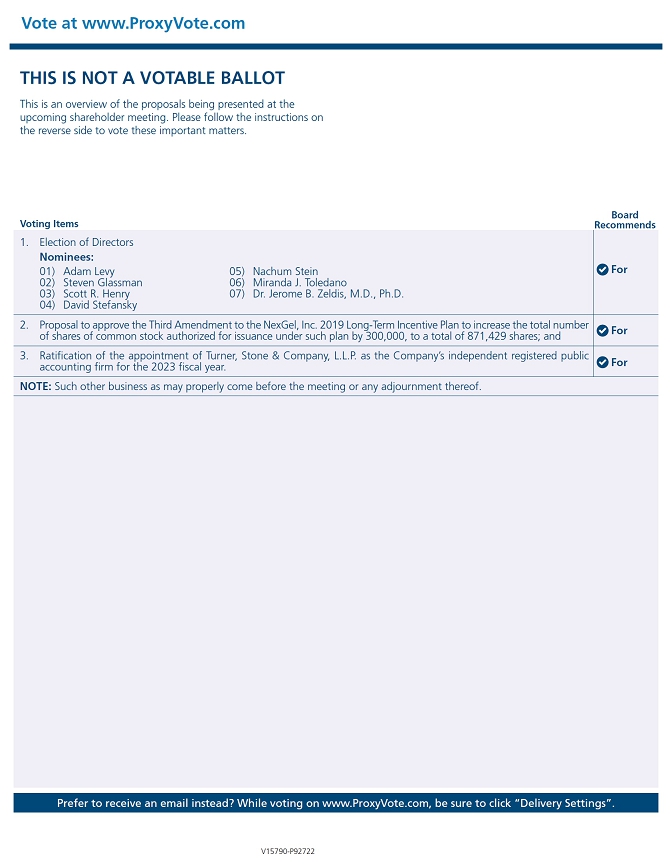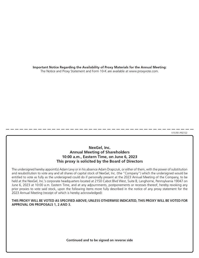 You are cordially invited to attend the Annual Meeting of Stockholders of NexGel, Inc. to be held at 10:00 a.m., Eastern Time, on June 6, 2023, at our corporate headquarters located at 2150 Cabot Blvd West, Suite B, Langhorne, Pennsylvania 19047.