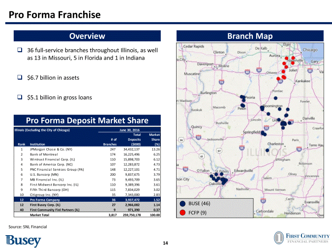 Attractive Operating Markets First Community’s operating markets provide attractive demographic trends which support quality growth opportunities for the pro forma franchise should continue to $79,868 38.2% $80,000 8.0% 40.0% 6.3% 5.9% 5.6% $54,316 $60,000 6.0% 30.0% $40,000 4.0% 20.0% $20,000 2.0% 10.0% $- 0.0% 0.0% FCFP BUSE Illinois St. Louis MSA FCFP BUSE Illinois St. Louis MSA FCFP BUSE Illinois St. Louis MSA First Community’ score markets demonstrate attractive economic, commercial and demographic characteristics that provide a compelling opportunity for First Busey to extend its franchise FCFP’s footprint has a median household income almost 50% higher than that of BUSE’s footprint and 35% higher than the State of Illinois Nearly 70,000 businesses operate in FCFP’s operating markets The counties FCFP serves are, on average, 100%(1) larger than those of BUSE and serve 103%(2) more businesses Source: SNL Financial Note: Demographic statistics for BUSE and FCFP in the bar charts above are based on deposit-weighted county averages as of 6/30/2016 (1) Based on average population in counties served by BUSE of 278,957 and in the counties served by FCFP of 558,984 (2) Based on average number of businesses in counties served by BUSE of 11,457 and in the counties served by FCFP of 23,261 13 27.6%25.8% 23.2% 7.2% $60,950 $59,287 % of Households with Income > $100K 5-Year Household Income Growth Median Household Income