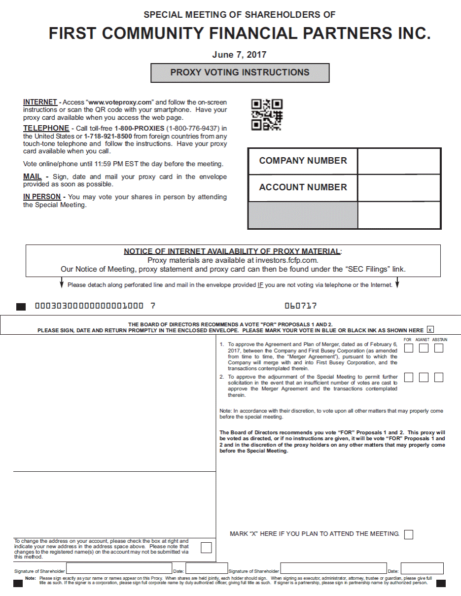 special meeTinG of shareholders of firsT commUniTY financial June 7, 2017 parTners inc. inTerneT - Access “www.voteproxy.com” and follow the on-screen instructions or scan the QR code with your smartphone. Have your proxy card available when you access the web page. Telephone - Call toll-free 1-800-proXies (1-800-776-9437) in the United States or 1-718-921-8500 from foreign countries from any touch-tone telephone and follow the instructions. Have your proxy card available when you call. Vote online/phone until 11:59 PMESTthe day before the meeting. mail - Sign, date and mail your proxy card in the envelope provided as soon as possible. inperson - You may vote your shares in person by attending the Special Meeting. Please detach along perforated line and mail in the envelope provided IF you are not voting via telephone or the Internet. 00030300000000001000 7 060717 changes to the registered name(s) on the account may not be submitted via note: Please sign exactly as your name or names appear on this Proxy. When shares are held jointly, each holder should sign. When signing as executor, administrator, attorney, trustee or guardian, please give full title as such. If the signer is a corporation, please sign full corporate name by duly authorized officer, giving full title as such. If signer is a partnership, please sign in partnership name by authorized person. The Board of direcTors recommends a voTe "for" proposals 1 and 2. please siGn, daTe and reTUrn prompTlY in The enclosed envelope. please marK YoUr voTe in BlUe or BlacK inK as shoWn here x FOR AGAINST ABSTAIN 1. To approve the Agreement and Plan of Merger, dated as of February 6, 2017, between the Company and First Busey Corporation (as amended from time to time, the “Merger Agreement”), pursuant to which the Company will merge with and into First Busey Corporation, and the transactions contemplated therein. 2. To approve the adjournment of the Special Meeting to permit further solicitation in the event that an insufficient number of votes are cast to approve the Merger Agreement and the transactions contemplated therein. Note: In accordance with their discretion, to vote upon all other matters that may properly come before the special meeting. The Board of directors recommends you vote “for” proposals 1 and 2. This proxy will be voted as directed, or if no instructions are given, it will be vote “for” proposals 1 and 2 and in the discretion of the proxy holders on any other matters that may properly come before the special meeting. MARK“X” HERE IF YOU PLAN TO ATTEND THE MEETING. To change the address on your account, please check the box at right and indicate your new address in the address space above. Please note that this method. Signature of Shareholder Date: Signature of ShareholderDate: noTice of inTerneT availaBiliTY of proXY maTerial: Proxy materials are available at investors.fcfp.com. Our Notice of Meeting, proxy statement and proxy card can then be found under the “SEC Filings” link. companY nUmBer accoUnT nUmBer proXY voTinG insTrUcTions