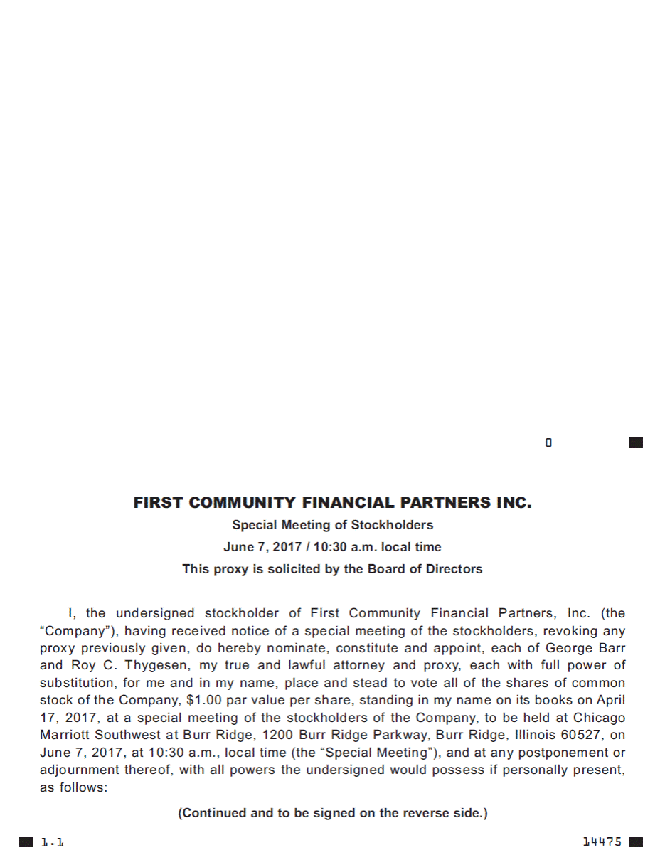 - 0 FIRST COMMUNITY FINANCIAL PARTNERS INC. special meeting of stockholders June 7, 2017 / 10:30 a.m. local time This proxy is solicited by the Board of directors I, the undersigned stockholder of First Community Financial Partners, Inc. (the “Company”), having received notice of a special meeting of the stockholders, revoking any proxy previously given, do hereby nominate, constitute and appoint, each of George Barr and Roy C. Thygesen, my true and lawful attorney and proxy, each with full power of substitution, for me and in my name, place and stead to vote all of the shares of common stock of the Company, $1.00 par value per share, standing in my name on its books on April 17, 2017, at a special meeting of the stockholders of the Company, to be held at Chicago Marriott Southwest at Burr Ridge, 1200 Burr Ridge Parkway, Burr Ridge, Illinois 60527, on June 7, 2017, at 10:30 a.m., local time (the “Special Meeting”), and at any postponement or adjournment thereof, with all powers the undersigned would possess if personally present, as follows: (continued and to be signed on the reverse side.) 14475 1.1