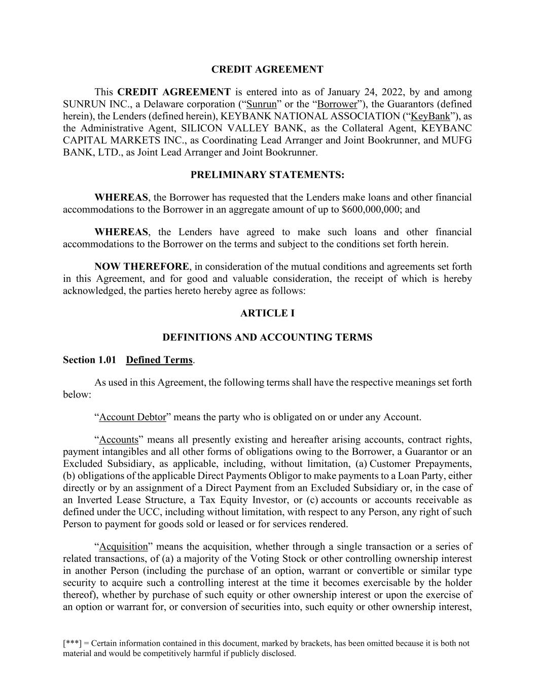 [***] = Certain information contained in this document, marked by brackets, has been omitted because it is both not material and would be competitively harmful if publicly disclosed. CREDIT AGREEMENT This CREDIT AGREEMENT is entered into as of January 24, 2022, by and among SUNRUN INC., a Delaware corporation (“Sunrun” or the “Borrower”), the Guarantors (defined herein), the Lenders (defined herein), KEYBANK NATIONAL ASSOCIATION (“KeyBank”), as the Administrative Agent, SILICON VALLEY BANK, as the Collateral Agent, KEYBANC CAPITAL MARKETS INC., as Coordinating Lead Arranger and Joint Bookrunner, and MUFG BANK, LTD., as Joint Lead Arranger and Joint Bookrunner. PRELIMINARY STATEMENTS: WHEREAS, the Borrower has requested that the Lenders make loans and other financial accommodations to the Borrower in an aggregate amount of up to $600,000,000; and WHEREAS, the Lenders have agreed to make such loans and other financial accommodations to the Borrower on the terms and subject to the conditions set forth herein. NOW THEREFORE, in consideration of the mutual conditions and agreements set forth in this Agreement, and for good and valuable consideration, the receipt of which is hereby acknowledged, the parties hereto hereby agree as follows: ARTICLE I DEFINITIONS AND ACCOUNTING TERMS Section 1.01 Defined Terms. As used in this Agreement, the following terms shall have the respective meanings set forth below: “Account Debtor” means the party who is obligated on or under any Account. “Accounts” means all presently existing and hereafter arising accounts, contract rights, payment intangibles and all other forms of obligations owing to the Borrower, a Guarantor or an Excluded Subsidiary, as applicable, including, without limitation, (a) Customer Prepayments, (b) obligations of the applicable Direct Payments Obligor to make payments to a Loan Party, either directly or by an assignment of a Direct Payment from an Excluded Subsidiary or, in the case of an Inverted Lease Structure, a Tax Equity Investor, or (c) accounts or accounts receivable as defined under the UCC, including without limitation, with respect to any Person, any right of such Person to payment for goods sold or leased or for services rendered. “Acquisition” means the acquisition, whether through a single transaction or a series of related transactions, of (a) a majority of the Voting Stock or other controlling ownership interest in another Person (including the purchase of an option, warrant or convertible or similar type security to acquire such a controlling interest at the time it becomes exercisable by the holder thereof), whether by purchase of such equity or other ownership interest or upon the exercise of an option or warrant for, or conversion of securities into, such equity or other ownership interest,