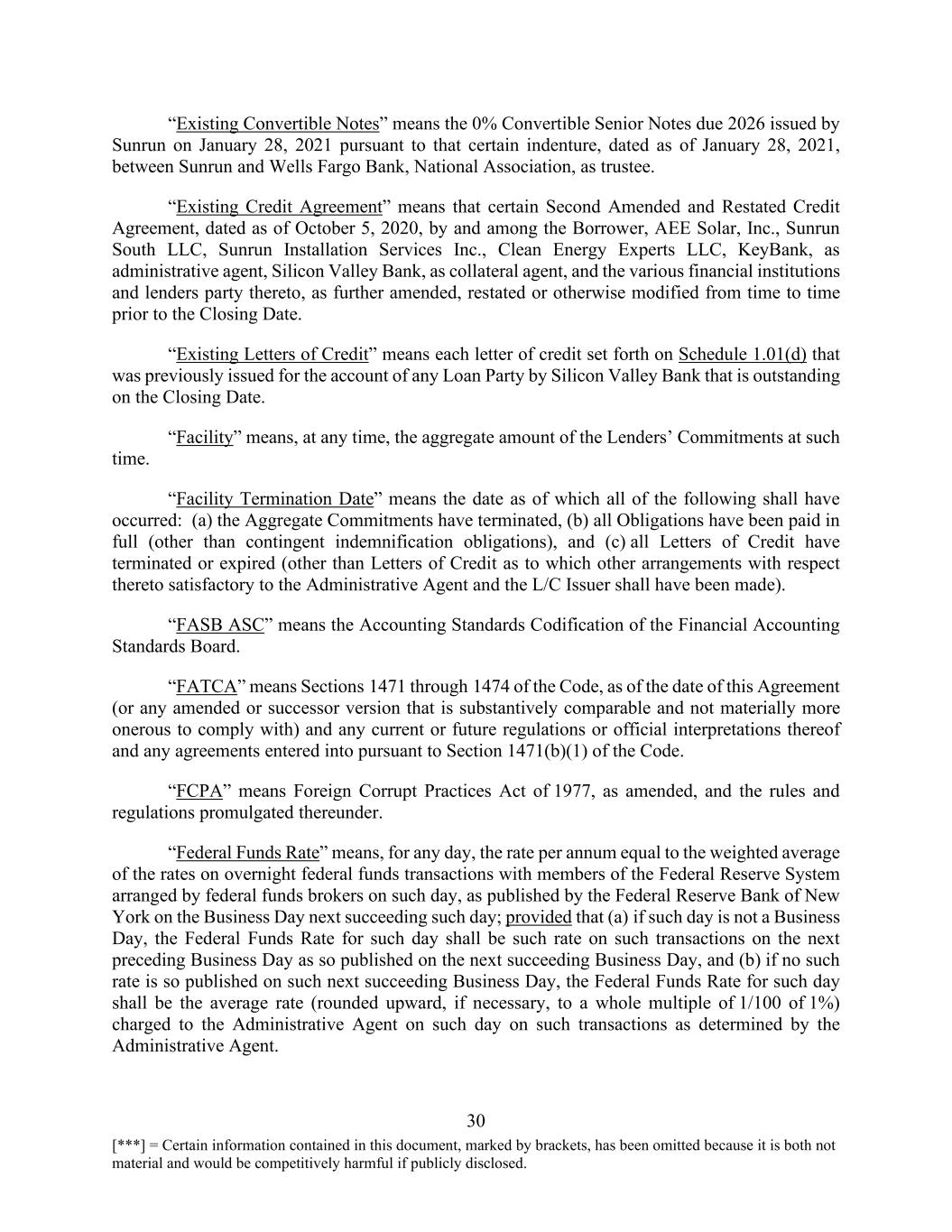 30 [***] = Certain information contained in this document, marked by brackets, has been omitted because it is both not material and would be competitively harmful if publicly disclosed. “Existing Convertible Notes” means the 0% Convertible Senior Notes due 2026 issued by Sunrun on January 28, 2021 pursuant to that certain indenture, dated as of January 28, 2021, between Sunrun and Wells Fargo Bank, National Association, as trustee. “Existing Credit Agreement” means that certain Second Amended and Restated Credit Agreement, dated as of October 5, 2020, by and among the Borrower, AEE Solar, Inc., Sunrun South LLC, Sunrun Installation Services Inc., Clean Energy Experts LLC, KeyBank, as administrative agent, Silicon Valley Bank, as collateral agent, and the various financial institutions and lenders party thereto, as further amended, restated or otherwise modified from time to time prior to the Closing Date. “Existing Letters of Credit” means each letter of credit set forth on Schedule 1.01(d) that was previously issued for the account of any Loan Party by Silicon Valley Bank that is outstanding on the Closing Date. “Facility” means, at any time, the aggregate amount of the Lenders’ Commitments at such time. “Facility Termination Date” means the date as of which all of the following shall have occurred: (a) the Aggregate Commitments have terminated, (b) all Obligations have been paid in full (other than contingent indemnification obligations), and (c) all Letters of Credit have terminated or expired (other than Letters of Credit as to which other arrangements with respect thereto satisfactory to the Administrative Agent and the L/C Issuer shall have been made). “FASB ASC” means the Accounting Standards Codification of the Financial Accounting Standards Board. “FATCA” means Sections 1471 through 1474 of the Code, as of the date of this Agreement (or any amended or successor version that is substantively comparable and not materially more onerous to comply with) and any current or future regulations or official interpretations thereof and any agreements entered into pursuant to Section 1471(b)(1) of the Code. “FCPA” means Foreign Corrupt Practices Act of 1977, as amended, and the rules and regulations promulgated thereunder. “Federal Funds Rate” means, for any day, the rate per annum equal to the weighted average of the rates on overnight federal funds transactions with members of the Federal Reserve System arranged by federal funds brokers on such day, as published by the Federal Reserve Bank of New York on the Business Day next succeeding such day; provided that (a) if such day is not a Business Day, the Federal Funds Rate for such day shall be such rate on such transactions on the next preceding Business Day as so published on the next succeeding Business Day, and (b) if no such rate is so published on such next succeeding Business Day, the Federal Funds Rate for such day shall be the average rate (rounded upward, if necessary, to a whole multiple of 1/100 of 1%) charged to the Administrative Agent on such day on such transactions as determined by the Administrative Agent.