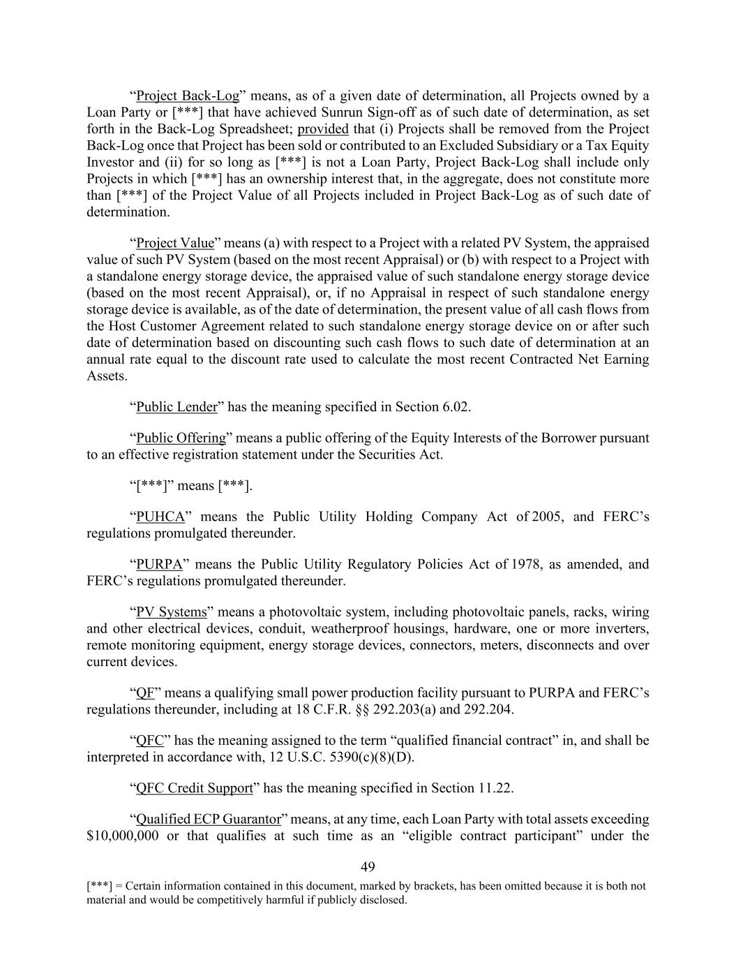 49 [***] = Certain information contained in this document, marked by brackets, has been omitted because it is both not material and would be competitively harmful if publicly disclosed. “Project Back-Log” means, as of a given date of determination, all Projects owned by a Loan Party or [***] that have achieved Sunrun Sign-off as of such date of determination, as set forth in the Back-Log Spreadsheet; provided that (i) Projects shall be removed from the Project Back-Log once that Project has been sold or contributed to an Excluded Subsidiary or a Tax Equity Investor and (ii) for so long as [***] is not a Loan Party, Project Back-Log shall include only Projects in which [***] has an ownership interest that, in the aggregate, does not constitute more than [***] of the Project Value of all Projects included in Project Back-Log as of such date of determination. “Project Value” means (a) with respect to a Project with a related PV System, the appraised value of such PV System (based on the most recent Appraisal) or (b) with respect to a Project with a standalone energy storage device, the appraised value of such standalone energy storage device (based on the most recent Appraisal), or, if no Appraisal in respect of such standalone energy storage device is available, as of the date of determination, the present value of all cash flows from the Host Customer Agreement related to such standalone energy storage device on or after such date of determination based on discounting such cash flows to such date of determination at an annual rate equal to the discount rate used to calculate the most recent Contracted Net Earning Assets. “Public Lender” has the meaning specified in Section 6.02. “Public Offering” means a public offering of the Equity Interests of the Borrower pursuant to an effective registration statement under the Securities Act. “[***]” means [***]. “PUHCA” means the Public Utility Holding Company Act of 2005, and FERC’s regulations promulgated thereunder. “PURPA” means the Public Utility Regulatory Policies Act of 1978, as amended, and FERC’s regulations promulgated thereunder. “PV Systems” means a photovoltaic system, including photovoltaic panels, racks, wiring and other electrical devices, conduit, weatherproof housings, hardware, one or more inverters, remote monitoring equipment, energy storage devices, connectors, meters, disconnects and over current devices. “QF” means a qualifying small power production facility pursuant to PURPA and FERC’s regulations thereunder, including at 18 C.F.R. §§ 292.203(a) and 292.204. “QFC” has the meaning assigned to the term “qualified financial contract” in, and shall be interpreted in accordance with, 12 U.S.C. 5390(c)(8)(D). “QFC Credit Support” has the meaning specified in Section 11.22. “Qualified ECP Guarantor” means, at any time, each Loan Party with total assets exceeding $10,000,000 or that qualifies at such time as an “eligible contract participant” under the