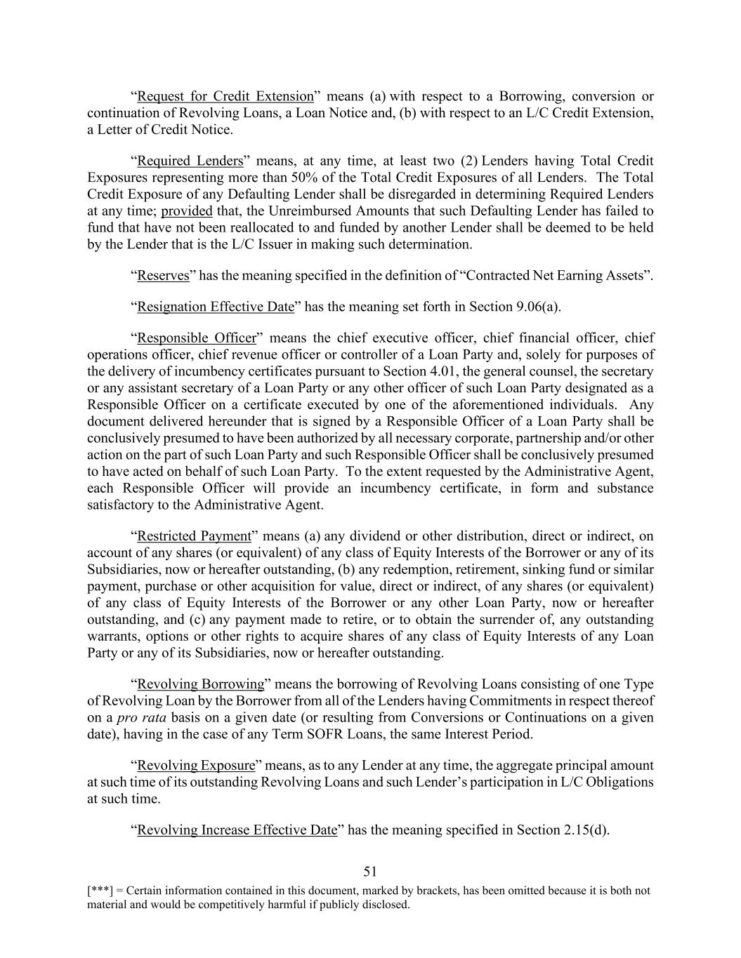 51 [***] = Certain information contained in this document, marked by brackets, has been omitted because it is both not material and would be competitively harmful if publicly disclosed. “Request for Credit Extension” means (a) with respect to a Borrowing, conversion or continuation of Revolving Loans, a Loan Notice and, (b) with respect to an L/C Credit Extension, a Letter of Credit Notice. “Required Lenders” means, at any time, at least two (2) Lenders having Total Credit Exposures representing more than 50% of the Total Credit Exposures of all Lenders. The Total Credit Exposure of any Defaulting Lender shall be disregarded in determining Required Lenders at any time; provided that, the Unreimbursed Amounts that such Defaulting Lender has failed to fund that have not been reallocated to and funded by another Lender shall be deemed to be held by the Lender that is the L/C Issuer in making such determination. “Reserves” has the meaning specified in the definition of “Contracted Net Earning Assets”. “Resignation Effective Date” has the meaning set forth in Section 9.06(a). “Responsible Officer” means the chief executive officer, chief financial officer, chief operations officer, chief revenue officer or controller of a Loan Party and, solely for purposes of the delivery of incumbency certificates pursuant to Section 4.01, the general counsel, the secretary or any assistant secretary of a Loan Party or any other officer of such Loan Party designated as a Responsible Officer on a certificate executed by one of the aforementioned individuals. Any document delivered hereunder that is signed by a Responsible Officer of a Loan Party shall be conclusively presumed to have been authorized by all necessary corporate, partnership and/or other action on the part of such Loan Party and such Responsible Officer shall be conclusively presumed to have acted on behalf of such Loan Party. To the extent requested by the Administrative Agent, each Responsible Officer will provide an incumbency certificate, in form and substance satisfactory to the Administrative Agent. “Restricted Payment” means (a) any dividend or other distribution, direct or indirect, on account of any shares (or equivalent) of any class of Equity Interests of the Borrower or any of its Subsidiaries, now or hereafter outstanding, (b) any redemption, retirement, sinking fund or similar payment, purchase or other acquisition for value, direct or indirect, of any shares (or equivalent) of any class of Equity Interests of the Borrower or any other Loan Party, now or hereafter outstanding, and (c) any payment made to retire, or to obtain the surrender of, any outstanding warrants, options or other rights to acquire shares of any class of Equity Interests of any Loan Party or any of its Subsidiaries, now or hereafter outstanding. “Revolving Borrowing” means the borrowing of Revolving Loans consisting of one Type of Revolving Loan by the Borrower from all of the Lenders having Commitments in respect thereof on a pro rata basis on a given date (or resulting from Conversions or Continuations on a given date), having in the case of any Term SOFR Loans, the same Interest Period. “Revolving Exposure” means, as to any Lender at any time, the aggregate principal amount at such time of its outstanding Revolving Loans and such Lender’s participation in L/C Obligations at such time. “Revolving Increase Effective Date” has the meaning specified in Section 2.15(d).