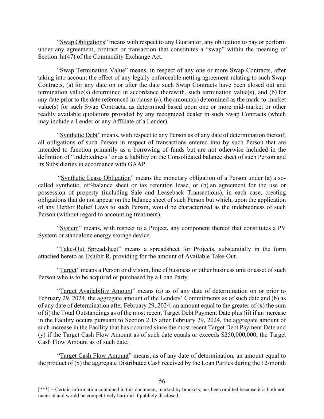 56 [***] = Certain information contained in this document, marked by brackets, has been omitted because it is both not material and would be competitively harmful if publicly disclosed. “Swap Obligations” means with respect to any Guarantor, any obligation to pay or perform under any agreement, contract or transaction that constitutes a “swap” within the meaning of Section 1a(47) of the Commodity Exchange Act. “Swap Termination Value” means, in respect of any one or more Swap Contracts, after taking into account the effect of any legally enforceable netting agreement relating to such Swap Contracts, (a) for any date on or after the date such Swap Contracts have been closed out and termination value(s) determined in accordance therewith, such termination value(s), and (b) for any date prior to the date referenced in clause (a), the amount(s) determined as the mark-to-market value(s) for such Swap Contracts, as determined based upon one or more mid-market or other readily available quotations provided by any recognized dealer in such Swap Contracts (which may include a Lender or any Affiliate of a Lender). “Synthetic Debt” means, with respect to any Person as of any date of determination thereof, all obligations of such Person in respect of transactions entered into by such Person that are intended to function primarily as a borrowing of funds but are not otherwise included in the definition of “Indebtedness” or as a liability on the Consolidated balance sheet of such Person and its Subsidiaries in accordance with GAAP. “Synthetic Lease Obligation” means the monetary obligation of a Person under (a) a so- called synthetic, off-balance sheet or tax retention lease, or (b) an agreement for the use or possession of property (including Sale and Leaseback Transactions), in each case, creating obligations that do not appear on the balance sheet of such Person but which, upon the application of any Debtor Relief Laws to such Person, would be characterized as the indebtedness of such Person (without regard to accounting treatment). “System” means, with respect to a Project, any component thereof that constitutes a PV System or standalone energy storage device. “Take-Out Spreadsheet” means a spreadsheet for Projects, substantially in the form attached hereto as Exhibit R, providing for the amount of Available Take-Out. “Target” means a Person or division, line of business or other business unit or asset of such Person who is to be acquired or purchased by a Loan Party. “Target Availability Amount” means (a) as of any date of determination on or prior to February 29, 2024, the aggregate amount of the Lenders’ Commitments as of such date and (b) as of any date of determination after February 29, 2024, an amount equal to the greater of (x) the sum of (i) the Total Outstandings as of the most recent Target Debt Payment Date plus (ii) if an increase in the Facility occurs pursuant to Section 2.15 after February 29, 2024, the aggregate amount of such increase in the Facility that has occurred since the most recent Target Debt Payment Date and (y) if the Target Cash Flow Amount as of such date equals or exceeds $250,000,000, the Target Cash Flow Amount as of such date. “Target Cash Flow Amount” means, as of any date of determination, an amount equal to the product of (x) the aggregate Distributed Cash received by the Loan Parties during the 12-month