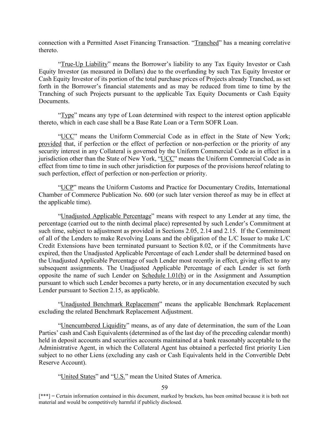 59 [***] = Certain information contained in this document, marked by brackets, has been omitted because it is both not material and would be competitively harmful if publicly disclosed. connection with a Permitted Asset Financing Transaction. “Tranched” has a meaning correlative thereto. “True-Up Liability” means the Borrower’s liability to any Tax Equity Investor or Cash Equity Investor (as measured in Dollars) due to the overfunding by such Tax Equity Investor or Cash Equity Investor of its portion of the total purchase prices of Projects already Tranched, as set forth in the Borrower’s financial statements and as may be reduced from time to time by the Tranching of such Projects pursuant to the applicable Tax Equity Documents or Cash Equity Documents. “Type” means any type of Loan determined with respect to the interest option applicable thereto, which in each case shall be a Base Rate Loan or a Term SOFR Loan. “UCC” means the Uniform Commercial Code as in effect in the State of New York; provided that, if perfection or the effect of perfection or non-perfection or the priority of any security interest in any Collateral is governed by the Uniform Commercial Code as in effect in a jurisdiction other than the State of New York, “UCC” means the Uniform Commercial Code as in effect from time to time in such other jurisdiction for purposes of the provisions hereof relating to such perfection, effect of perfection or non-perfection or priority. “UCP” means the Uniform Customs and Practice for Documentary Credits, International Chamber of Commerce Publication No. 600 (or such later version thereof as may be in effect at the applicable time). “Unadjusted Applicable Percentage” means with respect to any Lender at any time, the percentage (carried out to the ninth decimal place) represented by such Lender’s Commitment at such time, subject to adjustment as provided in Sections 2.05, 2.14 and 2.15. If the Commitment of all of the Lenders to make Revolving Loans and the obligation of the L/C Issuer to make L/C Credit Extensions have been terminated pursuant to Section 8.02, or if the Commitments have expired, then the Unadjusted Applicable Percentage of each Lender shall be determined based on the Unadjusted Applicable Percentage of such Lender most recently in effect, giving effect to any subsequent assignments. The Unadjusted Applicable Percentage of each Lender is set forth opposite the name of such Lender on Schedule 1.01(b) or in the Assignment and Assumption pursuant to which such Lender becomes a party hereto, or in any documentation executed by such Lender pursuant to Section 2.15, as applicable. “Unadjusted Benchmark Replacement” means the applicable Benchmark Replacement excluding the related Benchmark Replacement Adjustment. “Unencumbered Liquidity” means, as of any date of determination, the sum of the Loan Parties’ cash and Cash Equivalents (determined as of the last day of the preceding calendar month) held in deposit accounts and securities accounts maintained at a bank reasonably acceptable to the Administrative Agent, in which the Collateral Agent has obtained a perfected first priority Lien subject to no other Liens (excluding any cash or Cash Equivalents held in the Convertible Debt Reserve Account). “United States” and “U.S.” mean the United States of America.