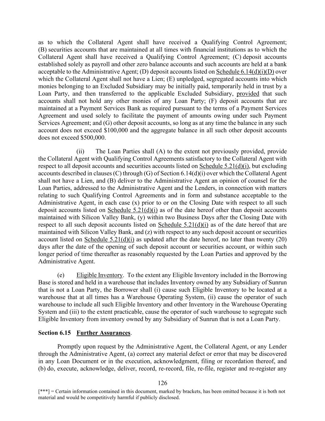 126 [***] = Certain information contained in this document, marked by brackets, has been omitted because it is both not material and would be competitively harmful if publicly disclosed. as to which the Collateral Agent shall have received a Qualifying Control Agreement; (B) securities accounts that are maintained at all times with financial institutions as to which the Collateral Agent shall have received a Qualifying Control Agreement; (C) deposit accounts established solely as payroll and other zero balance accounts and such accounts are held at a bank acceptable to the Administrative Agent; (D) deposit accounts listed on Schedule 6.14(d)(i)(D) over which the Collateral Agent shall not have a Lien; (E) unpledged, segregated accounts into which monies belonging to an Excluded Subsidiary may be initially paid, temporarily held in trust by a Loan Party, and then transferred to the applicable Excluded Subsidiary, provided that such accounts shall not hold any other monies of any Loan Party; (F) deposit accounts that are maintained at a Payment Services Bank as required pursuant to the terms of a Payment Services Agreement and used solely to facilitate the payment of amounts owing under such Payment Services Agreement; and (G) other deposit accounts, so long as at any time the balance in any such account does not exceed $100,000 and the aggregate balance in all such other deposit accounts does not exceed $500,000. (ii) The Loan Parties shall (A) to the extent not previously provided, provide the Collateral Agent with Qualifying Control Agreements satisfactory to the Collateral Agent with respect to all deposit accounts and securities accounts listed on Schedule 5.21(d)(i), but excluding accounts described in clauses (C) through (G) of Section 6.14(d)(i) over which the Collateral Agent shall not have a Lien, and (B) deliver to the Administrative Agent an opinion of counsel for the Loan Parties, addressed to the Administrative Agent and the Lenders, in connection with matters relating to such Qualifying Control Agreements and in form and substance acceptable to the Administrative Agent, in each case (x) prior to or on the Closing Date with respect to all such deposit accounts listed on Schedule 5.21(d)(i) as of the date hereof other than deposit accounts maintained with Silicon Valley Bank, (y) within two Business Days after the Closing Date with respect to all such deposit accounts listed on Schedule 5.21(d)(i) as of the date hereof that are maintained with Silicon Valley Bank, and (z) with respect to any such deposit account or securities account listed on Schedule 5.21(d)(i) as updated after the date hereof, no later than twenty (20) days after the date of the opening of such deposit account or securities account, or within such longer period of time thereafter as reasonably requested by the Loan Parties and approved by the Administrative Agent. (e) Eligible Inventory. To the extent any Eligible Inventory included in the Borrowing Base is stored and held in a warehouse that includes Inventory owned by any Subsidiary of Sunrun that is not a Loan Party, the Borrower shall (i) cause such Eligible Inventory to be located at a warehouse that at all times has a Warehouse Operating System, (ii) cause the operator of such warehouse to include all such Eligible Inventory and other Inventory in the Warehouse Operating System and (iii) to the extent practicable, cause the operator of such warehouse to segregate such Eligible Inventory from inventory owned by any Subsidiary of Sunrun that is not a Loan Party. Section 6.15 Further Assurances. Promptly upon request by the Administrative Agent, the Collateral Agent, or any Lender through the Administrative Agent, (a) correct any material defect or error that may be discovered in any Loan Document or in the execution, acknowledgment, filing or recordation thereof, and (b) do, execute, acknowledge, deliver, record, re-record, file, re-file, register and re-register any