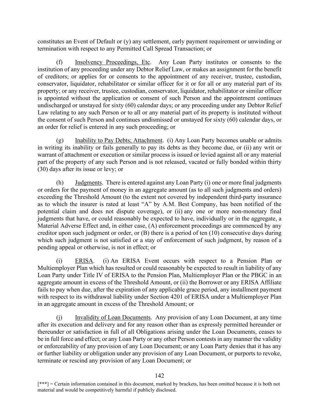 142 [***] = Certain information contained in this document, marked by brackets, has been omitted because it is both not material and would be competitively harmful if publicly disclosed. constitutes an Event of Default or (y) any settlement, early payment requirement or unwinding or termination with respect to any Permitted Call Spread Transaction; or (f) Insolvency Proceedings, Etc. Any Loan Party institutes or consents to the institution of any proceeding under any Debtor Relief Law, or makes an assignment for the benefit of creditors; or applies for or consents to the appointment of any receiver, trustee, custodian, conservator, liquidator, rehabilitator or similar officer for it or for all or any material part of its property; or any receiver, trustee, custodian, conservator, liquidator, rehabilitator or similar officer is appointed without the application or consent of such Person and the appointment continues undischarged or unstayed for sixty (60) calendar days; or any proceeding under any Debtor Relief Law relating to any such Person or to all or any material part of its property is instituted without the consent of such Person and continues undismissed or unstayed for sixty (60) calendar days, or an order for relief is entered in any such proceeding; or (g) Inability to Pay Debts; Attachment. (i) Any Loan Party becomes unable or admits in writing its inability or fails generally to pay its debts as they become due, or (ii) any writ or warrant of attachment or execution or similar process is issued or levied against all or any material part of the property of any such Person and is not released, vacated or fully bonded within thirty (30) days after its issue or levy; or (h) Judgments. There is entered against any Loan Party (i) one or more final judgments or orders for the payment of money in an aggregate amount (as to all such judgments and orders) exceeding the Threshold Amount (to the extent not covered by independent third-party insurance as to which the insurer is rated at least “A” by A.M. Best Company, has been notified of the potential claim and does not dispute coverage), or (ii) any one or more non-monetary final judgments that have, or could reasonably be expected to have, individually or in the aggregate, a Material Adverse Effect and, in either case, (A) enforcement proceedings are commenced by any creditor upon such judgment or order, or (B) there is a period of ten (10) consecutive days during which such judgment is not satisfied or a stay of enforcement of such judgment, by reason of a pending appeal or otherwise, is not in effect; or (i) ERISA. (i) An ERISA Event occurs with respect to a Pension Plan or Multiemployer Plan which has resulted or could reasonably be expected to result in liability of any Loan Party under Title IV of ERISA to the Pension Plan, Multiemployer Plan or the PBGC in an aggregate amount in excess of the Threshold Amount, or (ii) the Borrower or any ERISA Affiliate fails to pay when due, after the expiration of any applicable grace period, any installment payment with respect to its withdrawal liability under Section 4201 of ERISA under a Multiemployer Plan in an aggregate amount in excess of the Threshold Amount; or (j) Invalidity of Loan Documents. Any provision of any Loan Document, at any time after its execution and delivery and for any reason other than as expressly permitted hereunder or thereunder or satisfaction in full of all Obligations arising under the Loan Documents, ceases to be in full force and effect; or any Loan Party or any other Person contests in any manner the validity or enforceability of any provision of any Loan Document; or any Loan Party denies that it has any or further liability or obligation under any provision of any Loan Document, or purports to revoke, terminate or rescind any provision of any Loan Document; or