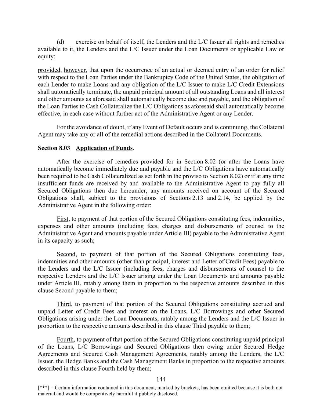 144 [***] = Certain information contained in this document, marked by brackets, has been omitted because it is both not material and would be competitively harmful if publicly disclosed. (d) exercise on behalf of itself, the Lenders and the L/C Issuer all rights and remedies available to it, the Lenders and the L/C Issuer under the Loan Documents or applicable Law or equity; provided, however, that upon the occurrence of an actual or deemed entry of an order for relief with respect to the Loan Parties under the Bankruptcy Code of the United States, the obligation of each Lender to make Loans and any obligation of the L/C Issuer to make L/C Credit Extensions shall automatically terminate, the unpaid principal amount of all outstanding Loans and all interest and other amounts as aforesaid shall automatically become due and payable, and the obligation of the Loan Parties to Cash Collateralize the L/C Obligations as aforesaid shall automatically become effective, in each case without further act of the Administrative Agent or any Lender. For the avoidance of doubt, if any Event of Default occurs and is continuing, the Collateral Agent may take any or all of the remedial actions described in the Collateral Documents. Section 8.03 Application of Funds. After the exercise of remedies provided for in Section 8.02 (or after the Loans have automatically become immediately due and payable and the L/C Obligations have automatically been required to be Cash Collateralized as set forth in the proviso to Section 8.02) or if at any time insufficient funds are received by and available to the Administrative Agent to pay fully all Secured Obligations then due hereunder, any amounts received on account of the Secured Obligations shall, subject to the provisions of Sections 2.13 and 2.14, be applied by the Administrative Agent in the following order: First, to payment of that portion of the Secured Obligations constituting fees, indemnities, expenses and other amounts (including fees, charges and disbursements of counsel to the Administrative Agent and amounts payable under Article III) payable to the Administrative Agent in its capacity as such; Second, to payment of that portion of the Secured Obligations constituting fees, indemnities and other amounts (other than principal, interest and Letter of Credit Fees) payable to the Lenders and the L/C Issuer (including fees, charges and disbursements of counsel to the respective Lenders and the L/C Issuer arising under the Loan Documents and amounts payable under Article III, ratably among them in proportion to the respective amounts described in this clause Second payable to them; Third, to payment of that portion of the Secured Obligations constituting accrued and unpaid Letter of Credit Fees and interest on the Loans, L/C Borrowings and other Secured Obligations arising under the Loan Documents, ratably among the Lenders and the L/C Issuer in proportion to the respective amounts described in this clause Third payable to them; Fourth, to payment of that portion of the Secured Obligations constituting unpaid principal of the Loans, L/C Borrowings and Secured Obligations then owing under Secured Hedge Agreements and Secured Cash Management Agreements, ratably among the Lenders, the L/C Issuer, the Hedge Banks and the Cash Management Banks in proportion to the respective amounts described in this clause Fourth held by them;