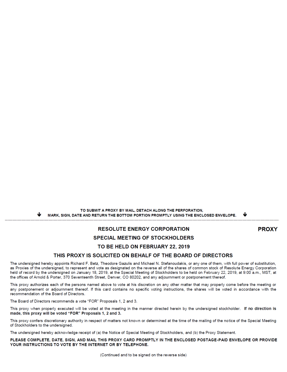 TO SUBMIT A PROXY BY MAIL, DETACH ALONG THE PERFORATION, MARK, SIGN, DATE AND RETURN THE BOTTOM PORTION PROMPTLY USING THE ENCLOSED ENVELOPE. RESOLUTE ENERGY CORPORATION SPECIAL MEETING OF STOCKHOLDERS TO BE HELD ON FEBRUARY 22, 2019 THIS PROXY IS SOLICITED ON BEHALF OF THE BOARD OF DIRECTORS PROXY The undersigned hereby appoints Richard F. Betz, Theodore Gazulis and Michael N. Stefanoudakis, or any one of them, with full power of substitution, as Proxies of the undersigned, to represent and vote as designated on the reverse all of the shares of common stock of Resolu te Energy Corporation held of record by the undersigned on January 18, 2019, at the Special Meeting of Stockholders to be held on February 22, 2019, at 9:00 a.m., MST, at the offices of Arnold & Porter, 370 Seventeenth Street, Denver, CO 80202, and any adjournment or postponement thereof. This proxy authorizes each of the persons named above to vote at his discretion on any other matter that may properly come before the meeting or any postponement or adjournment thereof. If this card contains no specific voting instructions, the shares will be voted in accordance with the recommendation of the Board of Directors. The Board of Directors recommends a vote “FOR” Proposals 1, 2 and 3. This proxy when properly executed will be voted at the meeting in the manner directed herein by the undersigned stockholder. If no direction is made, this proxy will be voted “FOR” Proposals 1, 2 and 3. This proxy confers discretionary authority in respect of matters not known or determined at the time of the mailing of the no tice of the Special Meeting of Stockholders to the undersigned. The undersigned hereby acknowledge receipt of (a) the Notice of Special Meeting of Stockholders, and (b) the Proxy Statement. PLEASE COMPLETE, DATE, SIGN, AND MAIL THIS PROXY CARD PROMPTLY IN THE ENCLOSED POSTAGE-PAID ENVELOPE OR PROVIDE YOUR INSTRUCTIONS TO VOTE BY THE INTERNET OR BY TELEPHONE. (Continued and to be signed on the reverse side)