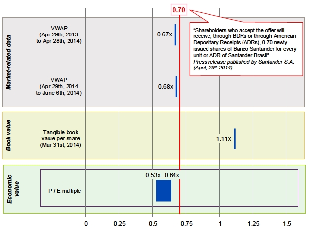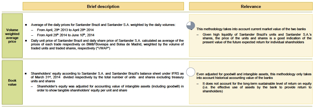 The values presented hereby for the exchange ratio are based on the following assumptions: n EUR/BRL exchange rate as of June 10th, 2014: 3.02 n For comparable trading multiples valuation ranges: – Minimum of the range correspond to the exchange ratio between the maximum value of the range for Santander S.A. share and the minimum of the range for Santander Brazil’s unit – Maximum of the range correspond to the exchange ratio between the minimum value of the range for Santander S.A. share and the maximum of the range for Santander Brazil’s unit The methodology adopted to determine the exchange ratio was the economic value based on comparable trading multiples