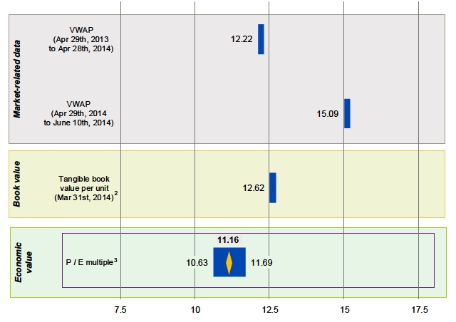 The valuation of Santander Brazil´s units is based on the following methodologies: n Volume weighted average price per unit – VWAP 12M before the Material Fact disclosed by Santander S.A. on April, 29th 2014 – VWAP from the Material Fact date to June 10th, 2014 n Book value: – Tangible book value2 (“TBV) per unit n Economic value based on comparable trading multiples: – Valuation based on trading multiples of selected Brazilian banks with a retail focus, namely: Itaú, Bradesco and Banco do Brasil – Source: Reuters consensus net income estimates published by Thomson as of June 10th, 2014 The methodology adopted to the definition of Santander Brazil´s units economic value was the economic based on comparable trading 7.5 multiples