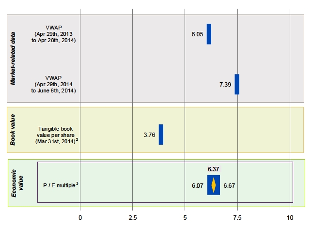 The valuation of Santander S.A. shares is based on the following methodologies: nVolume weighted average share price: – Valuation based on trading multiples of selected European banks with a retail focus, – Source: Reuters consensus net incomeestimates published by Factset as of June,10th 2014 The methodology adopted to determine Santander S.A. shares economic value was the economic value based on comparable trading multiples