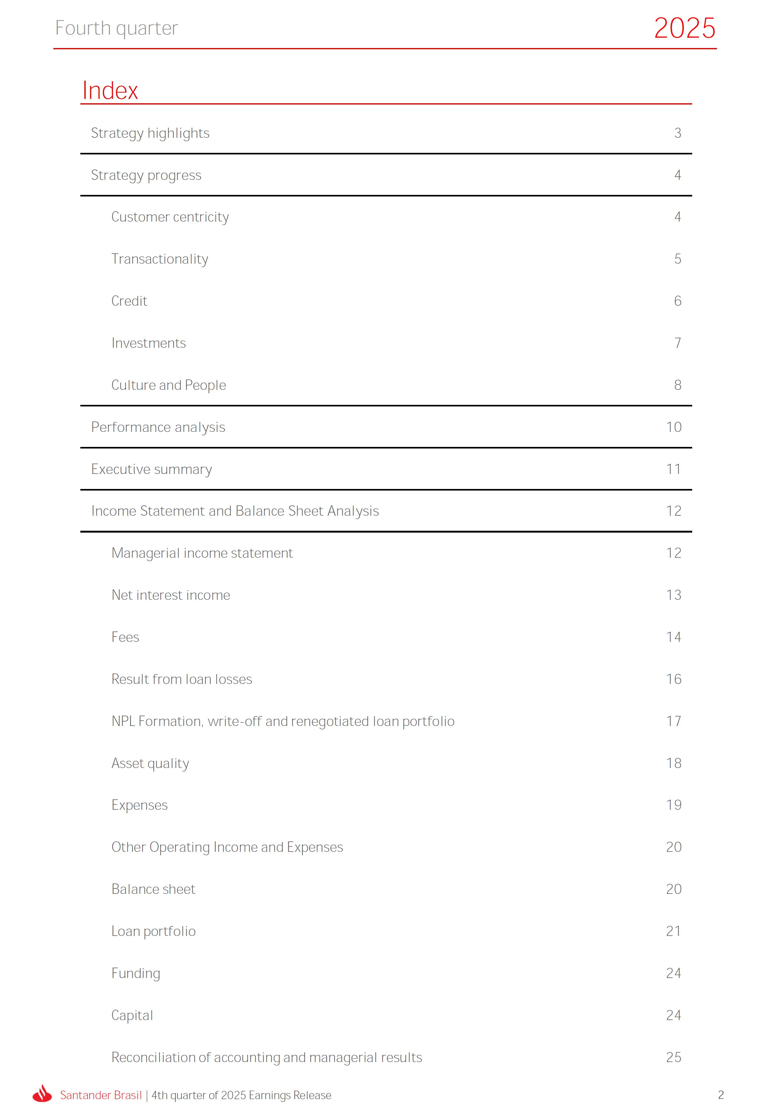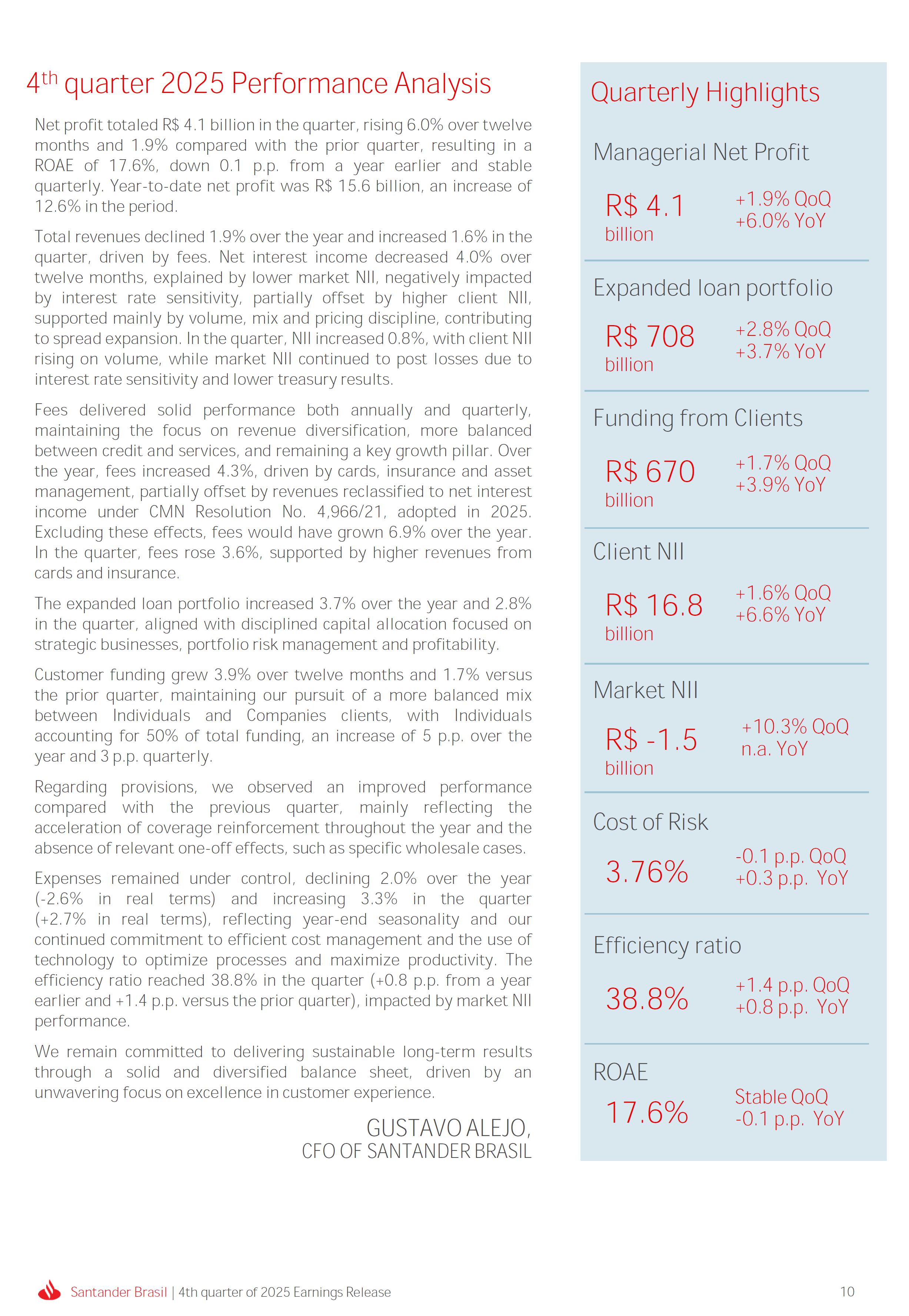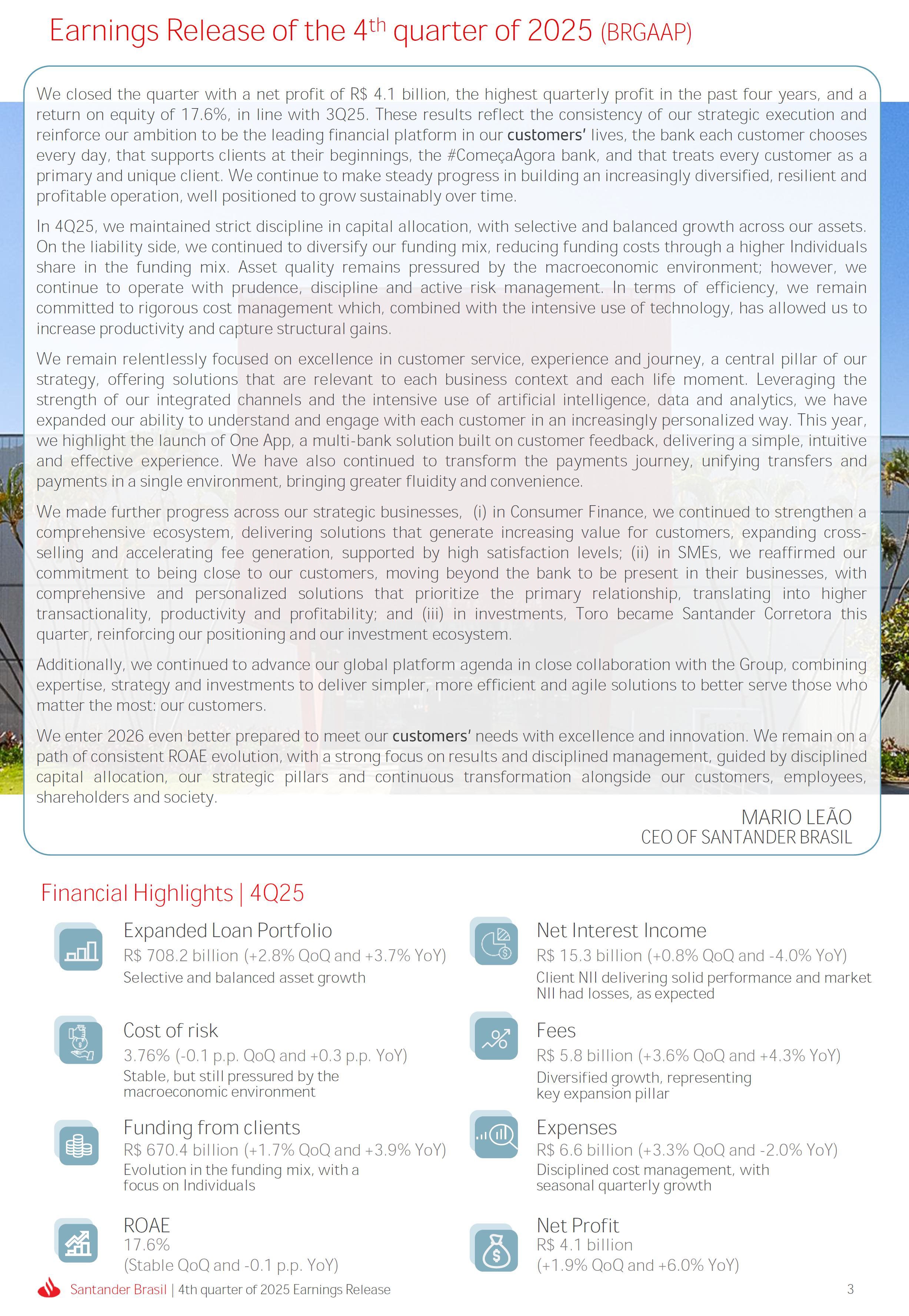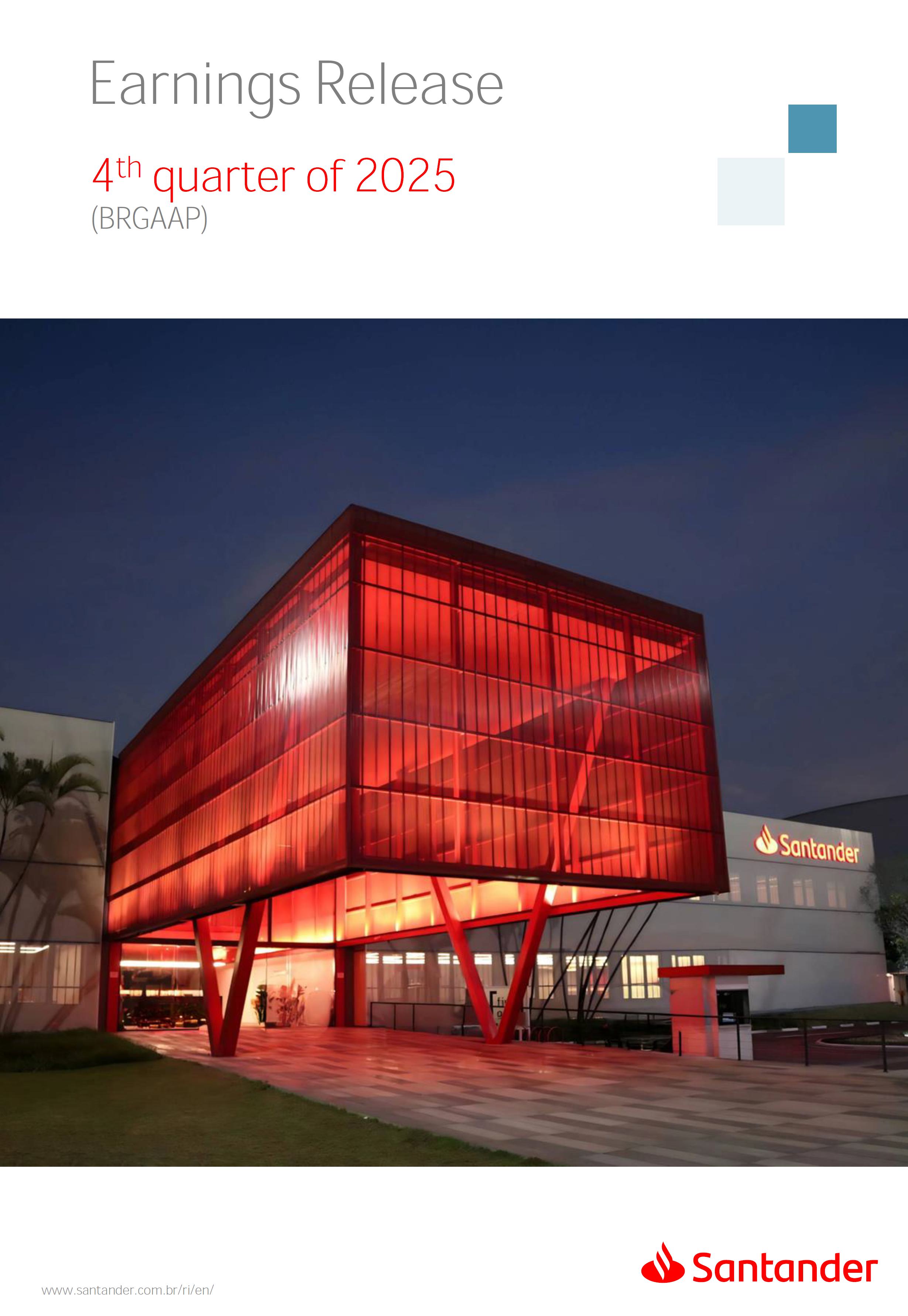 Earnings Release 4th quarter of 2025 (BRGAAP) www.santander.com.br/ri/en/ www.santander.com.br/ri/en/ Strategy highlights 3 Strategy progress 4 Customer centricity 4 Transactionality 5 Credit 6 Investments 7 Culture and People 8 Performance analysis 10 Executive summary 11 Income Statement and Balance Sheet Analysis 12 Managerial income statement 12 Net interest income 13 Fees 14 Result from loan losses 16 NPL Formation, write-off and renegotiated loan portfolio 17 Asset quality 18 Expenses 19 Other Operating Income and Expenses 20 Balance sheet 20 Loan portfolio 21 Funding 24 Capital 24 Reconciliation of accounting and managerial results 25 Fourth quarter 2025 Index 2 Santander Brasil | 4th quarter of 2025 Earnings Release Financial Highlights | 4Q25 Earnings Release of the 4thquarter of 2025 (BRGAAP) MARIO LEÃO CEO OF SANTANDER BRASIL Expanded Loan Portfolio R$ 708.2 billion (+2.8% QoQ and +3.7% YoY) Selective and balanced asset growth Expenses Disciplined cost management, with seasonal quarterly growth Cost of risk Stable, but still pressured by the macroeconomic environment Net Profit Net Interest Income R$ 15.3 billion (+0.8% QoQ and -4.0% YoY) Fees R$ 5.8billion(+3.6%QoQand+4.3%YoY) Diversified growth, representing key expansion pillar Client NII delivering solid performance and market NII had losses, as expected R$6.6billion(+3.3%QoQand-2.0%YoY) 3.76% (-0.1 p.p. QoQand+0.3 p.p. YoY) (+1.9% QoQ and +6.0% YoY) Funding from clients Evolution in the funding mix, with a focus on Individuals R$ 670.4billion(+1.7%QoQand+3.9%YoY) WeclosedthequarterwithanetprofitofR$4.1billion,thehighestquarterlyprofitinthepastfouryears,andareturnonequityof17.6%,inlinewith3Q25.Theseresultsreflecttheconsistencyofourstrategicexecutionandreinforceourambitiontobetheleadingfinancialplatforminourcustomers’lives,thebankeachcustomerchooseseveryday,thatsupportsclientsattheirbeginnings,the#ComeçaAgorabank,andthattreatseverycustomerasaprimaryanduniqueclient.Wecontinuetomakesteadyprogressinbuildinganincreasinglydiversified,resilientandprofitableoperation,wellpositionedtogrowsustainablyovertime. In4Q25,wemaintainedstrictdisciplineincapitalallocation,withselectiveandbalancedgrowthacrossourassets.Ontheliabilityside,wecontinuedtodiversifyourfundingmix,reducingfundingcoststhroughahigherIndividualsshareinthefundingmix.Assetqualityremainspressuredbythemacroeconomicenvironment;however,wecontinuetooperatewithprudence,disciplineandactiveriskmanagement.Intermsofefficiency,weremaincommittedtorigorouscostmanagementwhich,combinedwiththeintensiveuseoftechnology,hasallowedustoincreaseproductivityandcapturestructuralgains. Weremainrelentlesslyfocusedonexcellenceincustomerservice,experienceandjourney,acentralpillarofourstrategy,offeringsolutionsthatarerelevanttoeachbusinesscontextandeachlifemoment.Leveragingthestrengthofourintegratedchannelsandtheintensiveuseofartificialintelligence,dataandanalytics,wehaveexpandedourabilitytounderstandandengagewitheachcustomerinanincreasinglypersonalizedway.Thisyear,wehighlightthelaunchofOneApp,amulti-banksolutionbuiltoncustomerfeedback,deliveringasimple,intuitiveandeffectiveexperience.Wehavealsocontinuedtotransformthepaymentsjourney,unifyingtransfersandpaymentsinasingleenvironment,bringinggreaterfluidityandconvenience. Wemadefurtherprogressacrossourstrategicbusinesses,(i)inConsumerFinance,wecontinuedtostrengthenacomprehensiveecosystem,deliveringsolutionsthatgenerateincreasingvalueforcustomers,expandingcross-sellingandacceleratingfeegeneration,supportedbyhighsatisfactionlevels;(ii)inSMEs,wereaffirmedourcommitmenttobeingclosetoourcustomers,movingbeyondthebanktobepresentintheirbusinesses,withcomprehensiveandpersonalizedsolutionsthatprioritizetheprimaryrelationship,translatingintohighertransactionality,productivityandprofitability;and(iii)ininvestments,TorobecameSantanderCorretorathisquarter,reinforcingourpositioningandourinvestmentecosystem. Additionally,wecontinuedtoadvanceourglobalplatformagendainclosecollaborationwiththeGroup,combiningexpertise,strategyandinvestmentstodeliversimpler,moreefficientandagilesolutionstobetterservethosewhomatterthemost:ourcustomers. Weenter2026evenbetterpreparedtomeetourcustomers’needswithexcellenceandinnovation.WeremainonapathofconsistentROAEevolution,withastrongfocusonresultsanddisciplinedmanagement,guidedbydisciplinedcapitalallocation,ourstrategicpillarsandcontinuoustransformationalongsideourcustomers,employees,shareholdersandsociety. R$ 4.1billion ROAE 17.6% (Stable QoQ and -0.1 p.p. YoY) Santander Brasil | 4th quarter of 2025 Earnings Release 3 Wecontinuouslyseektoenhanceourcustomerofferingandservicemodel,combininghumaninteractionwithdigitalchannelstodeliverthebestexperienceacrossalltouchpointswiththebank.Indigitalchannels,wecontinuetoadvancetechnologically,offeringincreasinglysimpleandcomprehensivejourneys. Inassistedchannels,encompassingbothphysicalbranchesandremoteservice,ourservicemodelpositionsthebranchasaconveniencechannelandanintegralpartofourcomprehensivemultichanneloffering. Wearefocusonhyper-personalization,with60%ofIndividualsinteractionsbasedoncustomerbehaviorandlifemoment,drivinghigherengagementandconversion. OureffortsarereflectedinrisingcustomersatisfactionoverthepasttwoyearsacrossbothIndividualandCompaniessegments,reinforcingourcommitmenttodeliveringsolutionsthatmeetcustomerneedswithexcellenceinserviceandexperience. Integrated customer perspective Obsession with a complete customer experience 4 Weremainfocusedonbeingthemostpresentbankinourcustomers’lives.Ourcustomer-centricstrategytranslatesintosustainablegrowthofourcustomerbase,particularlyamongprimaryrelationshipclients,highersatisfactionlevels,asmeasuredbyNPS,andimprovedprofitability.Weexpandedourcustomerbaseby6%overtwelvemonths,reaching73.9millionclients. Theevolutionofourbusinessmodel,supportedbytheintensiveuseoftechnologytoservecustomerswhere,howandwhentheychoose,hasenabledcontinuousimprovementofthecustomerjourney,withproductofferingsbetteralignedwithindividualprofilesandaclearfocusonprima