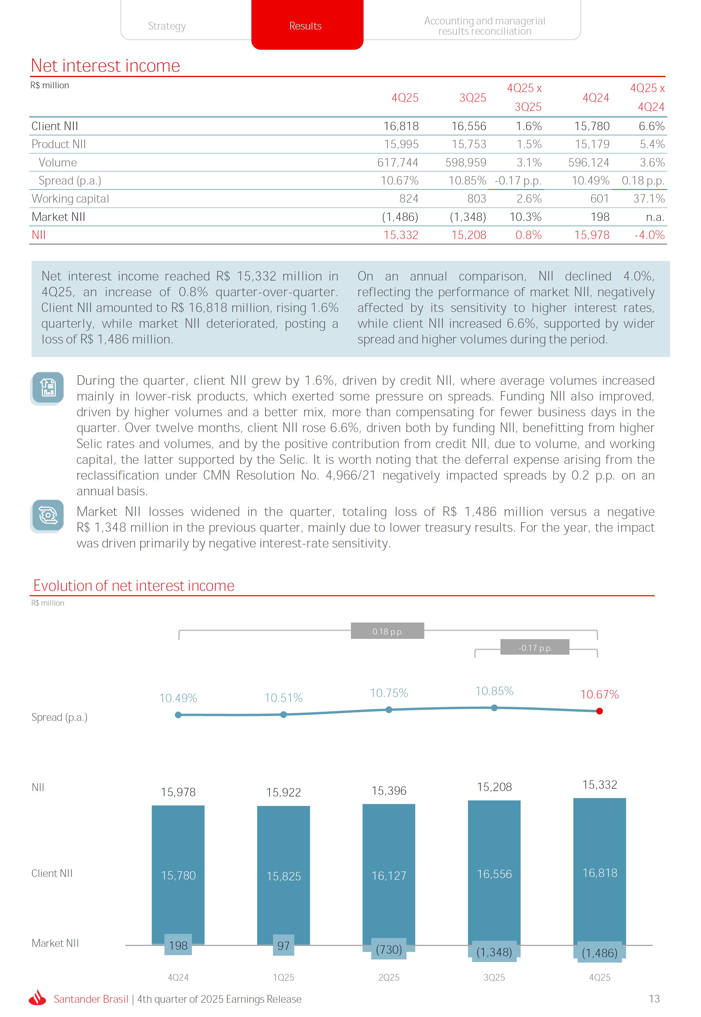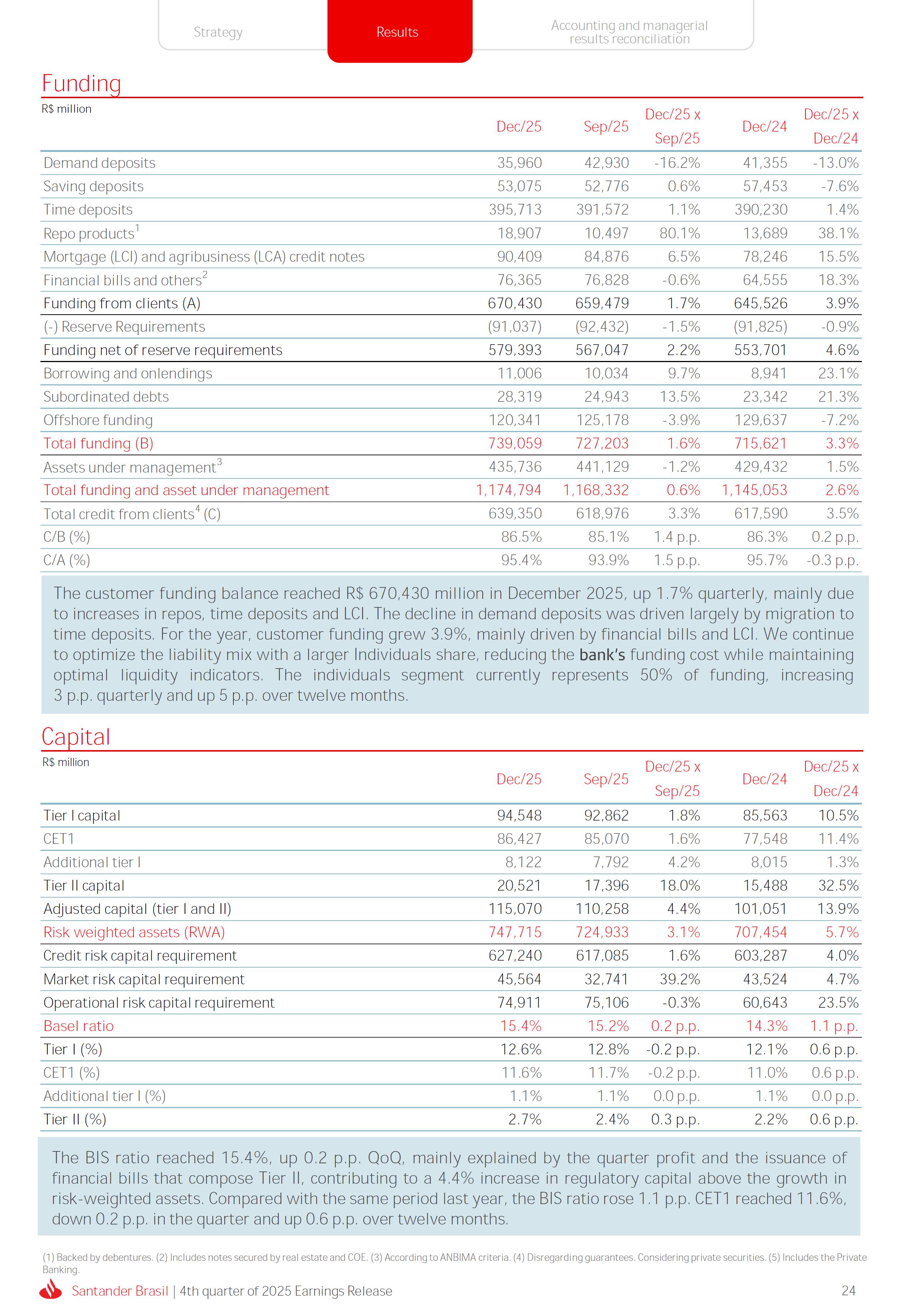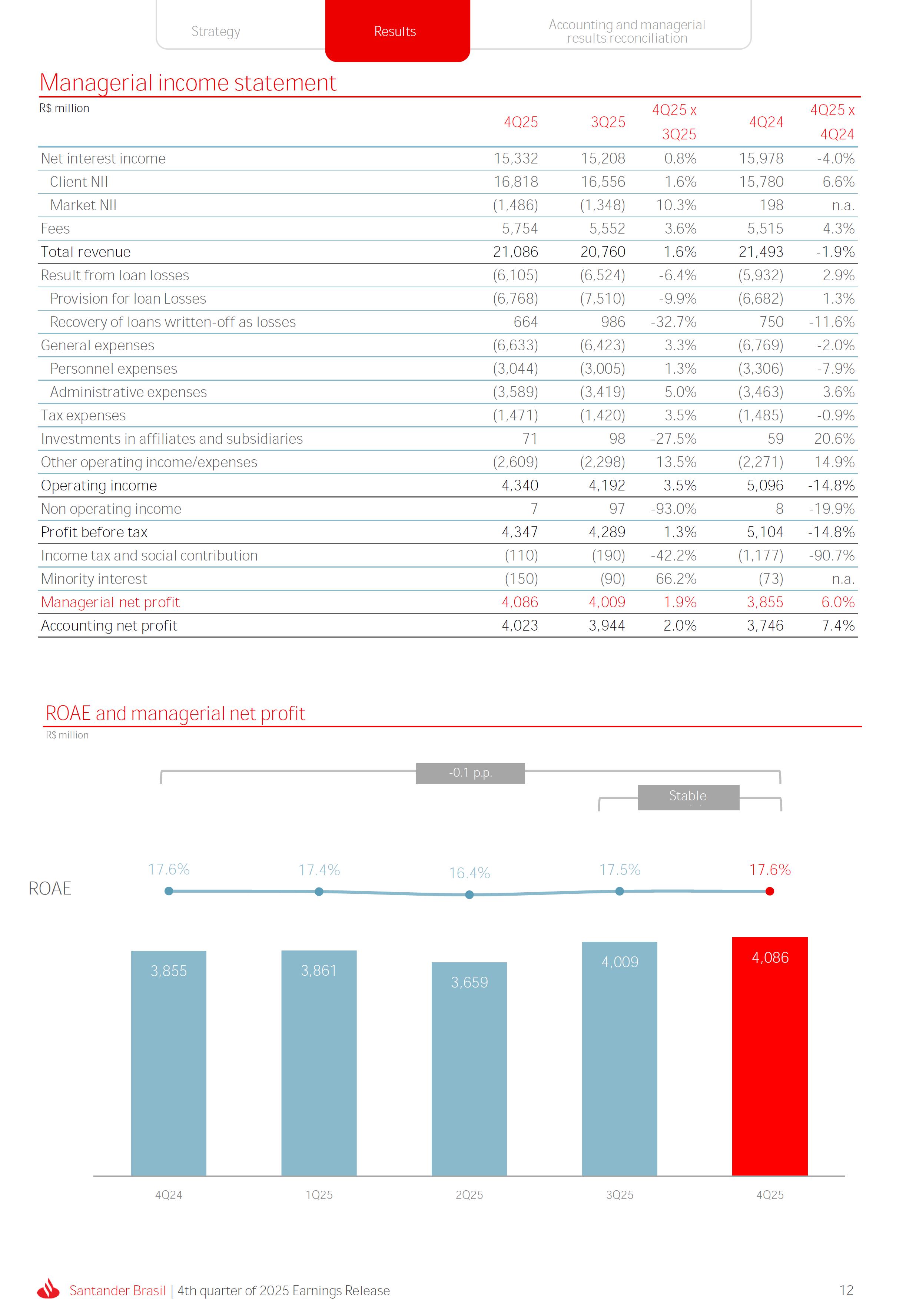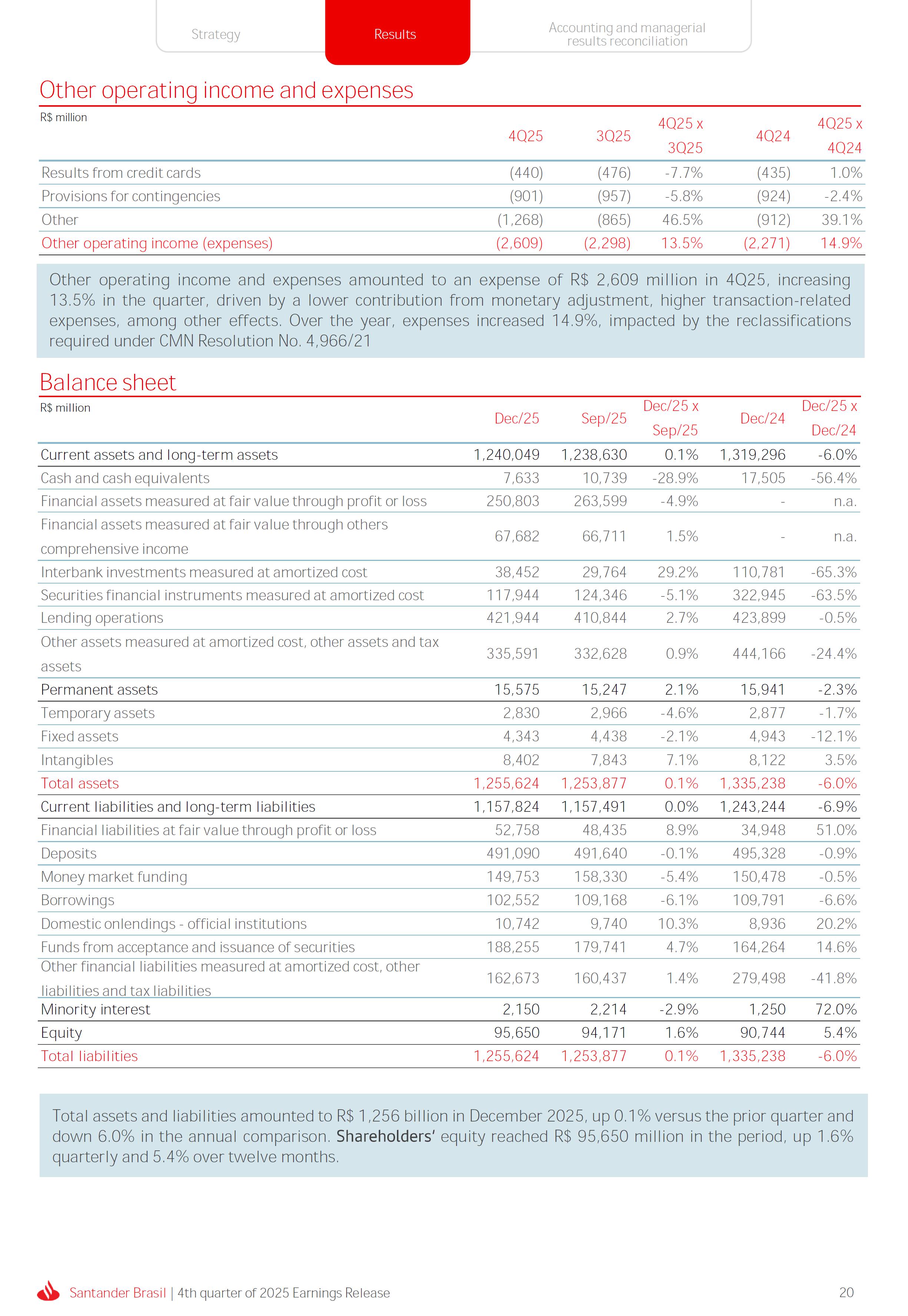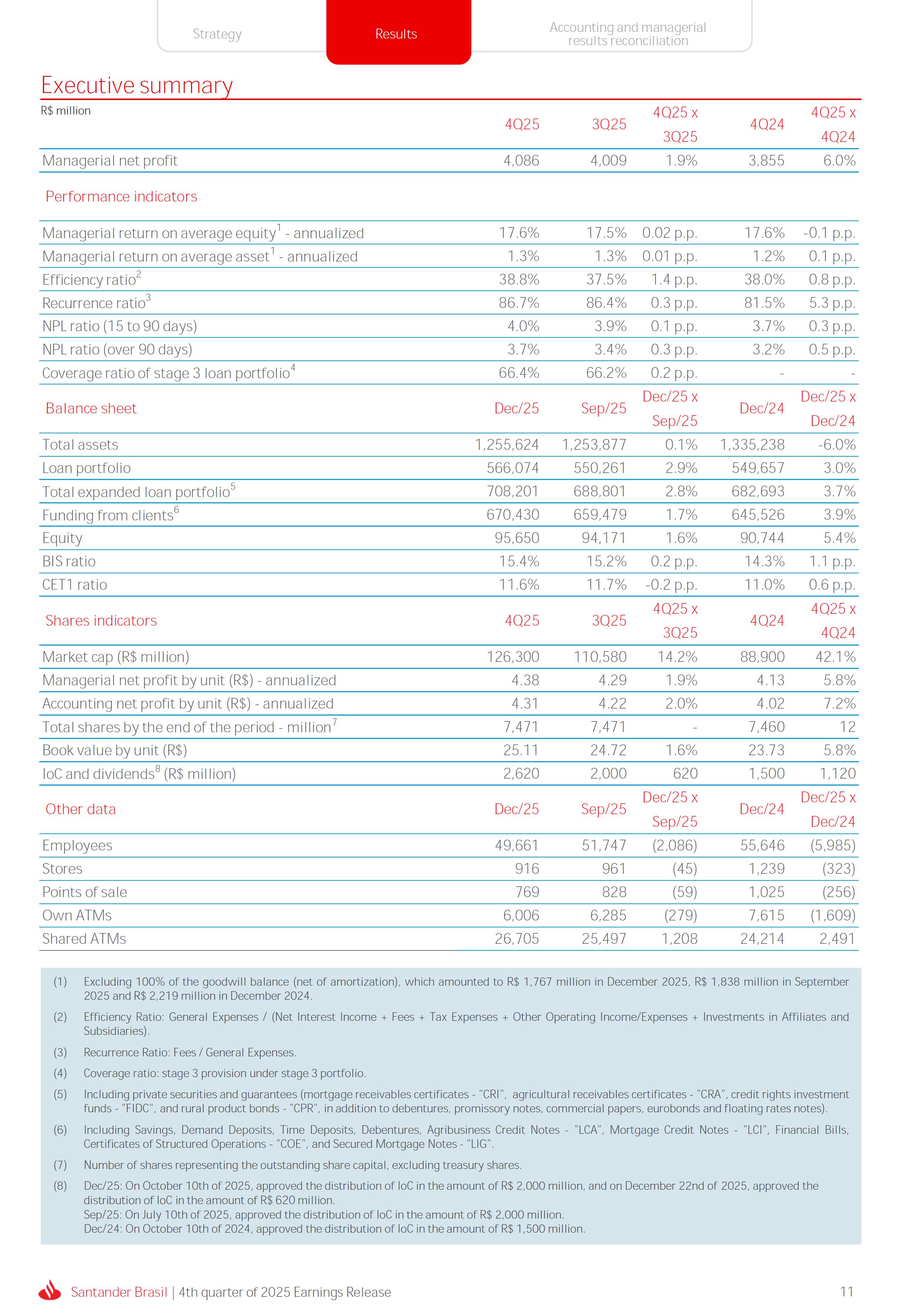 Earnings Release 4th quarter of 2025 (BRGAAP) www.santander.com.br/ri/en/ www.santander.com.br/ri/en/ Strategy highlights 3 Strategy progress 4 Customer centricity 4 Transactionality 5 Credit 6 Investments 7 Culture and People 8 Performance analysis 10 Executive summary 11 Income Statement and Balance Sheet Analysis 12 Managerial income statement 12 Net interest income 13 Fees 14 Result from loan losses 16 NPL Formation, write-off and renegotiated loan portfolio 17 Asset quality 18 Expenses 19 Other Operating Income and Expenses 20 Balance sheet 20 Loan portfolio 21 Funding 24 Capital 24 Reconciliation of accounting and managerial results 25 Fourth quarter 2025 Index 2 Santander Brasil | 4th quarter of 2025 Earnings Release Financial Highlights | 4Q25 Earnings Release of the 4thquarter of 2025 (BRGAAP) MARIO LEÃO CEO OF SANTANDER BRASIL Expanded Loan Portfolio R$ 708.2 billion (+2.8% QoQ and +3.7% YoY) Selective and balanced asset growth Expenses Disciplined cost management, with seasonal quarterly growth Cost of risk Stable, but still pressured by the macroeconomic environment Net Profit Net Interest Income R$ 15.3 billion (+0.8% QoQ and -4.0% YoY) Fees R$ 5.8billion(+3.6%QoQand+4.3%YoY) Diversified growth, representing key expansion pillar Client NII delivering solid performance and market NII had losses, as expected R$6.6billion(+3.3%QoQand-2.0%YoY) 3.76% (-0.1 p.p. QoQand+0.3 p.p. YoY) (+1.9% QoQ and +6.0% YoY) Funding from clients Evolution in the funding mix, with a focus on Individuals R$ 670.4billion(+1.7%QoQand+3.9%YoY) WeclosedthequarterwithanetprofitofR$4.1billion,thehighestquarterlyprofitinthepastfouryears,andareturnonequityof17.6%,inlinewith3Q25.Theseresultsreflecttheconsistencyofourstrategicexecutionandreinforceourambitiontobetheleadingfinancialplatforminourcustomers’lives,thebankeachcustomerchooseseveryday,thatsupportsclientsattheirbeginnings,the#ComeçaAgorabank,andthattreatseverycustomerasaprimaryanduniqueclient.Wecontinuetomakesteadyprogressinbuildinganincreasinglydiversified,resilientandprofitableoperation,wellpositionedtogrowsustainablyovertime. In4Q25,wemaintainedstrictdisciplineincapitalallocation,withselectiveandbalancedgrowthacrossourassets.Ontheliabilityside,wecontinuedtodiversifyourfundingmix,reducingfundingcoststhroughahigherIndividualsshareinthefundingmix.Assetqualityremainspressuredbythemacroeconomicenvironment;however,wecontinuetooperatewithprudence,disciplineandactiveriskmanagement.Intermsofefficiency,weremaincommittedtorigorouscostmanagementwhich,combinedwiththeintensiveuseoftechnology,hasallowedustoincreaseproductivityandcapturestructuralgains. Weremainrelentlesslyfocusedonexcellenceincustomerservice,experienceandjourney,acentralpillarofourstrategy,offeringsolutionsthatarerelevanttoeachbusinesscontextandeachlifemoment.Leveragingthestrengthofourintegratedchannelsandtheintensiveuseofartificialintelligence,dataandanalytics,wehaveexpandedourabilitytounderstandandengagewitheachcustomerinanincreasinglypersonalizedway.Thisyear,wehighlightthelaunchofOneApp,amulti-banksolutionbuiltoncustomerfeedback,deliveringasimple,intuitiveandeffectiveexperience.Wehavealsocontinuedtotransformthepaymentsjourney,unifyingtransfersandpaymentsinasingleenvironment,bringinggreaterfluidityandconvenience. Wemadefurtherprogressacrossourstrategicbusinesses,(i)inConsumerFinance,wecontinuedtostrengthenacomprehensiveecosystem,deliveringsolutionsthatgenerateincreasingvalueforcustomers,expandingcross-sellingandacceleratingfeegeneration,supportedbyhighsatisfactionlevels;(ii)inSMEs,wereaffirmedourcommitmenttobeingclosetoourcustomers,movingbeyondthebanktobepresentintheirbusinesses,withcomprehensiveandpersonalizedsolutionsthatprioritizetheprimaryrelationship,translatingintohighertransactionality,productivityandprofitability;and(iii)ininvestments,TorobecameSantanderCorretorathisquarter,reinforcingourpositioningandourinvestmentecosystem. Additionally,wecontinuedtoadvanceourglobalplatformagendainclosecollaborationwiththeGroup,combiningexpertise,strategyandinvestmentstodeliversimpler,moreefficientandagilesolutionstobetterservethosewhomatterthemost:ourcustomers. Weenter2026evenbetterpreparedtomeetourcustomers’needswithexcellenceandinnovation.WeremainonapathofconsistentROAEevolution,withastrongfocusonresultsanddisciplinedmanagement,guidedbydisciplinedcapitalallocation,ourstrategicpillarsandcontinuoustransformationalongsideourcustomers,employees,shareholdersandsociety. R$ 4.1billion ROAE 17.6% (Stable QoQ and -0.1 p.p. YoY) Santander Brasil | 4th quarter of 2025 Earnings Release 3 Wecontinuouslyseektoenhanceourcustomerofferingandservicemodel,combininghumaninteractionwithdigitalchannelstodeliverthebestexperienceacrossalltouchpointswiththebank.Indigitalchannels,wecontinuetoadvancetechnologically,offeringincreasinglysimpleandcomprehensivejourneys. Inassistedchannels,encompassingbothphysicalbranchesandremoteservice,ourservicemodelpositionsthebranchasaconveniencechannelandanintegralpartofourcomprehensivemultichanneloffering. Wearefocusonhyper-personalization,with60%ofIndividualsinteractionsbasedoncustomerbehaviorandlifemoment,drivinghigherengagementandconversion. OureffortsarereflectedinrisingcustomersatisfactionoverthepasttwoyearsacrossbothIndividualandCompaniessegments,reinforcingourcommitmenttodeliveringsolutionsthatmeetcustomerneedswithexcellenceinserviceandexperience. Integrated customer perspective Obsession with a complete customer experience 4 Weremainfocusedonbeingthemostpresentbankinourcustomers’lives.Ourcustomer-centricstrategytranslatesintosustainablegrowthofourcustomerbase,particularlyamongprimaryrelationshipclients,highersatisfactionlevels,asmeasuredbyNPS,andimprovedprofitability.Weexpandedourcustomerbaseby6%overtwelvemonths,reaching73.9millionclients. Theevolutionofourbusinessmodel,supportedbytheintensiveuseoftechnologytoservecustomerswhere,howandwhentheychoose,hasenabledcontinuousimprovementofthecustomerjourney,withproductofferingsbetteralignedwithindividualprofilesandaclearfocusonprima