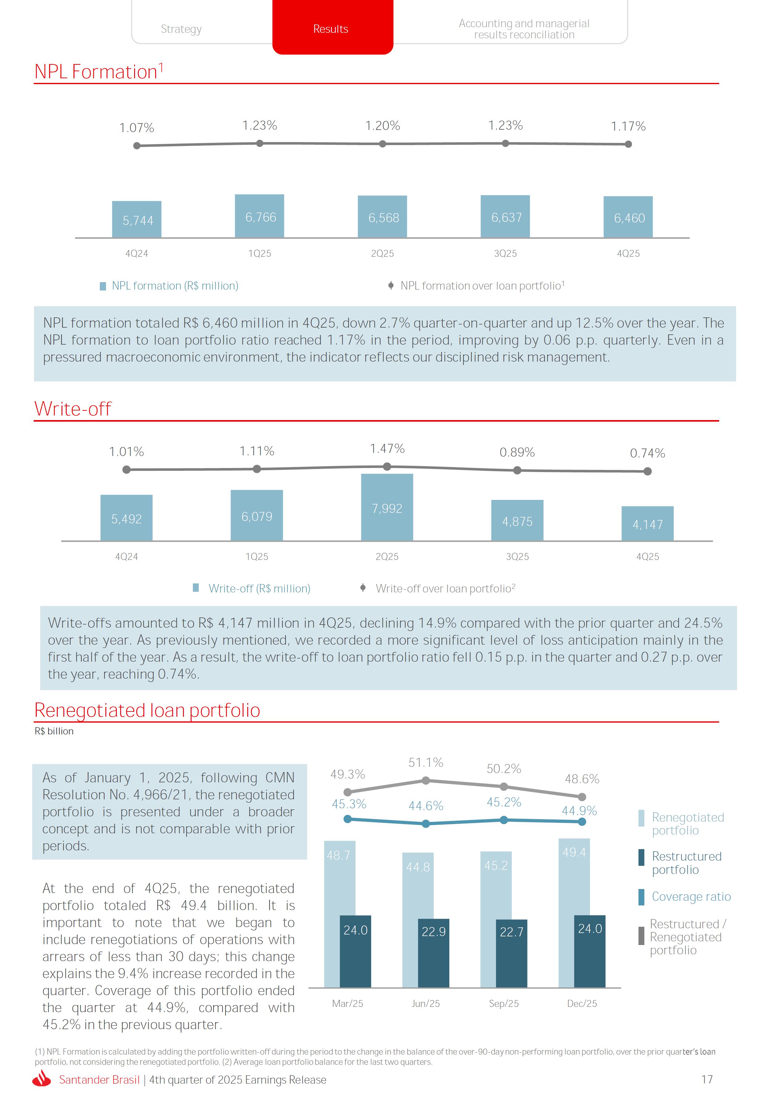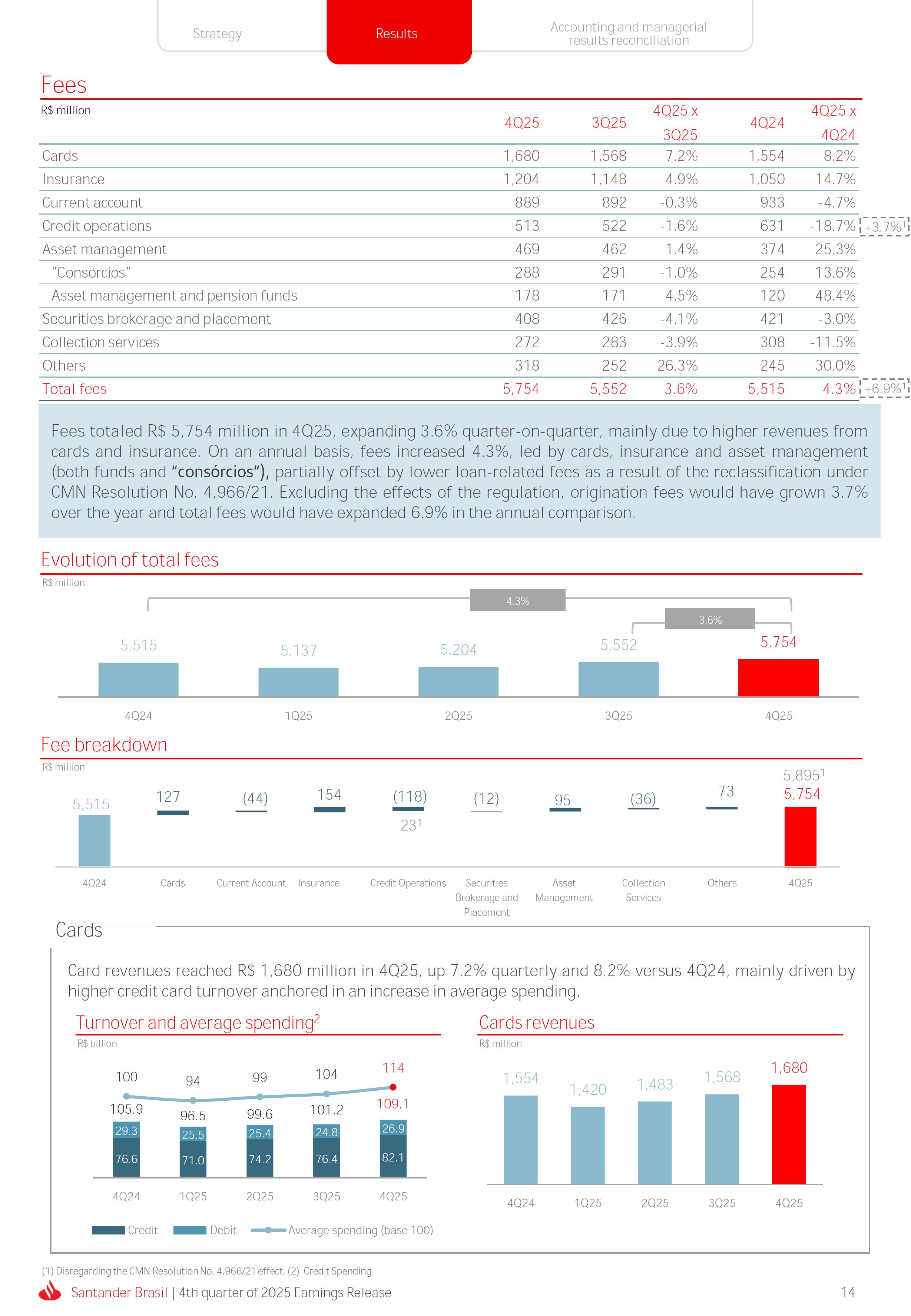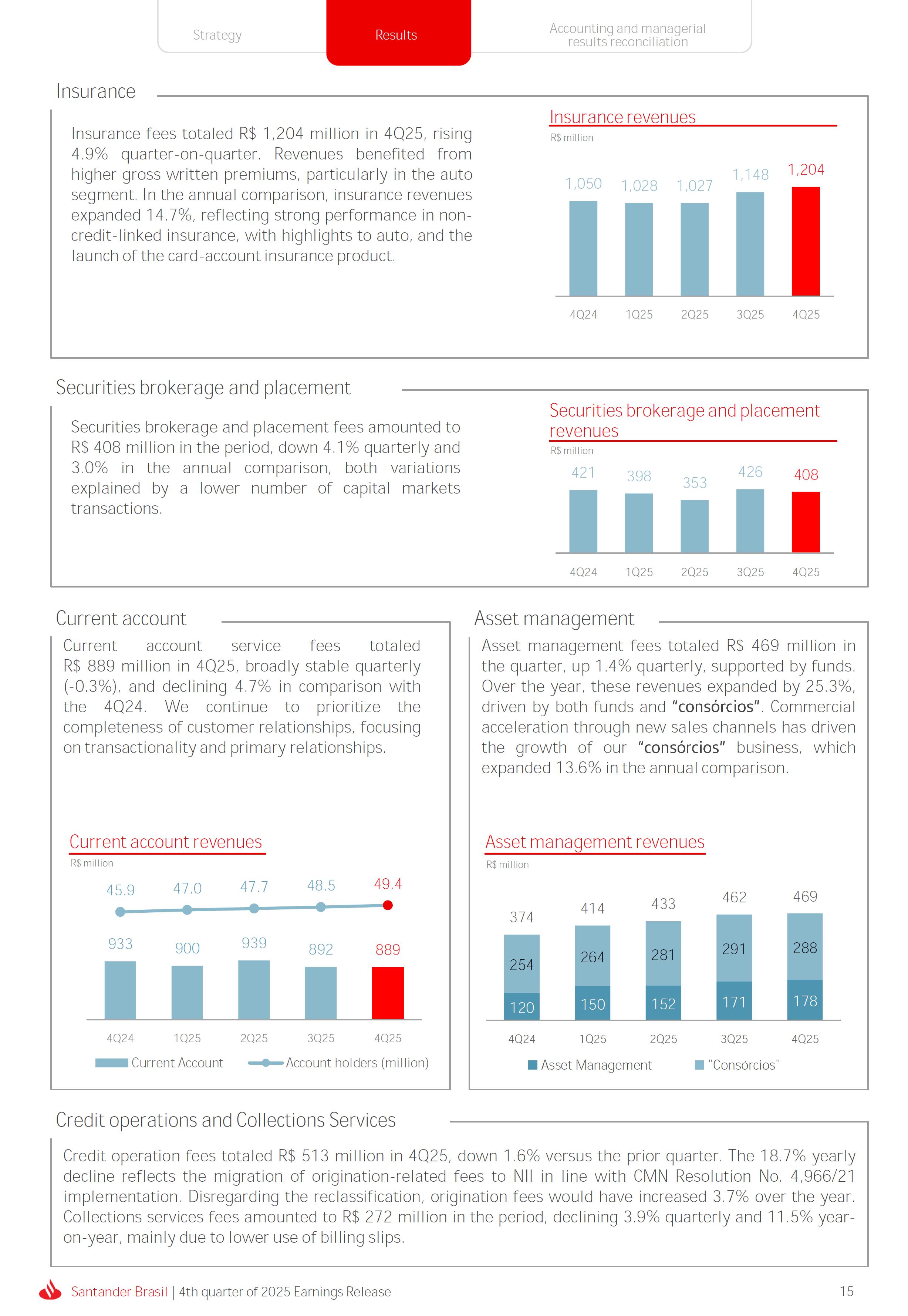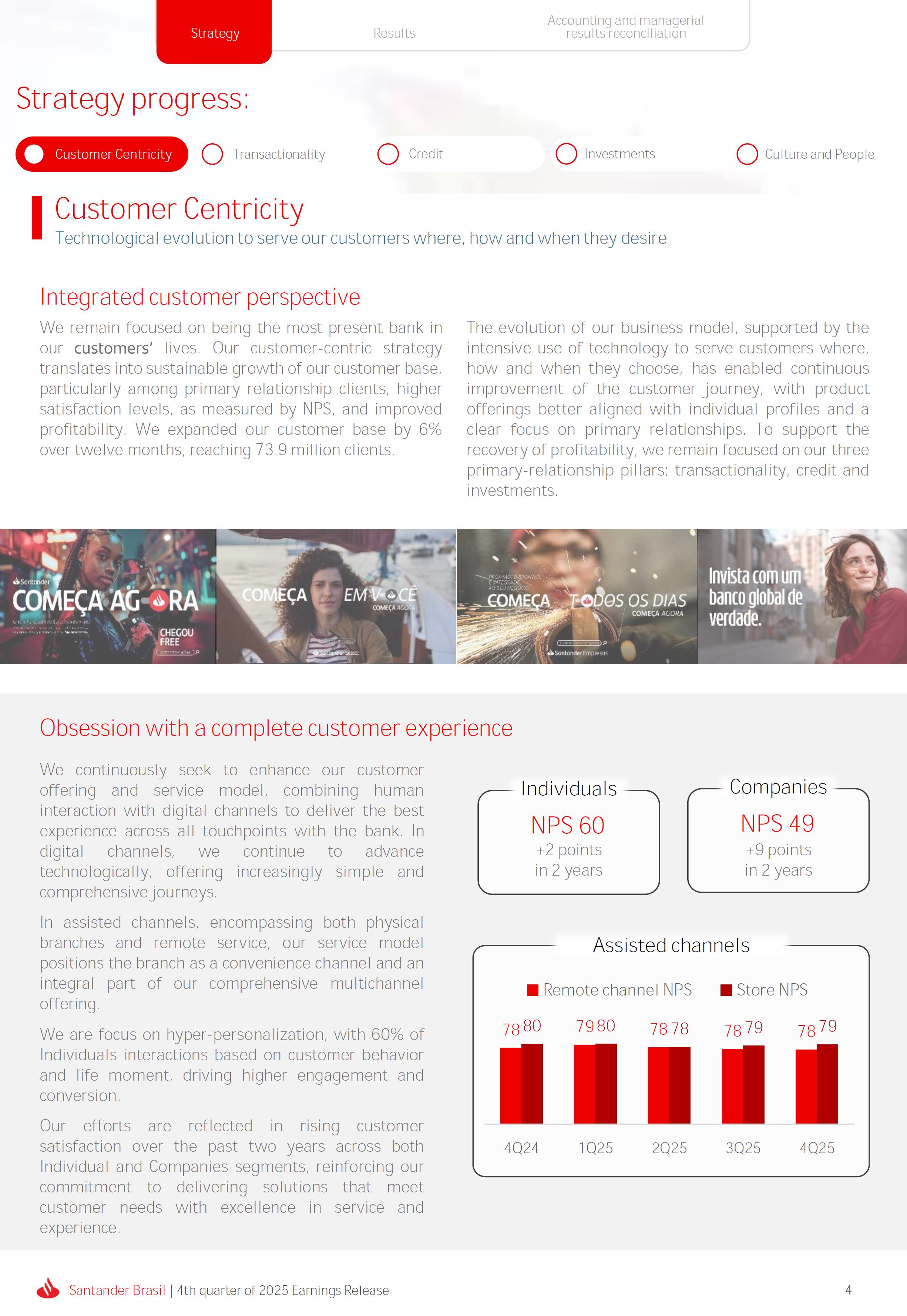 Earnings Release 4th quarter of 2025 (BRGAAP) www.santander.com.br/ri/en/ www.santander.com.br/ri/en/ Strategy highlights 3 Strategy progress 4 Customer centricity 4 Transactionality 5 Credit 6 Investments 7 Culture and People 8 Performance analysis 10 Executive summary 11 Income Statement and Balance Sheet Analysis 12 Managerial income statement 12 Net interest income 13 Fees 14 Result from loan losses 16 NPL Formation, write-off and renegotiated loan portfolio 17 Asset quality 18 Expenses 19 Other Operating Income and Expenses 20 Balance sheet 20 Loan portfolio 21 Funding 24 Capital 24 Reconciliation of accounting and managerial results 25 Fourth quarter 2025 Index 2 Santander Brasil | 4th quarter of 2025 Earnings Release Financial Highlights | 4Q25 Earnings Release of the 4thquarter of 2025 (BRGAAP) MARIO LEÃO CEO OF SANTANDER BRASIL Expanded Loan Portfolio R$ 708.2 billion (+2.8% QoQ and +3.7% YoY) Selective and balanced asset growth Expenses Disciplined cost management, with seasonal quarterly growth Cost of risk Stable, but still pressured by the macroeconomic environment Net Profit Net Interest Income R$ 15.3 billion (+0.8% QoQ and -4.0% YoY) Fees R$ 5.8billion(+3.6%QoQand+4.3%YoY) Diversified growth, representing key expansion pillar Client NII delivering solid performance and market NII had losses, as expected R$6.6billion(+3.3%QoQand-2.0%YoY) 3.76% (-0.1 p.p. QoQand+0.3 p.p. YoY) (+1.9% QoQ and +6.0% YoY) Funding from clients Evolution in the funding mix, with a focus on Individuals R$ 670.4billion(+1.7%QoQand+3.9%YoY) WeclosedthequarterwithanetprofitofR$4.1billion,thehighestquarterlyprofitinthepastfouryears,andareturnonequityof17.6%,inlinewith3Q25.Theseresultsreflecttheconsistencyofourstrategicexecutionandreinforceourambitiontobetheleadingfinancialplatforminourcustomers’lives,thebankeachcustomerchooseseveryday,thatsupportsclientsattheirbeginnings,the#ComeçaAgorabank,andthattreatseverycustomerasaprimaryanduniqueclient.Wecontinuetomakesteadyprogressinbuildinganincreasinglydiversified,resilientandprofitableoperation,wellpositionedtogrowsustainablyovertime. In4Q25,wemaintainedstrictdisciplineincapitalallocation,withselectiveandbalancedgrowthacrossourassets.Ontheliabilityside,wecontinuedtodiversifyourfundingmix,reducingfundingcoststhroughahigherIndividualsshareinthefundingmix.Assetqualityremainspressuredbythemacroeconomicenvironment;however,wecontinuetooperatewithprudence,disciplineandactiveriskmanagement.Intermsofefficiency,weremaincommittedtorigorouscostmanagementwhich,combinedwiththeintensiveuseoftechnology,hasallowedustoincreaseproductivityandcapturestructuralgains. Weremainrelentlesslyfocusedonexcellenceincustomerservice,experienceandjourney,acentralpillarofourstrategy,offeringsolutionsthatarerelevanttoeachbusinesscontextandeachlifemoment.Leveragingthestrengthofourintegratedchannelsandtheintensiveuseofartificialintelligence,dataandanalytics,wehaveexpandedourabilitytounderstandandengagewitheachcustomerinanincreasinglypersonalizedway.Thisyear,wehighlightthelaunchofOneApp,amulti-banksolutionbuiltoncustomerfeedback,deliveringasimple,intuitiveandeffectiveexperience.Wehavealsocontinuedtotransformthepaymentsjourney,unifyingtransfersandpaymentsinasingleenvironment,bringinggreaterfluidityandconvenience. Wemadefurtherprogressacrossourstrategicbusinesses,(i)inConsumerFinance,wecontinuedtostrengthenacomprehensiveecosystem,deliveringsolutionsthatgenerateincreasingvalueforcustomers,expandingcross-sellingandacceleratingfeegeneration,supportedbyhighsatisfactionlevels;(ii)inSMEs,wereaffirmedourcommitmenttobeingclosetoourcustomers,movingbeyondthebanktobepresentintheirbusinesses,withcomprehensiveandpersonalizedsolutionsthatprioritizetheprimaryrelationship,translatingintohighertransactionality,productivityandprofitability;and(iii)ininvestments,TorobecameSantanderCorretorathisquarter,reinforcingourpositioningandourinvestmentecosystem. Additionally,wecontinuedtoadvanceourglobalplatformagendainclosecollaborationwiththeGroup,combiningexpertise,strategyandinvestmentstodeliversimpler,moreefficientandagilesolutionstobetterservethosewhomatterthemost:ourcustomers. Weenter2026evenbetterpreparedtomeetourcustomers’needswithexcellenceandinnovation.WeremainonapathofconsistentROAEevolution,withastrongfocusonresultsanddisciplinedmanagement,guidedbydisciplinedcapitalallocation,ourstrategicpillarsandcontinuoustransformationalongsideourcustomers,employees,shareholdersandsociety. R$ 4.1billion ROAE 17.6% (Stable QoQ and -0.1 p.p. YoY) Santander Brasil | 4th quarter of 2025 Earnings Release 3 Wecontinuouslyseektoenhanceourcustomerofferingandservicemodel,combininghumaninteractionwithdigitalchannelstodeliverthebestexperienceacrossalltouchpointswiththebank.Indigitalchannels,wecontinuetoadvancetechnologically,offeringincreasinglysimpleandcomprehensivejourneys. Inassistedchannels,encompassingbothphysicalbranchesandremoteservice,ourservicemodelpositionsthebranchasaconveniencechannelandanintegralpartofourcomprehensivemultichanneloffering. Wearefocusonhyper-personalization,with60%ofIndividualsinteractionsbasedoncustomerbehaviorandlifemoment,drivinghigherengagementandconversion. OureffortsarereflectedinrisingcustomersatisfactionoverthepasttwoyearsacrossbothIndividualandCompaniessegments,reinforcingourcommitmenttodeliveringsolutionsthatmeetcustomerneedswithexcellenceinserviceandexperience. Integrated customer perspective Obsession with a complete customer experience 4 Weremainfocusedonbeingthemostpresentbankinourcustomers’lives.Ourcustomer-centricstrategytranslatesintosustainablegrowthofourcustomerbase,particularlyamongprimaryrelationshipclients,highersatisfactionlevels,asmeasuredbyNPS,andimprovedprofitability.Weexpandedourcustomerbaseby6%overtwelvemonths,reaching73.9millionclients. Theevolutionofourbusinessmodel,supportedbytheintensiveuseoftechnologytoservecustomerswhere,howandwhentheychoose,hasenabledcontinuousimprovementofthecustomerjourney,withproductofferingsbetteralignedwithindividualprofilesandaclearfocusonprima