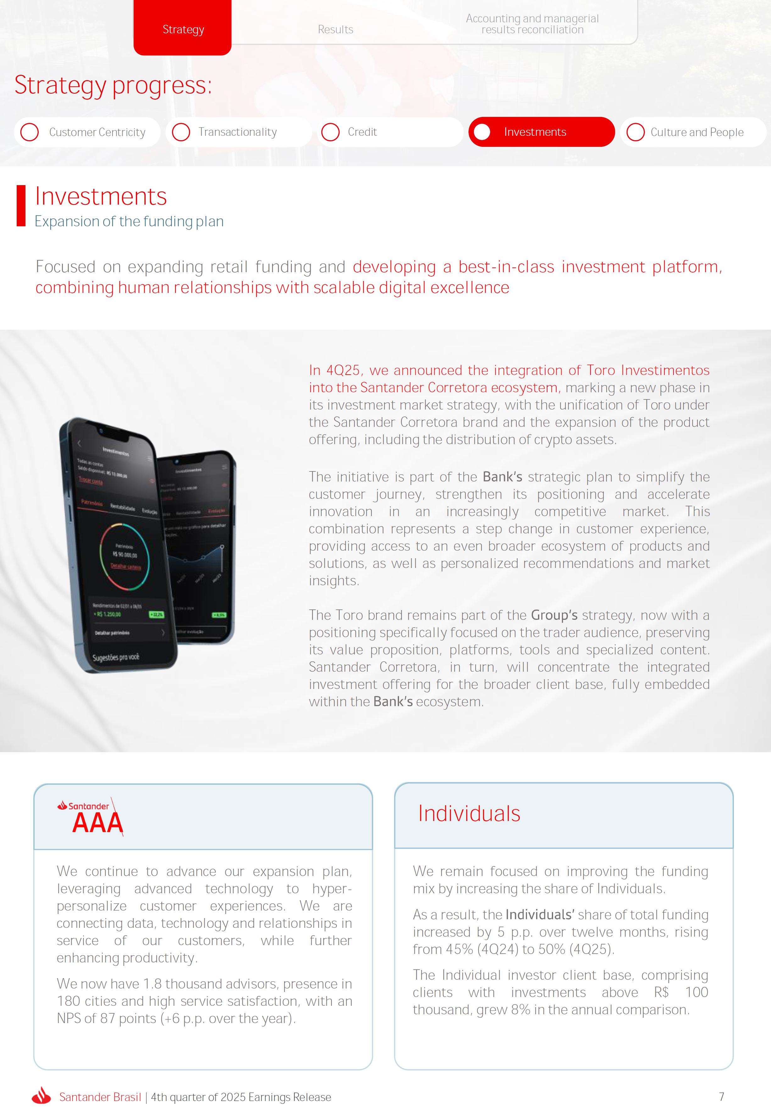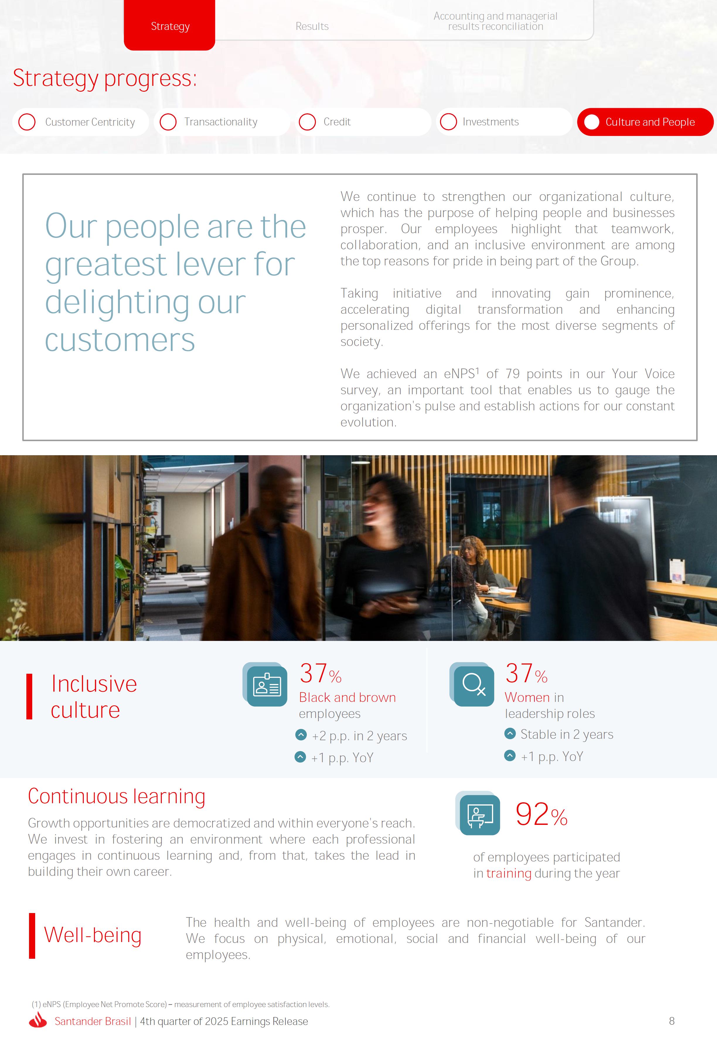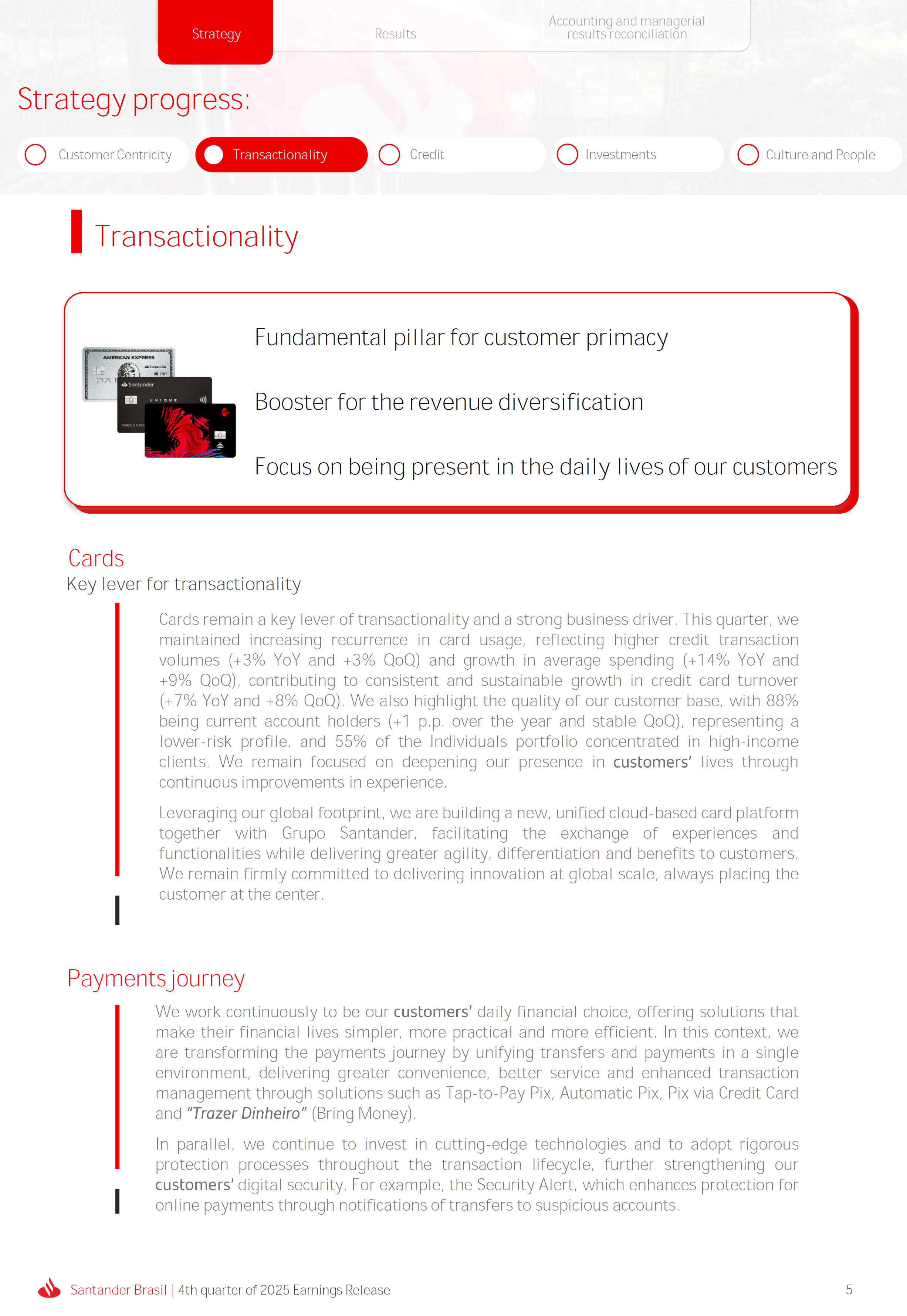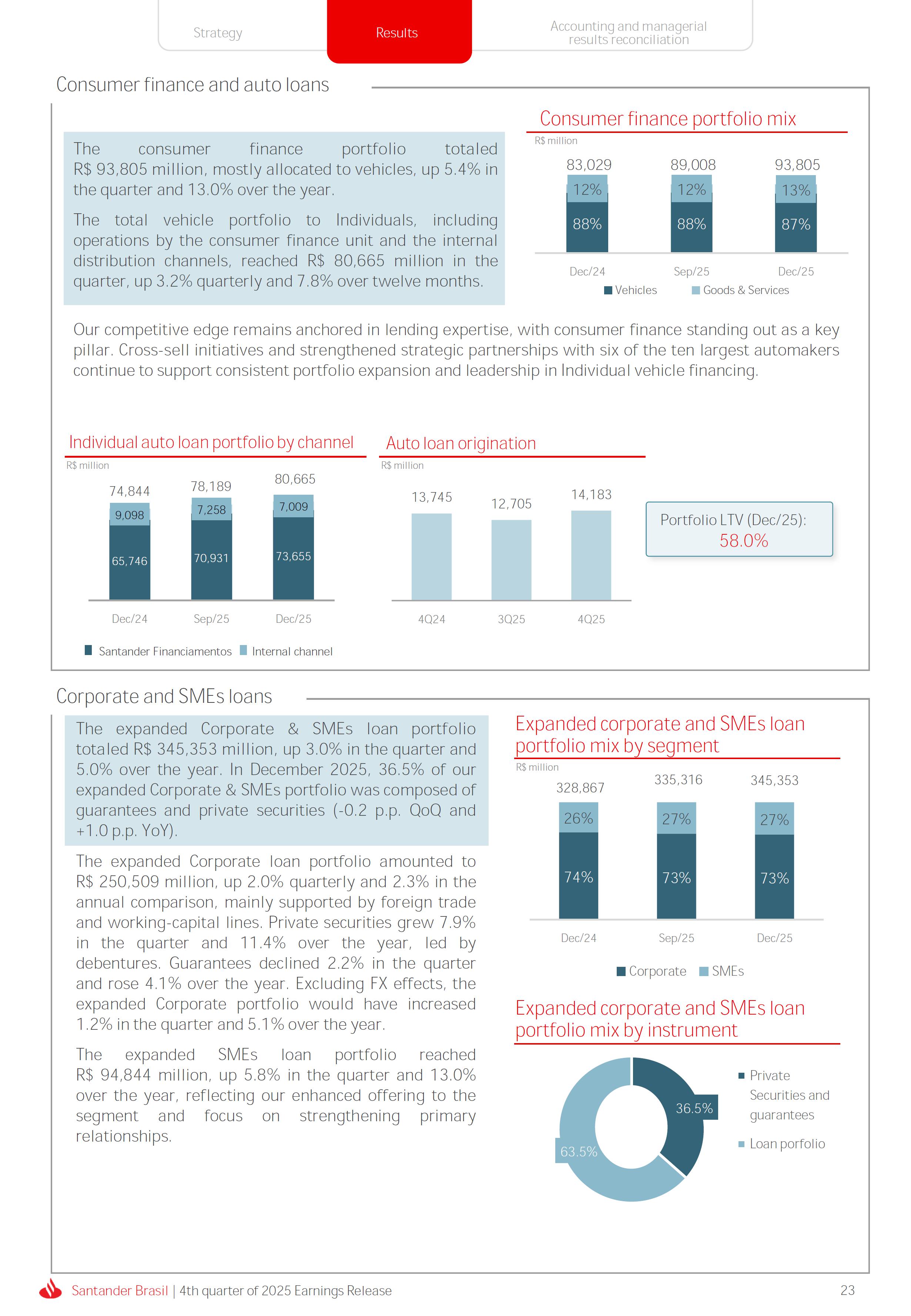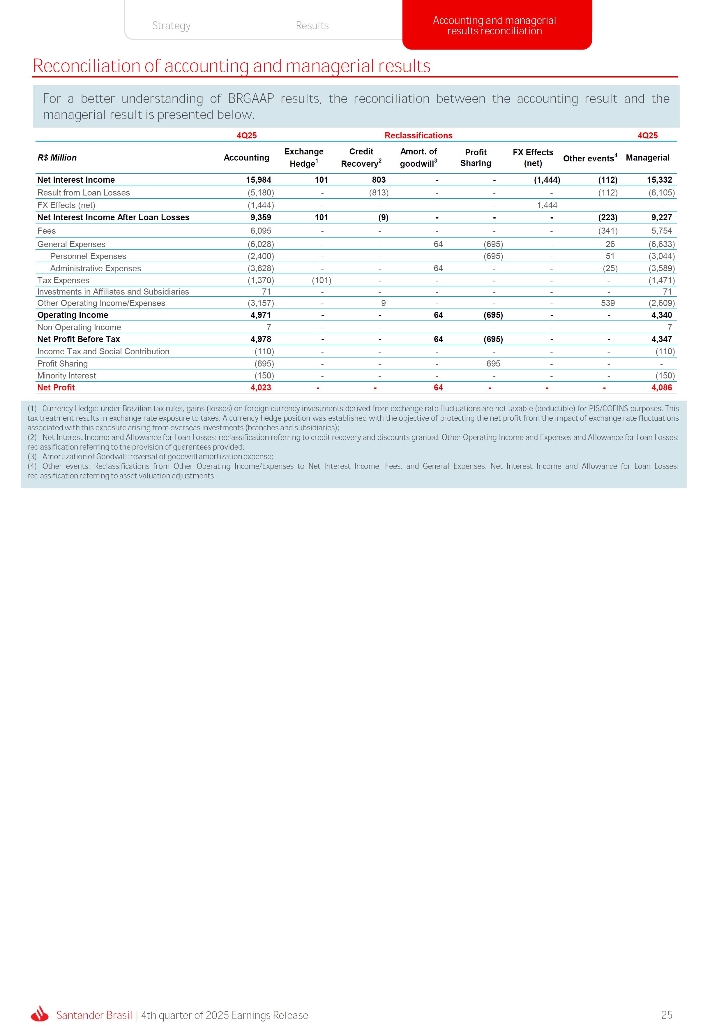Earnings Release 4th quarter of 2025 (BRGAAP) www.santander.com.br/ri/en/ www.santander.com.br/ri/en/ Strategy highlights 3 Strategy progress 4 Customer centricity 4 Transactionality 5 Credit 6 Investments 7 Culture and People 8 Performance analysis 10 Executive summary 11 Income Statement and Balance Sheet Analysis 12 Managerial income statement 12 Net interest income 13 Fees 14 Result from loan losses 16 NPL Formation, write-off and renegotiated loan portfolio 17 Asset quality 18 Expenses 19 Other Operating Income and Expenses 20 Balance sheet 20 Loan portfolio 21 Funding 24 Capital 24 Reconciliation of accounting and managerial results 25 Fourth quarter 2025 Index 2 Santander Brasil | 4th quarter of 2025 Earnings Release Financial Highlights | 4Q25 Earnings Release of the 4thquarter of 2025 (BRGAAP) MARIO LEÃO CEO OF SANTANDER BRASIL Expanded Loan Portfolio R$ 708.2 billion (+2.8% QoQ and +3.7% YoY) Selective and balanced asset growth Expenses Disciplined cost management, with seasonal quarterly growth Cost of risk Stable, but still pressured by the macroeconomic environment Net Profit Net Interest Income R$ 15.3 billion (+0.8% QoQ and -4.0% YoY) Fees R$ 5.8billion(+3.6%QoQand+4.3%YoY) Diversified growth, representing key expansion pillar Client NII delivering solid performance and market NII had losses, as expected R$6.6billion(+3.3%QoQand-2.0%YoY) 3.76% (-0.1 p.p. QoQand+0.3 p.p. YoY) (+1.9% QoQ and +6.0% YoY) Funding from clients Evolution in the funding mix, with a focus on Individuals R$ 670.4billion(+1.7%QoQand+3.9%YoY) WeclosedthequarterwithanetprofitofR$4.1billion,thehighestquarterlyprofitinthepastfouryears,andareturnonequityof17.6%,inlinewith3Q25.Theseresultsreflecttheconsistencyofourstrategicexecutionandreinforceourambitiontobetheleadingfinancialplatforminourcustomers’lives,thebankeachcustomerchooseseveryday,thatsupportsclientsattheirbeginnings,the#ComeçaAgorabank,andthattreatseverycustomerasaprimaryanduniqueclient.Wecontinuetomakesteadyprogressinbuildinganincreasinglydiversified,resilientandprofitableoperation,wellpositionedtogrowsustainablyovertime. In4Q25,wemaintainedstrictdisciplineincapitalallocation,withselectiveandbalancedgrowthacrossourassets.Ontheliabilityside,wecontinuedtodiversifyourfundingmix,reducingfundingcoststhroughahigherIndividualsshareinthefundingmix.Assetqualityremainspressuredbythemacroeconomicenvironment;however,wecontinuetooperatewithprudence,disciplineandactiveriskmanagement.Intermsofefficiency,weremaincommittedtorigorouscostmanagementwhich,combinedwiththeintensiveuseoftechnology,hasallowedustoincreaseproductivityandcapturestructuralgains. Weremainrelentlesslyfocusedonexcellenceincustomerservice,experienceandjourney,acentralpillarofourstrategy,offeringsolutionsthatarerelevanttoeachbusinesscontextandeachlifemoment.Leveragingthestrengthofourintegratedchannelsandtheintensiveuseofartificialintelligence,dataandanalytics,wehaveexpandedourabilitytounderstandandengagewitheachcustomerinanincreasinglypersonalizedway.Thisyear,wehighlightthelaunchofOneApp,amulti-banksolutionbuiltoncustomerfeedback,deliveringasimple,intuitiveandeffectiveexperience.Wehavealsocontinuedtotransformthepaymentsjourney,unifyingtransfersandpaymentsinasingleenvironment,bringinggreaterfluidityandconvenience. Wemadefurtherprogressacrossourstrategicbusinesses,(i)inConsumerFinance,wecontinuedtostrengthenacomprehensiveecosystem,deliveringsolutionsthatgenerateincreasingvalueforcustomers,expandingcross-sellingandacceleratingfeegeneration,supportedbyhighsatisfactionlevels;(ii)inSMEs,wereaffirmedourcommitmenttobeingclosetoourcustomers,movingbeyondthebanktobepresentintheirbusinesses,withcomprehensiveandpersonalizedsolutionsthatprioritizetheprimaryrelationship,translatingintohighertransactionality,productivityandprofitability;and(iii)ininvestments,TorobecameSantanderCorretorathisquarter,reinforcingourpositioningandourinvestmentecosystem. Additionally,wecontinuedtoadvanceourglobalplatformagendainclosecollaborationwiththeGroup,combiningexpertise,strategyandinvestmentstodeliversimpler,moreefficientandagilesolutionstobetterservethosewhomatterthemost:ourcustomers. Weenter2026evenbetterpreparedtomeetourcustomers’needswithexcellenceandinnovation.WeremainonapathofconsistentROAEevolution,withastrongfocusonresultsanddisciplinedmanagement,guidedbydisciplinedcapitalallocation,ourstrategicpillarsandcontinuoustransformationalongsideourcustomers,employees,shareholdersandsociety. R$ 4.1billion ROAE 17.6% (Stable QoQ and -0.1 p.p. YoY) Santander Brasil | 4th quarter of 2025 Earnings Release 3 Wecontinuouslyseektoenhanceourcustomerofferingandservicemodel,combininghumaninteractionwithdigitalchannelstodeliverthebestexperienceacrossalltouchpointswiththebank.Indigitalchannels,wecontinuetoadvancetechnologically,offeringincreasinglysimpleandcomprehensivejourneys. Inassistedchannels,encompassingbothphysicalbranchesandremoteservice,ourservicemodelpositionsthebranchasaconveniencechannelandanintegralpartofourcomprehensivemultichanneloffering. Wearefocusonhyper-personalization,with60%ofIndividualsinteractionsbasedoncustomerbehaviorandlifemoment,drivinghigherengagementandconversion. OureffortsarereflectedinrisingcustomersatisfactionoverthepasttwoyearsacrossbothIndividualandCompaniessegments,reinforcingourcommitmenttodeliveringsolutionsthatmeetcustomerneedswithexcellenceinserviceandexperience. Integrated customer perspective Obsession with a complete customer experience 4 Weremainfocusedonbeingthemostpresentbankinourcustomers’lives.Ourcustomer-centricstrategytranslatesintosustainablegrowthofourcustomerbase,particularlyamongprimaryrelationshipclients,highersatisfactionlevels,asmeasuredbyNPS,andimprovedprofitability.Weexpandedourcustomerbaseby6%overtwelvemonths,reaching73.9millionclients. Theevolutionofourbusinessmodel,supportedbytheintensiveuseoftechnologytoservecustomerswhere,howandwhentheychoose,hasenabledcontinuousimprovementofthecustomerjourney,withproductofferingsbetteralignedwithindividualprofilesandaclearfocusonprima