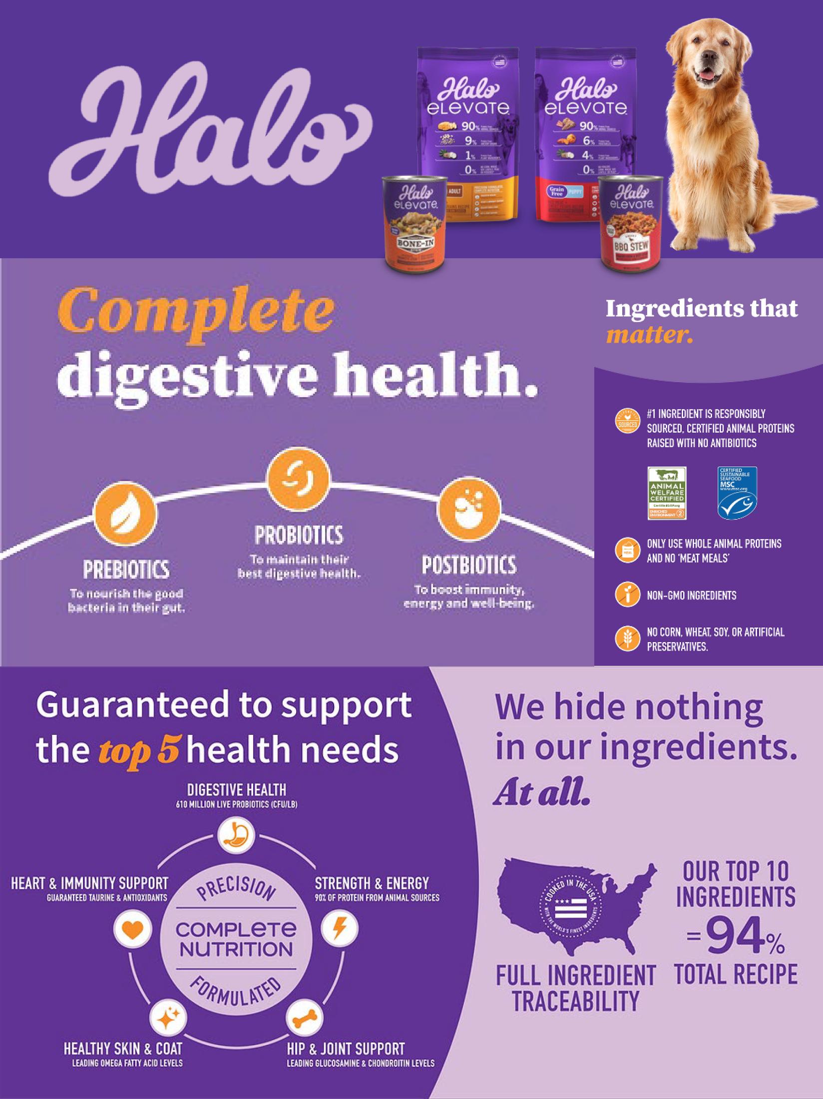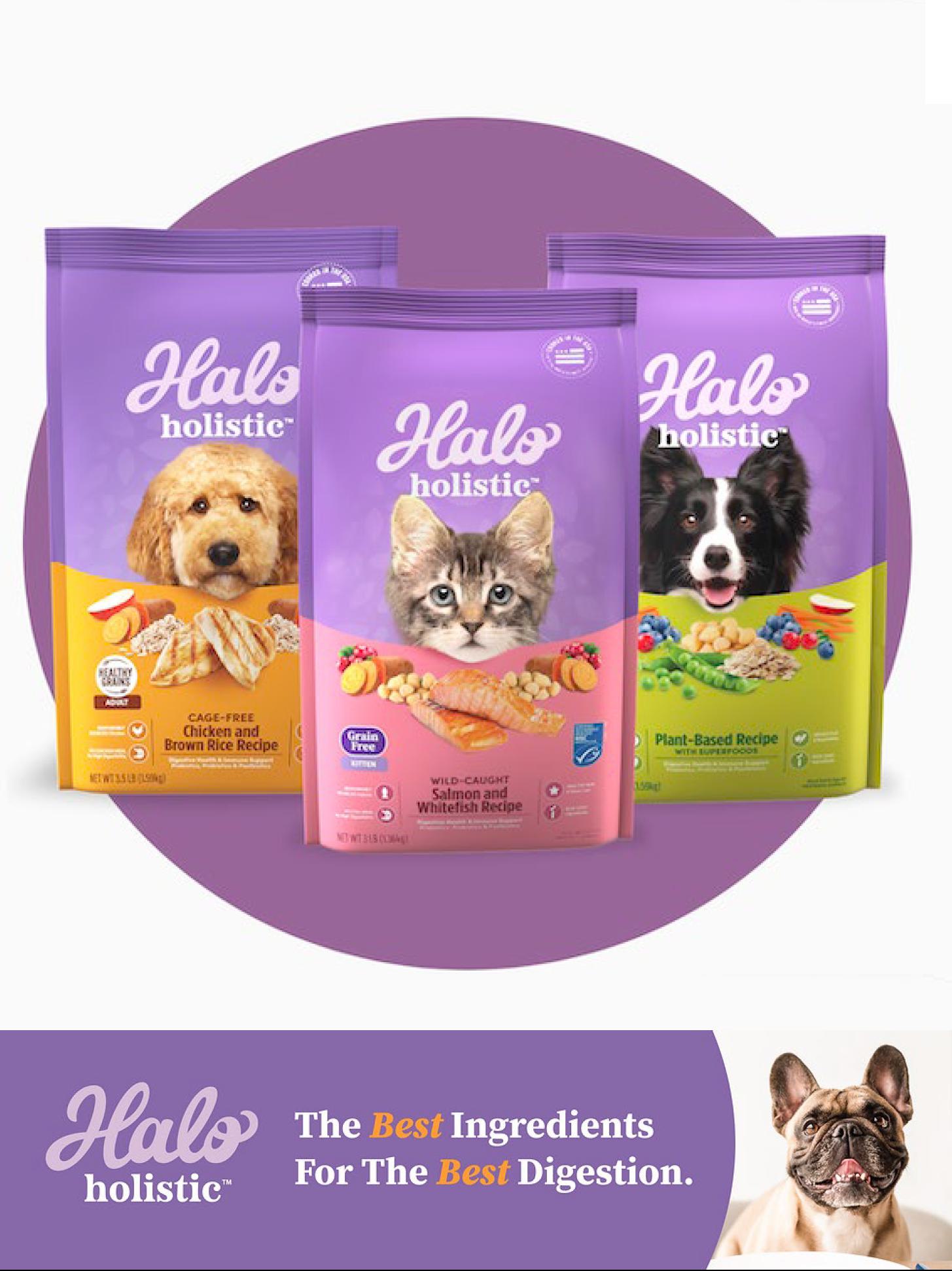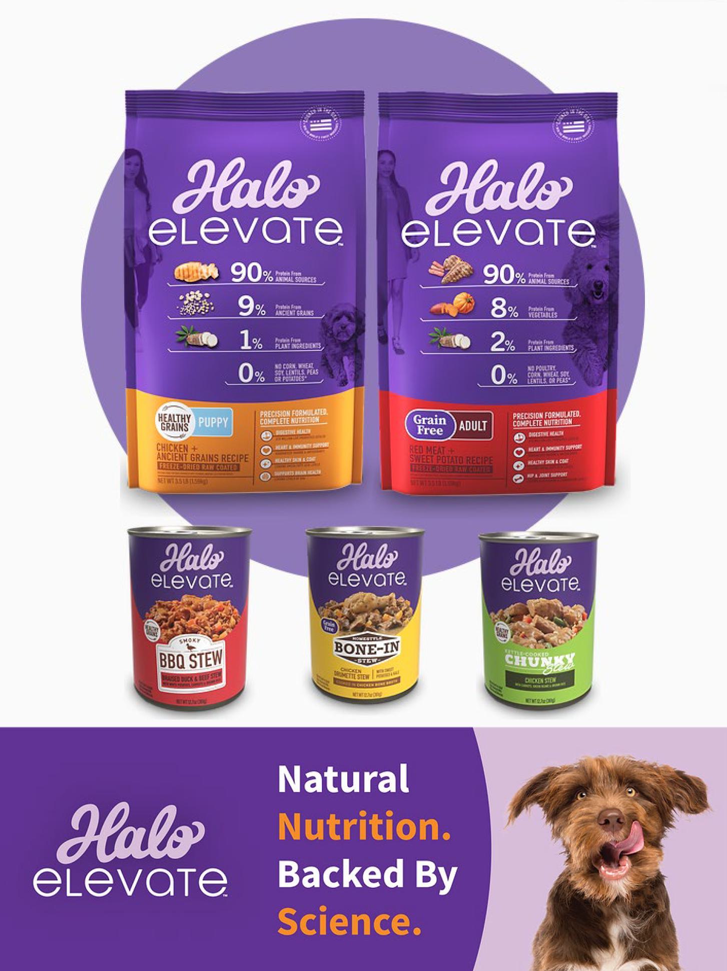 The Halo portfolio offers a variety of platforms through which to innovate. Halo Holistic™ is designed for the pet parent seeking complete digestive health with prebiotics, probiotics and postbiotics. Additionally, it’s one of the only brands made with only whole animal proteins and no meat meals. Halo Elevate®, features leading nutrient levels supporting the top five pet parent health concerns including digestive health, heart and immunity support, healthy skin and coat, hip and joint support and strength and energy. Halo Freeze Dried Raw recipes preserve the natural flavor and nutrition of raw food with 100% protein from natural sources.