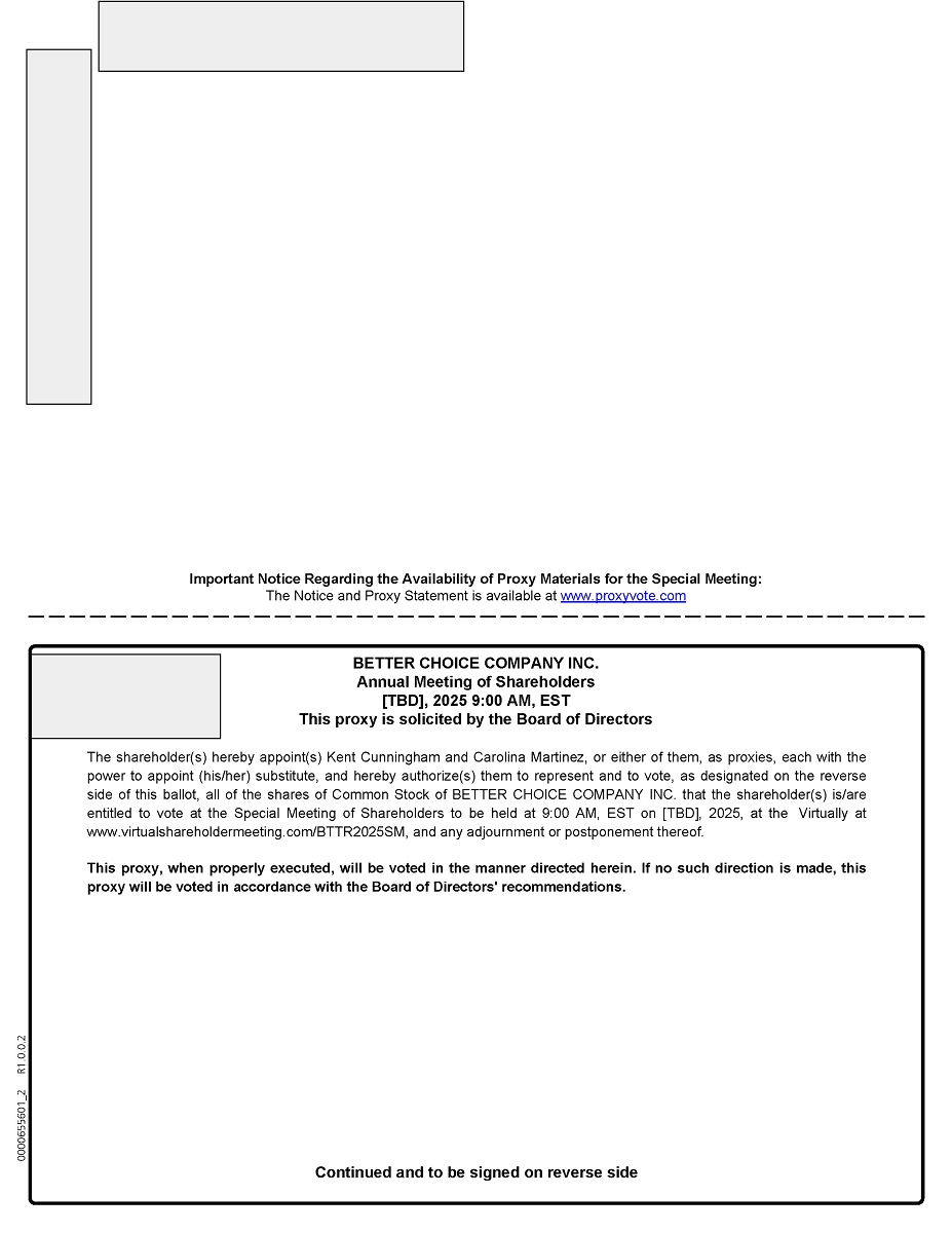 The Board of Directors of Better Choice (the “Better Choice Board”) is soliciting your proxy to vote at the Special Meeting to be held on , 2025, at 9:00 a.m. Eastern Time, in a virtual online format by accessing [insert URL] and at any adjournment thereof.
