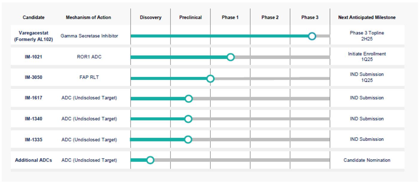 We are advancing a pipeline comprising one clinical, one IND-cleared and four preclinical assets. Varegacestat, formerly AL-102, is an investigational gamma secretase inhibitor (GSI) currently under evaluation in a Phase 3 trial for the treatment of desmoid tumors. Our investigational new drug application (IND) for IM-1021, a receptor tyrosine kinase-like orphan receptor 1 (ROR1) antibody-drug conjugate (ADC) received clearance in December 2024, and we expect to initiate a phase 1 trial in the first quarter of 2025. Our other preclinical assets include IM-3050, a fibroblast activation protein (FAP) targeted radioligand therapy (RLT), for which we anticipate submitting an IND in the first quarter of 2025, and three solid tumor ADC potential drug candidates: IM-1617, IM-1340, and IM-1335, all of which are in IND-enabling manufacturing. We also have six additional ADCs currently undergoing lead optimization with development decisions expected later this year and into 2026.