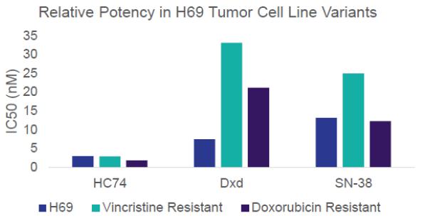 In addition to our pipeline assets, our proprietary payload topoisomerase 1 (TOP1) inhibitor, HC74, supports development of ADCs for novel targets. TOP1 inhibitors are validated ADC payloads, and ADCs with TOP1 inhibitors have been shown to achieve higher drug-to-antibody ratios and higher clinical doses than ADCs with microtubule inhibitor payloads. HC74 retains that mechanism of action while showing properties superior to DXd, the TOP1 inhibitor incorporated into Enhertu. Specifically, HC74 has demonstrated superior potency measured across 89 cell lines. It also retains potency in chemo-resistant cell lines. We also believe HC74’s increased permeability may lead to superior bystander effect, and that its rapid hepatocyte clearance may improve tolerability.