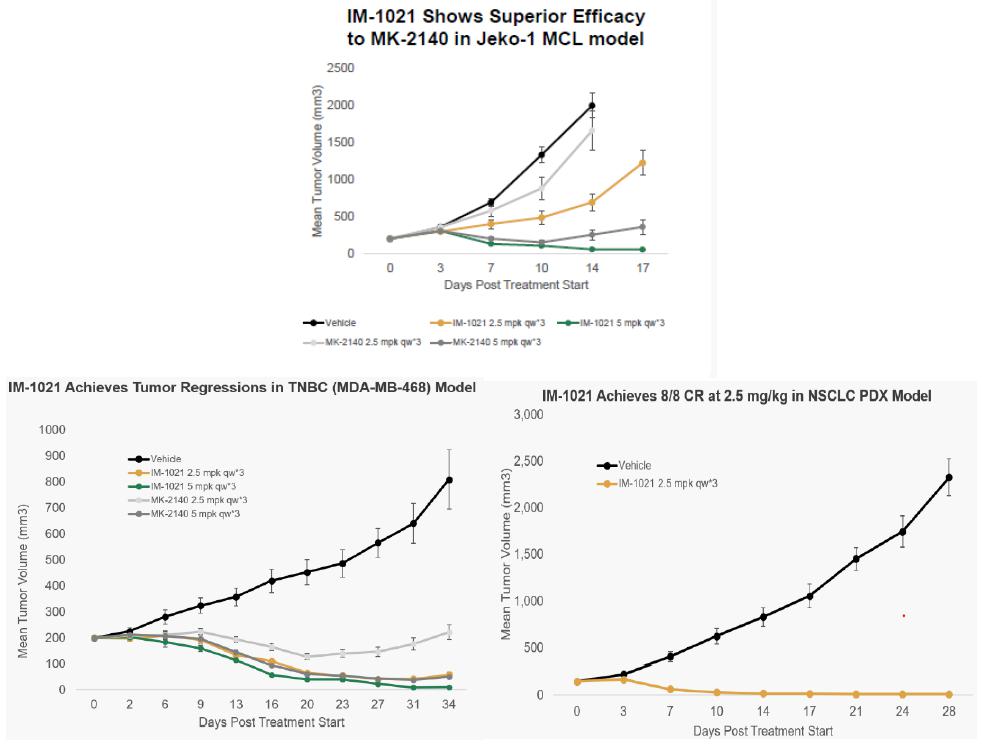 IM-1021 is an ROR1 ADC that received IND clearance in December 2024. IM-1021 incorporates HC74, which is designed to target both lymphoma and solid tumors. IM-1021 showed superior efficacy to MK-2140 in the Jeko-1 mantle cell lymphoma (MCL) model and solid tumor models in preclinical studies.