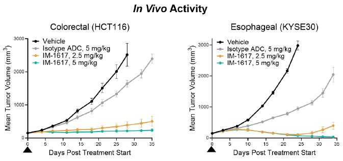 IM-1617 incorporates a proprietary antibody that was selected for attributes that may drive tumor binding while minimizing normal tissue binding; a cleavable, undisclosed linker; and HC74. An initial study in non-human primates (NHPs) found a highest non-severely toxic dose of 40 mg/kg, indicating a potentially robust therapeutic window. Preclinical in vivo efficacy studies have shown tumor regression after a single, clinically relevant dose of IM-1617 in tumor models derived from melanoma, esophageal cancer, CRC, NSCLC, and other carcinomas. IND-enabling work for IM-1617 was initiated in the fourth quarter of 2024.