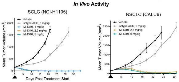 It incorporates a proprietary antibody selected for attributes that drive tumor binding while minimizing normal tissue binding; a cleavable, undisclosed linker; and HC74. IM-1340 has shown robust preclinical efficacy, with evidence of regressions following a single 1 mg/kg dose in in vivo tumor models representing NETs (SCLC) and carcinomas (e.g., NSCLC, pancreatic, and prostate cancer). An initial study in NHPs found a highest non-severely toxic dose of 40 mg/kg, indicating potential for a robust therapeutic window. IND-enabling work for IM-1340 was initiated in the fourth quarter of 2024.