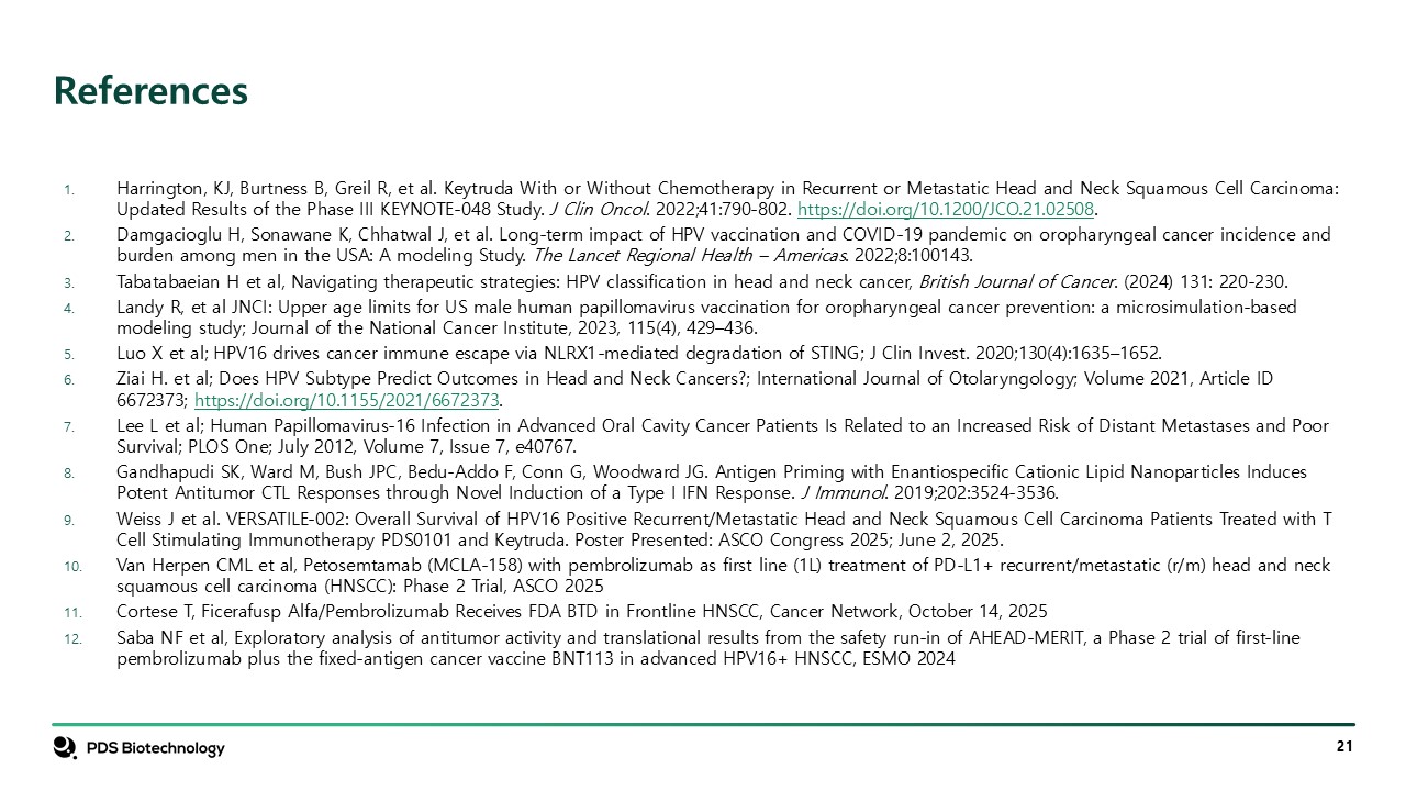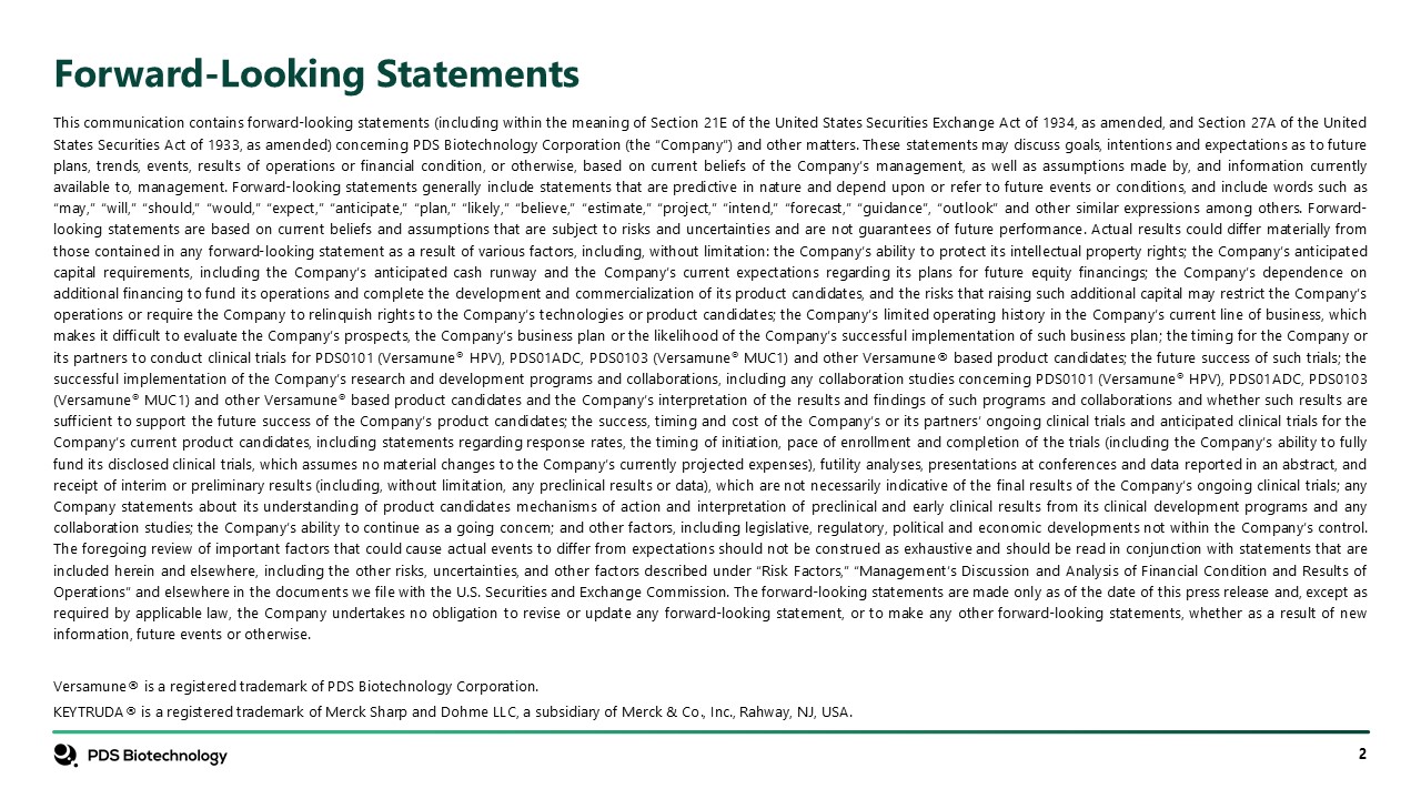 forward-looking statement, or to make any other forward-looking statements, whether as a result of new information, future events or otherwise. Versamune® is a registered trademark of PDS Biotechnology Corporation. KEYTRUDA® is a