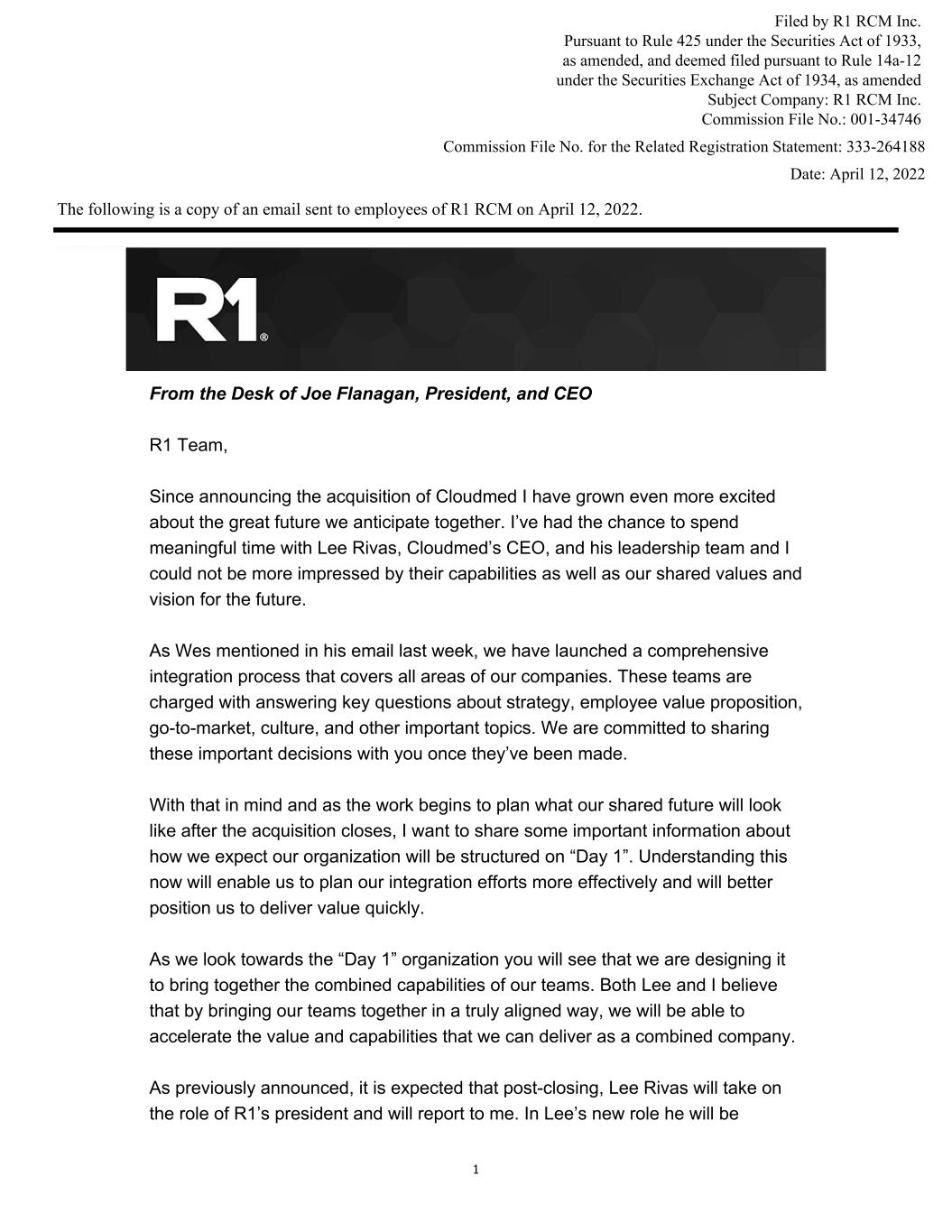 1 Since announcing the acquisition of Cloudmed I have grown even more excited about the great future we anticipate together... From the Desk of Joe Flanagan, President, and CEO R1 Team, Since announcing the acquisition of Cloudmed I have grown even more excited about the great future we anticipate together. I’ve had the chance to spend meaningful time with Lee Rivas, Cloudmed’s CEO, and his leadership team and I could not be more impressed by their capabilities as well as our shared values and vision for the future. As Wes mentioned in his email last week, we have launched a comprehensive integration process that covers all areas of our companies. These teams are charged with answering key questions about strategy, employee value proposition, go-to-market, culture, and other important topics. We are committed to sharing these important decisions with you once they’ve been made. With that in mind and as the work begins to plan what our shared future will look like after the acquisition closes, I want to share some important information about how we expect our organization will be structured on “Day 1”. Understanding this now will enable us to plan our integration efforts more effectively and will better position us to deliver value quickly. As we look towards the “Day 1” organization you will see that we are designing it to bring together the combined capabilities of our teams. Both Lee and I believe that by bringing our teams together in a truly aligned way, we will be able to accelerate the value and capabilities that we can deliver as a combined company. As previously announced, it is expected that post-closing, Lee Rivas will take on the role of R1’s president and will report to me. In Lee’s new role he will be Filed by R1 RCM Inc. Pursuant to Rule 425 under the Securities Act of 1933, as amended, and deemed filed pursuant to Rule 14a-12 under the Securities Exchange Act of 1934, as amended Subject Company: R1 RCM Inc. Commission File No.: 001-34746 Commission File No. for the Related Registration Statement: 333-264188 Date: April 12, 2022 The following is a copy of an email sent to employees of R1 RCM on April 12, 2022.