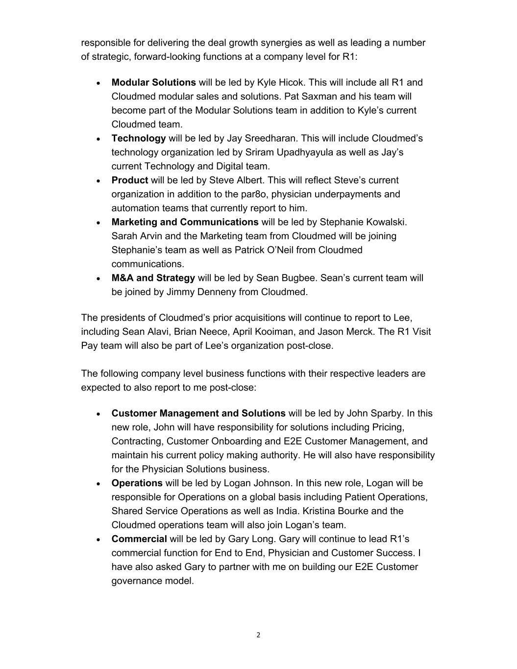 2 responsible for delivering the deal growth synergies as well as leading a number of strategic, forward-looking functions at a company level for R1: Modular Solutions will be led by Kyle Hicok. This will include all R1 and Cloudmed modular sales and solutions. Pat Saxman and his team will become part of the Modular Solutions team in addition to Kyle’s current Cloudmed team. Technology will be led by Jay Sreedharan. This will include Cloudmed’s technology organization led by Sriram Upadhyayula as well as Jay’s current Technology and Digital team. Product will be led by Steve Albert. This will reflect Steve’s current organization in addition to the par8o, physician underpayments and automation teams that currently report to him. Marketing and Communications will be led by Stephanie Kowalski. Sarah Arvin and the Marketing team from Cloudmed will be joining Stephanie’s team as well as Patrick O’Neil from Cloudmed communications. M&A and Strategy will be led by Sean Bugbee. Sean’s current team will be joined by Jimmy Denneny from Cloudmed. The presidents of Cloudmed’s prior acquisitions will continue to report to Lee, including Sean Alavi, Brian Neece, April Kooiman, and Jason Merck. The R1 Visit Pay team will also be part of Lee’s organization post-close. The following company level business functions with their respective leaders are expected to also report to me post-close: Customer Management and Solutions will be led by John Sparby. In this new role, John will have responsibility for solutions including Pricing, Contracting, Customer Onboarding and E2E Customer Management, and maintain his current policy making authority. He will also have responsibility for the Physician Solutions business. Operations will be led by Logan Johnson. In this new role, Logan will be responsible for Operations on a global basis including Patient Operations, Shared Service Operations as well as India. Kristina Bourke and the Cloudmed operations team will also join Logan’s team. Commercial will be led by Gary Long. Gary will continue to lead R1’s commercial function for End to End, Physician and Customer Success. I have also asked Gary to partner with me on building our E2E Customer governance model.