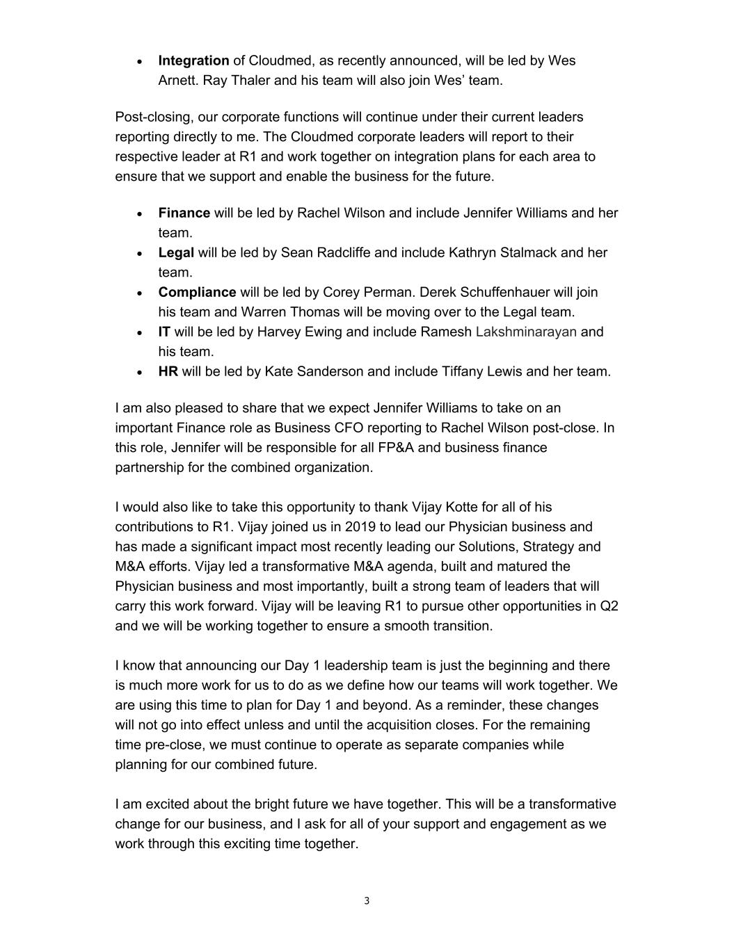 3 Integration of Cloudmed, as recently announced, will be led by Wes Arnett. Ray Thaler and his team will also join Wes’ team. Post-closing, our corporate functions will continue under their current leaders reporting directly to me. The Cloudmed corporate leaders will report to their respective leader at R1 and work together on integration plans for each area to ensure that we support and enable the business for the future. Finance will be led by Rachel Wilson and include Jennifer Williams and her team. Legal will be led by Sean Radcliffe and include Kathryn Stalmack and her team. Compliance will be led by Corey Perman. Derek Schuffenhauer will join his team and Warren Thomas will be moving over to the Legal team. IT will be led by Harvey Ewing and include Ramesh Lakshminarayan and his team. HR will be led by Kate Sanderson and include Tiffany Lewis and her team. I am also pleased to share that we expect Jennifer Williams to take on an important Finance role as Business CFO reporting to Rachel Wilson post-close. In this role, Jennifer will be responsible for all FP&A and business finance partnership for the combined organization. I would also like to take this opportunity to thank Vijay Kotte for all of his contributions to R1. Vijay joined us in 2019 to lead our Physician business and has made a significant impact most recently leading our Solutions, Strategy and M&A efforts. Vijay led a transformative M&A agenda, built and matured the Physician business and most importantly, built a strong team of leaders that will carry this work forward. Vijay will be leaving R1 to pursue other opportunities in Q2 and we will be working together to ensure a smooth transition. I know that announcing our Day 1 leadership team is just the beginning and there is much more work for us to do as we define how our teams will work together. We are using this time to plan for Day 1 and beyond. As a reminder, these changes will not go into effect unless and until the acquisition closes. For the remaining time pre-close, we must continue to operate as separate companies while planning for our combined future. I am excited about the bright future we have together. This will be a transformative change for our business, and I ask for all of your support and engagement as we work through this exciting time together.