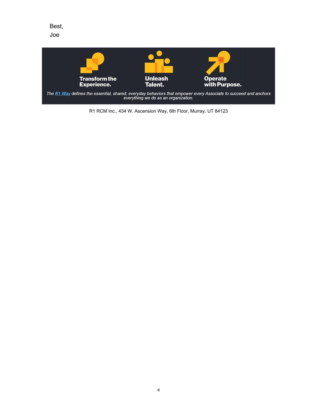 4 Best, Joe R1 RCM Inc., 434 W. Ascension Way, 6th Floor, Murray, UT 84123