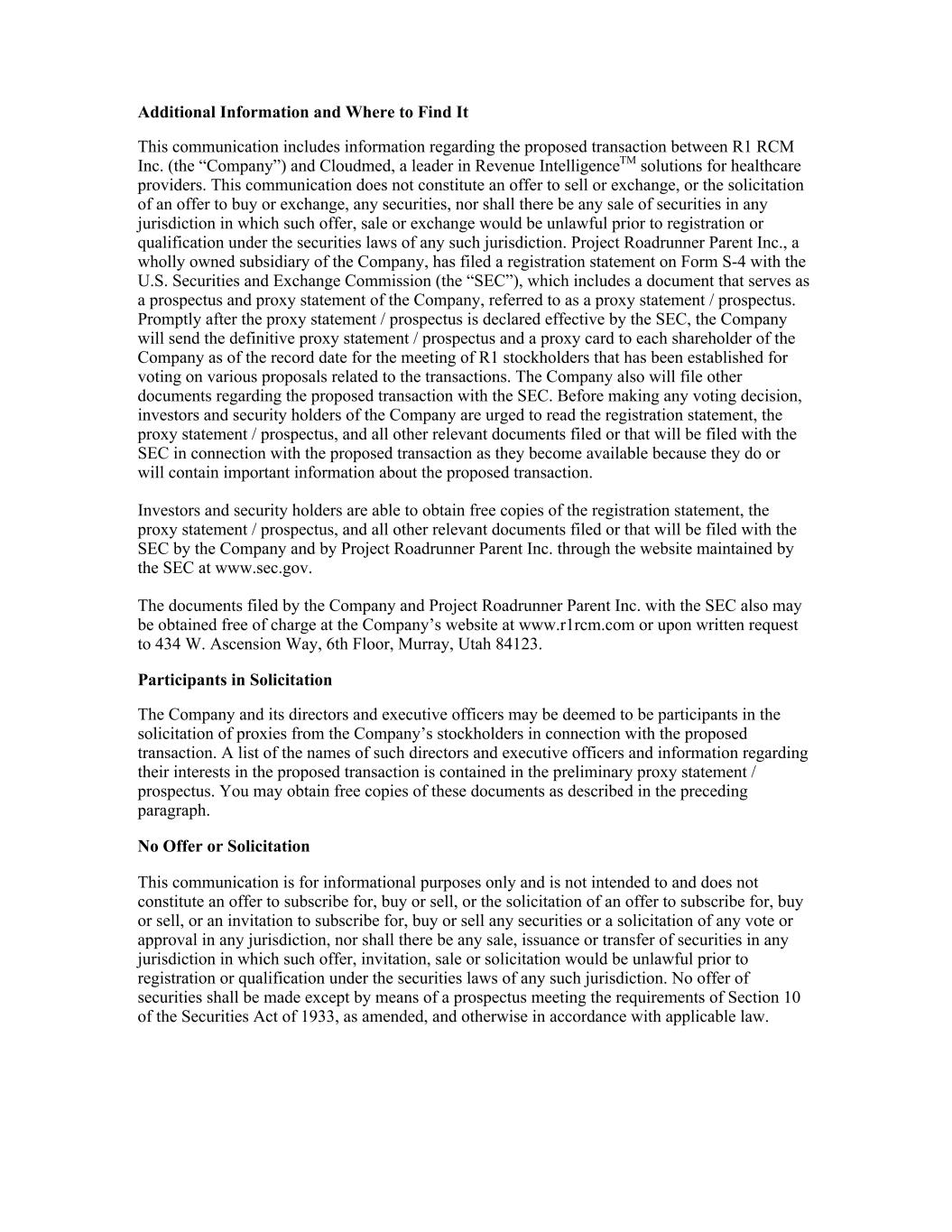Additional Information and Where to Find It This communication includes information regarding the proposed transaction between R1 RCM Inc. (the “Company”) and Cloudmed, a leader in Revenue IntelligenceTM solutions for healthcare providers. This communication does not constitute an offer to sell or exchange, or the solicitation of an offer to buy or exchange, any securities, nor shall there be any sale of securities in any jurisdiction in which such offer, sale or exchange would be unlawful prior to registration or qualification under the securities laws of any such jurisdiction. Project Roadrunner Parent Inc., a wholly owned subsidiary of the Company, has filed a registration statement on Form S-4 with the U.S. Securities and Exchange Commission (the “SEC”), which includes a document that serves as a prospectus and proxy statement of the Company, referred to as a proxy statement / prospectus. Promptly after the proxy statement / prospectus is declared effective by the SEC, the Company will send the definitive proxy statement / prospectus and a proxy card to each shareholder of the Company as of the record date for the meeting of R1 stockholders that has been established for voting on various proposals related to the transactions. The Company also will file other documents regarding the proposed transaction with the SEC. Before making any voting decision, investors and security holders of the Company are urged to read the registration statement, the proxy statement / prospectus, and all other relevant documents filed or that will be filed with the SEC in connection with the proposed transaction as they become available because they do or will contain important information about the proposed transaction. Investors and security holders are able to obtain free copies of the registration statement, the proxy statement / prospectus, and all other relevant documents filed or that will be filed with the SEC by the Company and by Project Roadrunner Parent Inc. through the website maintained by the SEC at www.sec.gov. The documents filed by the Company and Project Roadrunner Parent Inc. with the SEC also may be obtained free of charge at the Company’s website at www.r1rcm.com or upon written request to 434 W. Ascension Way, 6th Floor, Murray, Utah 84123. Participants in Solicitation The Company and its directors and executive officers may be deemed to be participants in the solicitation of proxies from the Company’s stockholders in connection with the proposed transaction. A list of the names of such directors and executive officers and information regarding their interests in the proposed transaction is contained in the preliminary proxy statement / prospectus. You may obtain free copies of these documents as described in the preceding paragraph. No Offer or Solicitation This communication is for informational purposes only and is not intended to and does not constitute an offer to subscribe for, buy or sell, or the solicitation of an offer to subscribe for, buy or sell, or an invitation to subscribe for, buy or sell any securities or a solicitation of any vote or approval in any jurisdiction, nor shall there be any sale, issuance or transfer of securities in any jurisdiction in which such offer, invitation, sale or solicitation would be unlawful prior to registration or qualification under the securities laws of any such jurisdiction. No offer of securities shall be made except by means of a prospectus meeting the requirements of Section 10 of the Securities Act of 1933, as amended, and otherwise in accordance with applicable law.