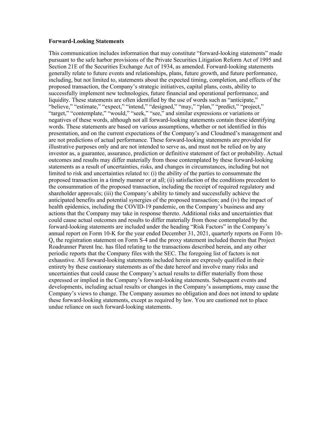 Forward-Looking Statements This communication includes information that may constitute “forward-looking statements” made pursuant to the safe harbor provisions of the Private Securities Litigation Reform Act of 1995 and Section 21E of the Securities Exchange Act of 1934, as amended. Forward-looking statements generally relate to future events and relationships, plans, future growth, and future performance, including, but not limited to, statements about the expected timing, completion, and effects of the proposed transaction, the Company’s strategic initiatives, capital plans, costs, ability to successfully implement new technologies, future financial and operational performance, and liquidity. These statements are often identified by the use of words such as “anticipate,” “believe,” “estimate,” “expect,” “intend,” “designed,” “may,” “plan,” “predict,” “project,” “target,” “contemplate,” “would,” “seek,” “see,” and similar expressions or variations or negatives of these words, although not all forward-looking statements contain these identifying words. These statements are based on various assumptions, whether or not identified in this presentation, and on the current expectations of the Company’s and Cloudmed’s management and are not predictions of actual performance. These forward-looking statements are provided for illustrative purposes only and are not intended to serve as, and must not be relied on by any investor as, a guarantee, assurance, prediction or definitive statement of fact or probability. Actual outcomes and results may differ materially from those contemplated by these forward-looking statements as a result of uncertainties, risks, and changes in circumstances, including but not limited to risk and uncertainties related to: (i) the ability of the parties to consummate the proposed transaction in a timely manner or at all; (ii) satisfaction of the conditions precedent to the consummation of the proposed transaction, including the receipt of required regulatory and shareholder approvals; (iii) the Company’s ability to timely and successfully achieve the anticipated benefits and potential synergies of the proposed transaction; and (iv) the impact of health epidemics, including the COVID-19 pandemic, on the Company’s business and any actions that the Company may take in response thereto. Additional risks and uncertainties that could cause actual outcomes and results to differ materially from those contemplated by the forward-looking statements are included under the heading “Risk Factors” in the Company’s annual report on Form 10-K for the year ended December 31, 2021, quarterly reports on Form 10- Q, the registration statement on Form S-4 and the proxy statement included therein that Project Roadrunner Parent Inc. has filed relating to the transactions described herein, and any other periodic reports that the Company files with the SEC. The foregoing list of factors is not exhaustive. All forward-looking statements included herein are expressly qualified in their entirety by these cautionary statements as of the date hereof and involve many risks and uncertainties that could cause the Company’s actual results to differ materially from those expressed or implied in the Company’s forward-looking statements. Subsequent events and developments, including actual results or changes in the Company’s assumptions, may cause the Company’s views to change. The Company assumes no obligation and does not intend to update these forward-looking statements, except as required by law. You are cautioned not to place undue reliance on such forward-looking statements.