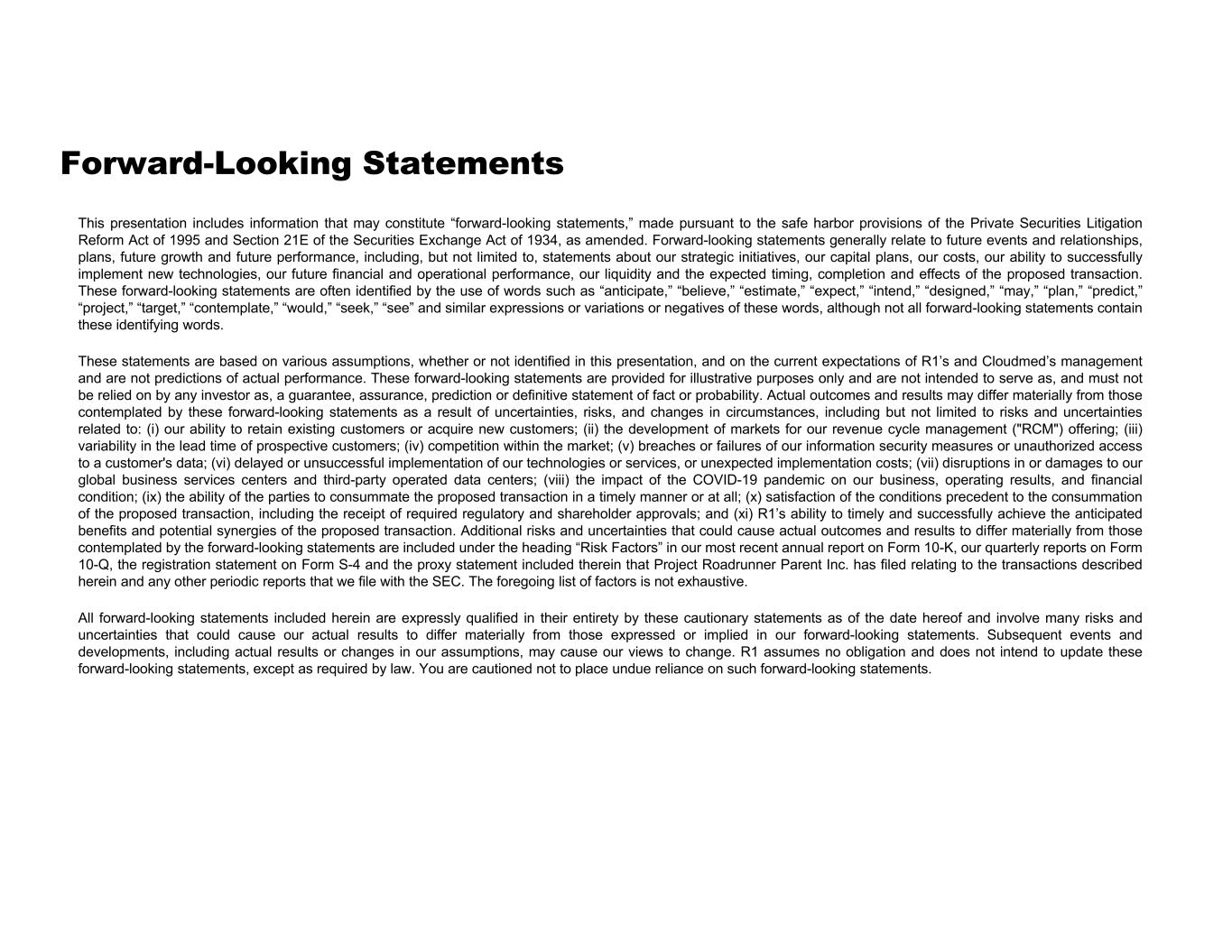 Forward-Looking Statements This presentation includes information that may constitute “forward-looking statements,” made pursuant to the safe harbor provisions of the Private Securities Litigation Reform Act of 1995 and Section 21E of the Securities Exchange Act of 1934, as amended. Forward-looking statements generally relate to future events and relationships, plans, future growth and future performance, including, but not limited to, statements about our strategic initiatives, our capital plans, our costs, our ability to successfully implement new technologies, our future financial and operational performance, our liquidity and the expected timing, completion and effects of the proposed transaction. These forward-looking statements are often identified by the use of words such as “anticipate,” “believe,” “estimate,” “expect,” “intend,” “designed,” “may,” “plan,” “predict,” “project,” “target,” “contemplate,” “would,” “seek,” “see” and similar expressions or variations or negatives of these words, although not all forward-looking statements contain these identifying words. These statements are based on various assumptions, whether or not identified in this presentation, and on the current expectations of R1’s and Cloudmed’s management and are not predictions of actual performance. These forward-looking statements are provided for illustrative purposes only and are not intended to serve as, and must not be relied on by any investor as, a guarantee, assurance, prediction or definitive statement of fact or probability. Actual outcomes and results may differ materially from those contemplated by these forward-looking statements as a result of uncertainties, risks, and changes in circumstances, including but not limited to risks and uncertainties related to: (i) our ability to retain existing customers or acquire new customers; (ii) the development of markets for our revenue cycle management ("RCM") offering; (iii) variability in the lead time of prospective customers; (iv) competition within the market; (v) breaches or failures of our information security measures or unauthorized access to a customer's data; (vi) delayed or unsuccessful implementation of our technologies or services, or unexpected implementation costs; (vii) disruptions in or damages to our global business services centers and third-party operated data centers; (viii) the impact of the COVID-19 pandemic on our business, operating results, and financial condition; (ix) the ability of the parties to consummate the proposed transaction in a timely manner or at all; (x) satisfaction of the conditions precedent to the consummation of the proposed transaction, including the receipt of required regulatory and shareholder approvals; and (xi) R1’s ability to timely and successfully achieve the anticipated benefits and potential synergies of the proposed transaction. Additional risks and uncertainties that could cause actual outcomes and results to differ materially from those contemplated by the forward-looking statements are included under the heading “Risk Factors” in our most recent annual report on Form 10-K, our quarterly reports on Form 10-Q, the registration statement on Form S-4 and the proxy statement included therein that Project Roadrunner Parent Inc. has filed relating to the transactions described herein and any other periodic reports that we file with the SEC. The foregoing list of factors is not exhaustive. All forward-looking statements included herein are expressly qualified in their entirety by these cautionary statements as of the date hereof and involve many risks and uncertainties that could cause our actual results to differ materially from those expressed or implied in our forward-looking statements. Subsequent events and developments, including actual results or changes in our assumptions, may cause our views to change. R1 assumes no obligation and does not intend to update these forward-looking statements, except as required by law. You are cautioned not to place undue reliance on such forward-looking statements.