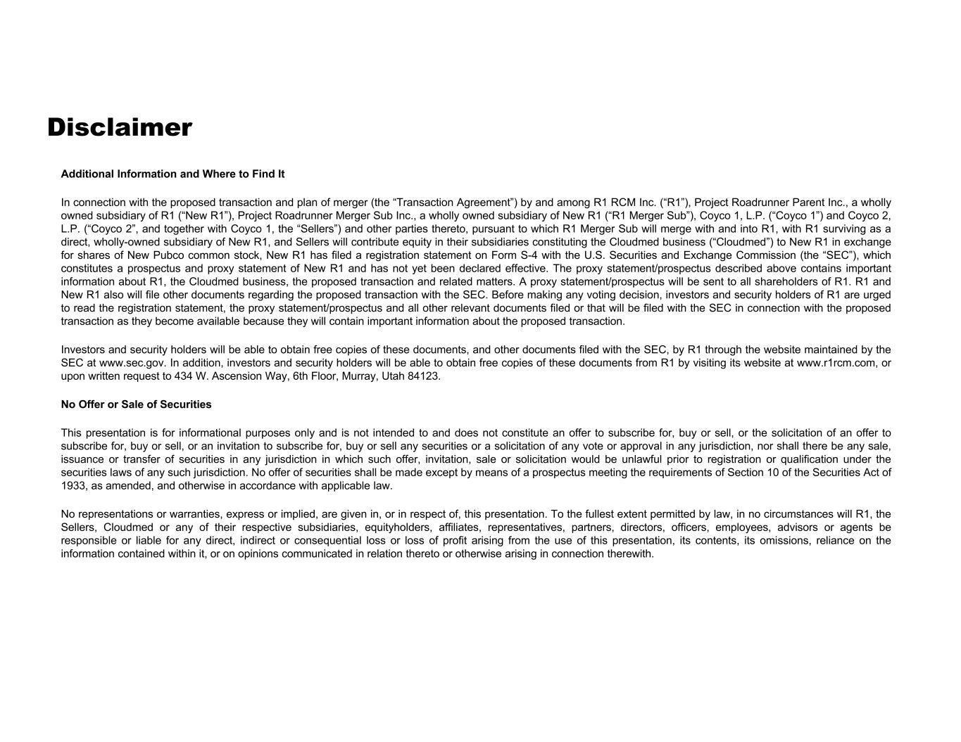 Disclaimer Additional Information and Where to Find It In connection with the proposed transaction and plan of merger (the “Transaction Agreement”) by and among R1 RCM Inc. (“R1”), Project Roadrunner Parent Inc., a wholly owned subsidiary of R1 (“New R1”), Project Roadrunner Merger Sub Inc., a wholly owned subsidiary of New R1 (“R1 Merger Sub”), Coyco 1, L.P. (“Coyco 1”) and Coyco 2, L.P. (“Coyco 2”, and together with Coyco 1, the “Sellers”) and other parties thereto, pursuant to which R1 Merger Sub will merge with and into R1, with R1 surviving as a direct, wholly-owned subsidiary of New R1, and Sellers will contribute equity in their subsidiaries constituting the Cloudmed business (“Cloudmed”) to New R1 in exchange for shares of New Pubco common stock, New R1 has filed a registration statement on Form S-4 with the U.S. Securities and Exchange Commission (the “SEC”), which constitutes a prospectus and proxy statement of New R1 and has not yet been declared effective. The proxy statement/prospectus described above contains important information about R1, the Cloudmed business, the proposed transaction and related matters. A proxy statement/prospectus will be sent to all shareholders of R1. R1 and New R1 also will file other documents regarding the proposed transaction with the SEC. Before making any voting decision, investors and security holders of R1 are urged to read the registration statement, the proxy statement/prospectus and all other relevant documents filed or that will be filed with the SEC in connection with the proposed transaction as they become available because they will contain important information about the proposed transaction. Investors and security holders will be able to obtain free copies of these documents, and other documents filed with the SEC, by R1 through the website maintained by the SEC at www.sec.gov. In addition, investors and security holders will be able to obtain free copies of these documents from R1 by visiting its website at www.r1rcm.com, or upon written request to 434 W. Ascension Way, 6th Floor, Murray, Utah 84123. No Offer or Sale of Securities This presentation is for informational purposes only and is not intended to and does not constitute an offer to subscribe for, buy or sell, or the solicitation of an offer to subscribe for, buy or sell, or an invitation to subscribe for, buy or sell any securities or a solicitation of any vote or approval in any jurisdiction, nor shall there be any sale, issuance or transfer of securities in any jurisdiction in which such offer, invitation, sale or solicitation would be unlawful prior to registration or qualification under the securities laws of any such jurisdiction. No offer of securities shall be made except by means of a prospectus meeting the requirements of Section 10 of the Securities Act of 1933, as amended, and otherwise in accordance with applicable law. No representations or warranties, express or implied, are given in, or in respect of, this presentation. To the fullest extent permitted by law, in no circumstances will R1, the Sellers, Cloudmed or any of their respective subsidiaries, equityholders, affiliates, representatives, partners, directors, officers, employees, advisors or agents be responsible or liable for any direct, indirect or consequential loss or loss of profit arising from the use of this presentation, its contents, its omissions, reliance on the information contained within it, or on opinions communicated in relation thereto or otherwise arising in connection therewith.