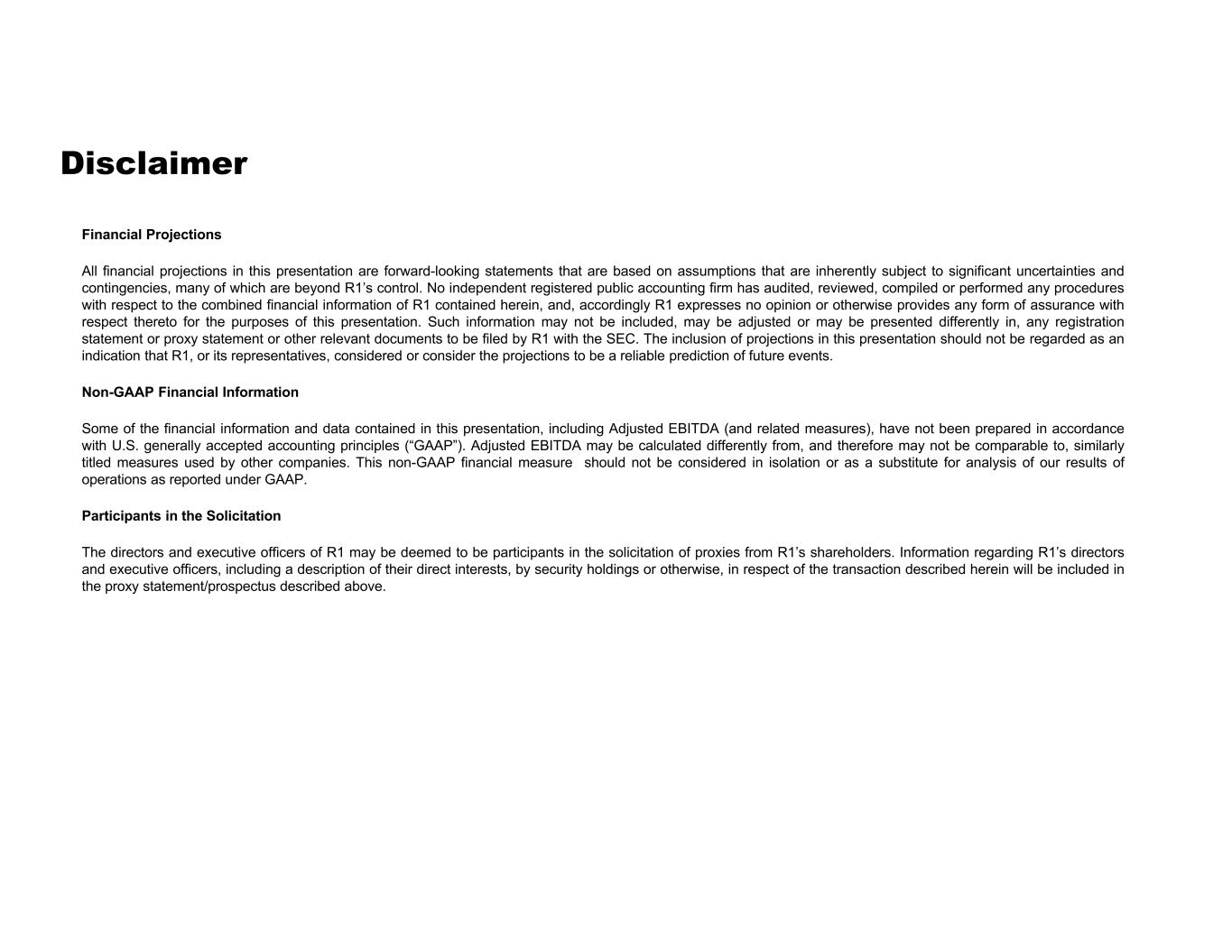 Disclaimer Financial Projections All financial projections in this presentation are forward-looking statements that are based on assumptions that are inherently subject to significant uncertainties and contingencies, many of which are beyond R1’s control. No independent registered public accounting firm has audited, reviewed, compiled or performed any procedures with respect to the combined financial information of R1 contained herein, and, accordingly R1 expresses no opinion or otherwise provides any form of assurance with respect thereto for the purposes of this presentation. Such information may not be included, may be adjusted or may be presented differently in, any registration statement or proxy statement or other relevant documents to be filed by R1 with the SEC. The inclusion of projections in this presentation should not be regarded as an indication that R1, or its representatives, considered or consider the projections to be a reliable prediction of future events. Non-GAAP Financial Information Some of the financial information and data contained in this presentation, including Adjusted EBITDA (and related measures), have not been prepared in accordance with U.S. generally accepted accounting principles (“GAAP”). Adjusted EBITDA may be calculated differently from, and therefore may not be comparable to, similarly titled measures used by other companies. This non-GAAP financial measure should not be considered in isolation or as a substitute for analysis of our results of operations as reported under GAAP. Participants in the Solicitation The directors and executive officers of R1 may be deemed to be participants in the solicitation of proxies from R1’s shareholders. Information regarding R1’s directors and executive officers, including a description of their direct interests, by security holdings or otherwise, in respect of the transaction described herein will be included in the proxy statement/prospectus described above.