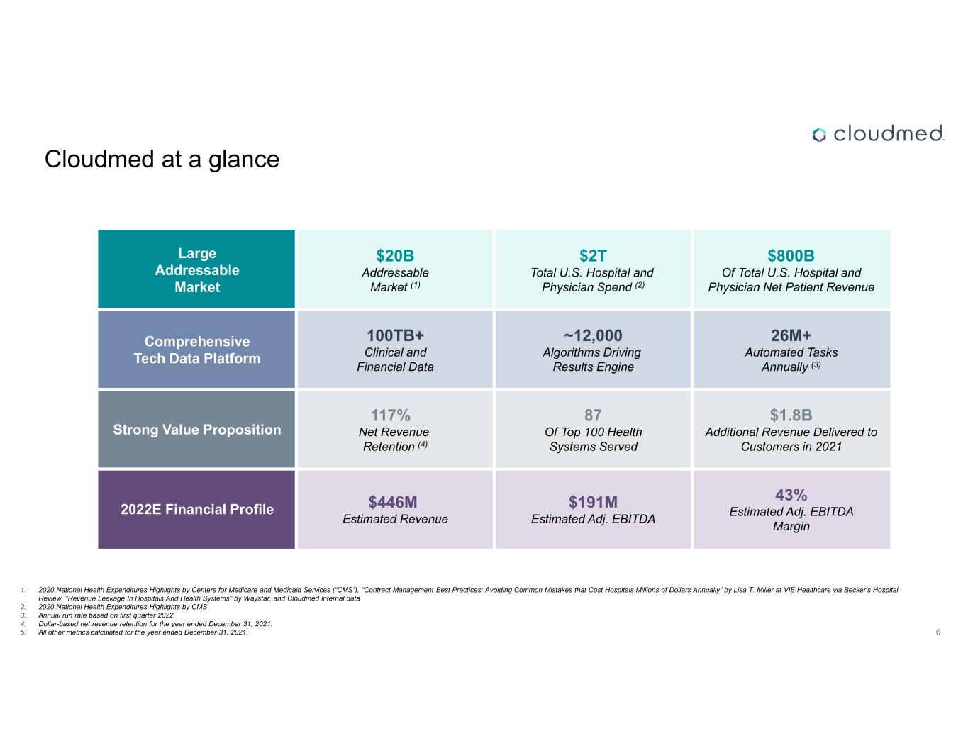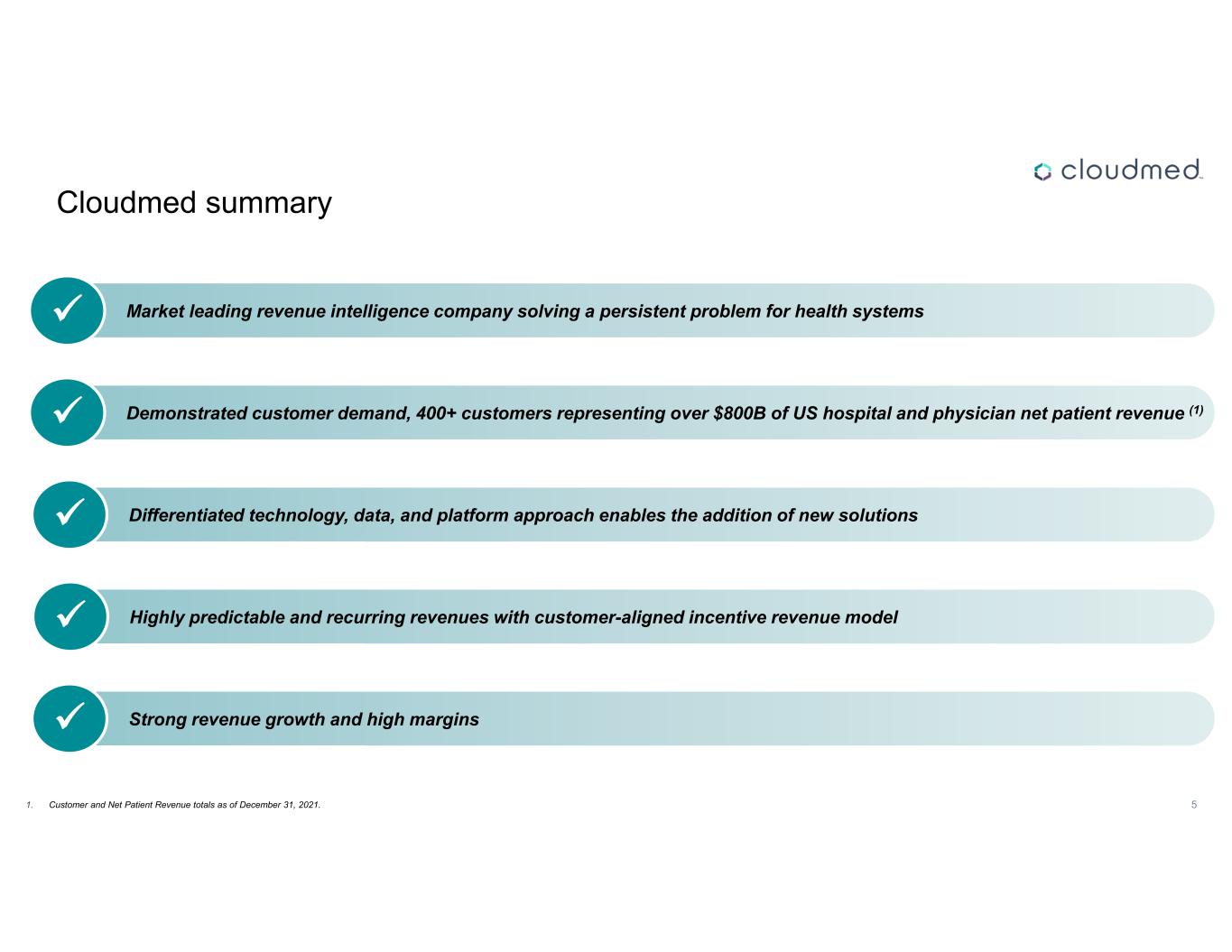 Cloudmed summary Market leading revenue intelligence company solving a persistent problem for health systems Demonstrated customer demand, 400+ customers representing over $800B of US hospital and physician net patient revenue (1) Differentiated technology, data, and platform approach enables the addition of new solutions Highly predictable and recurring revenues with customer-aligned incentive revenue model Strong revenue growth and high margins 51. Customer and Net Patient Revenue totals as of December 31, 2021.