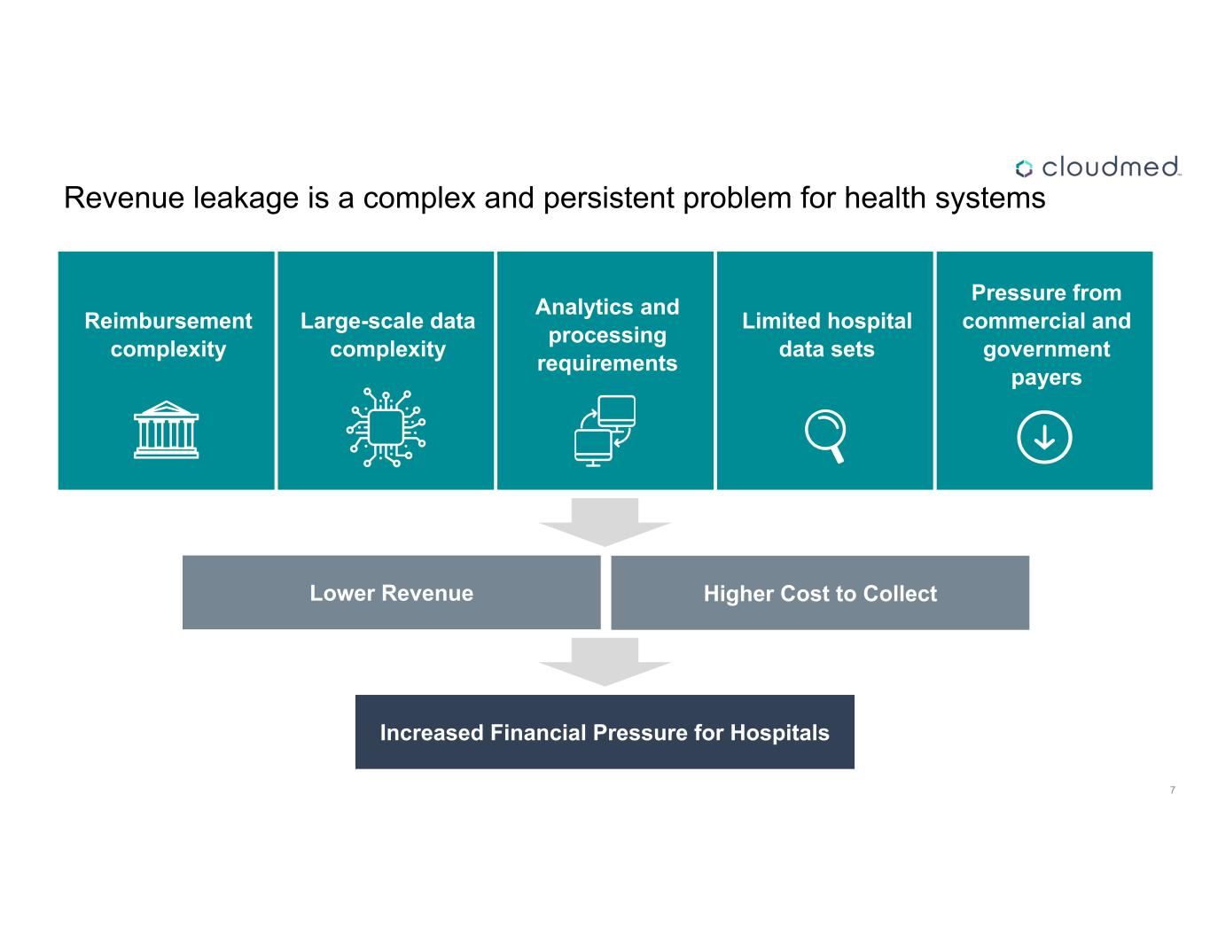 Cloudmed at a glance 1. 2020 National Health Expenditures Highlights by Centers for Medicare and Medicaid Services (“CMS”), “Contract Management Best Practices: Avoiding Common Mistakes that Cost Hospitals Millions of Dollars Annually” by Lisa T. Miller at VIE Healthcare via Becker’s Hospital Review, “Revenue Leakage In Hospitals And Health Systems” by Waystar, and Cloudmed internal data 2. 2020 National Health Expenditures Highlights by CMS 3. Annual run rate based on first quarter 2022. 4. Dollar-based net revenue retention for the year ended December 31, 2021. 5. All other metrics calculated for the year ended December 31, 2021. Large Addressable Market $20B Addressable Market (1) $2T Total U.S. Hospital and Physician Spend (2) $800B Of Total U.S. Hospital and Physician Net Patient Revenue Comprehensive Tech Data Platform 100TB+ Clinical and Financial Data ~12,000 Algorithms Driving Results Engine 26M+ Automated Tasks Annually (3) Strong Value Proposition 117% Net Revenue Retention (4) 87 Of Top 100 Health Systems Served $1.8B Additional Revenue Delivered to Customers in 2021 2022E Financial Profile $446M Estimated Revenue $191M Estimated Adj. EBITDA 43% Estimated Adj. EBITDA Margin 6